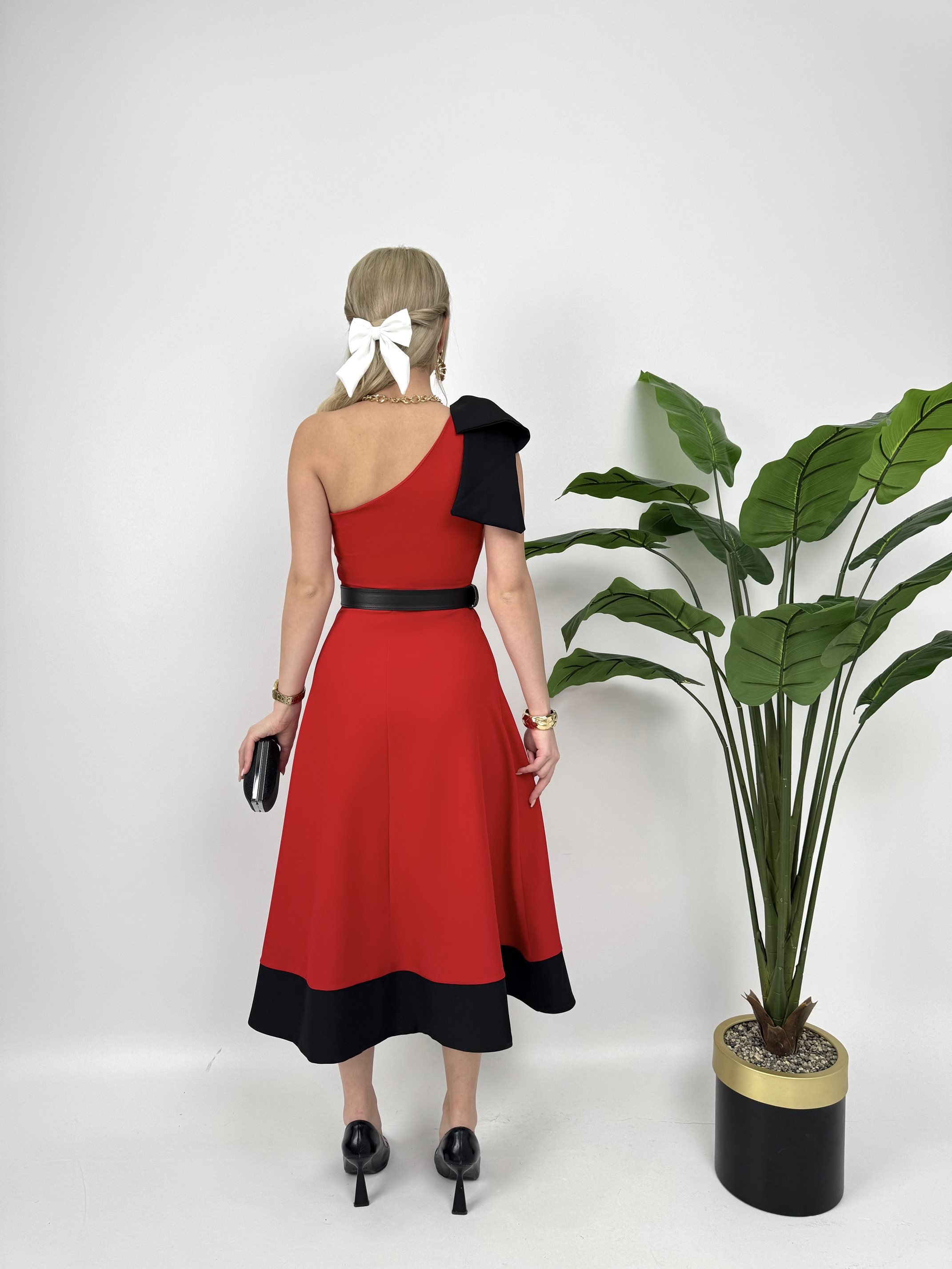 2040 TEK OMUZ FİYONKLU KEMERLİ ELBİSE RED - KIRMIZI
