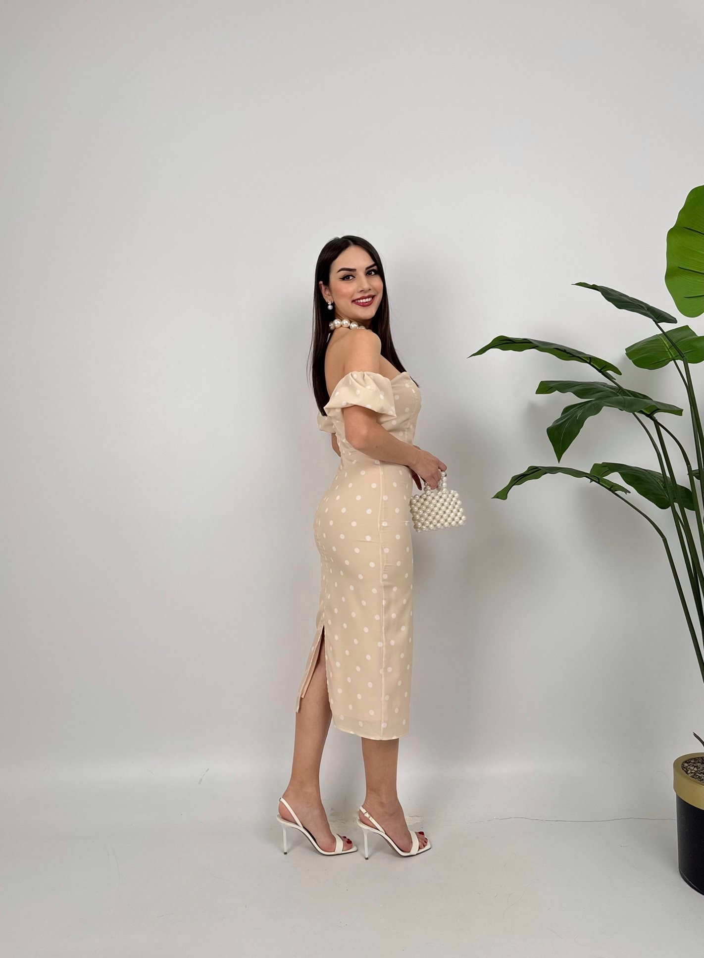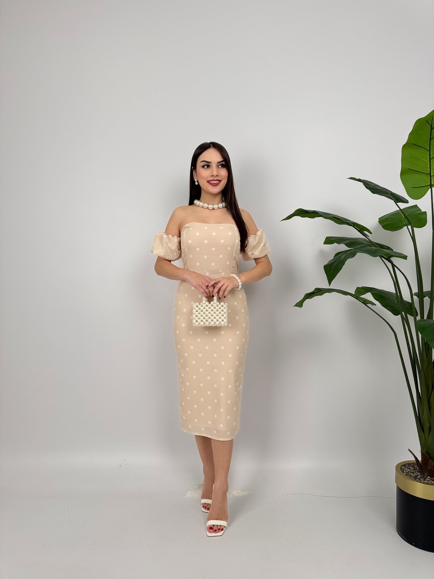2076 PUANTİYE DESEN BALON KOL KREP ELBİSE
