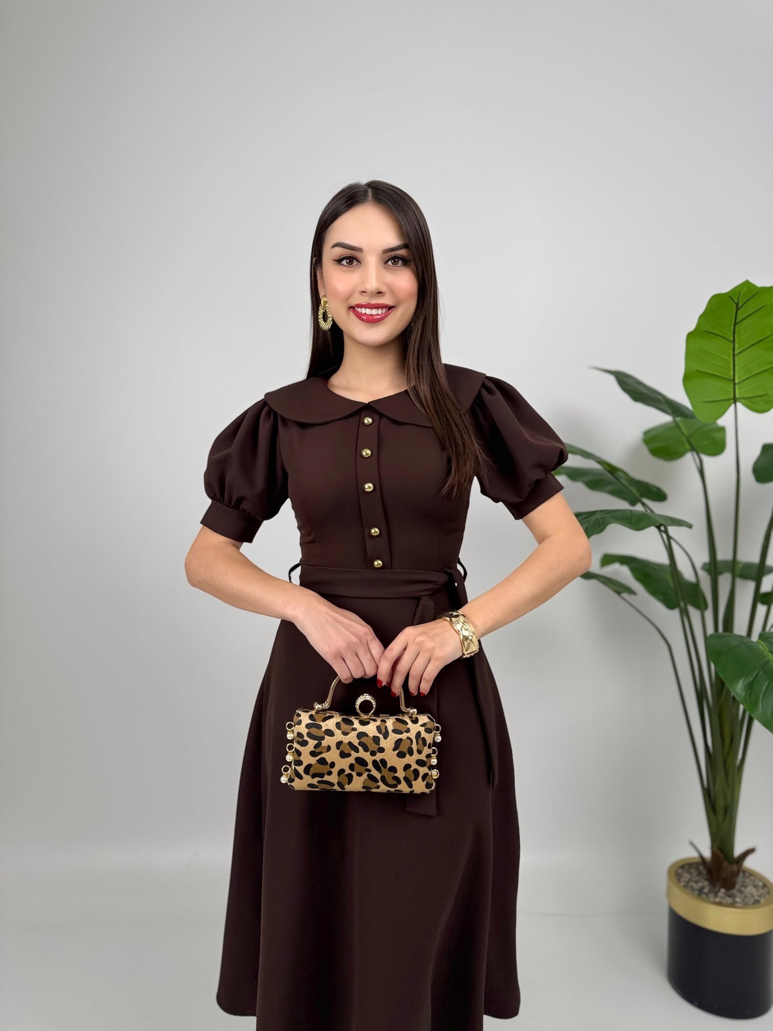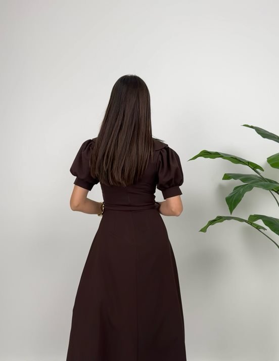 2111 BEBE YAKA KUŞAKLI MİDİ ELBİSE BROWN - KAHVE