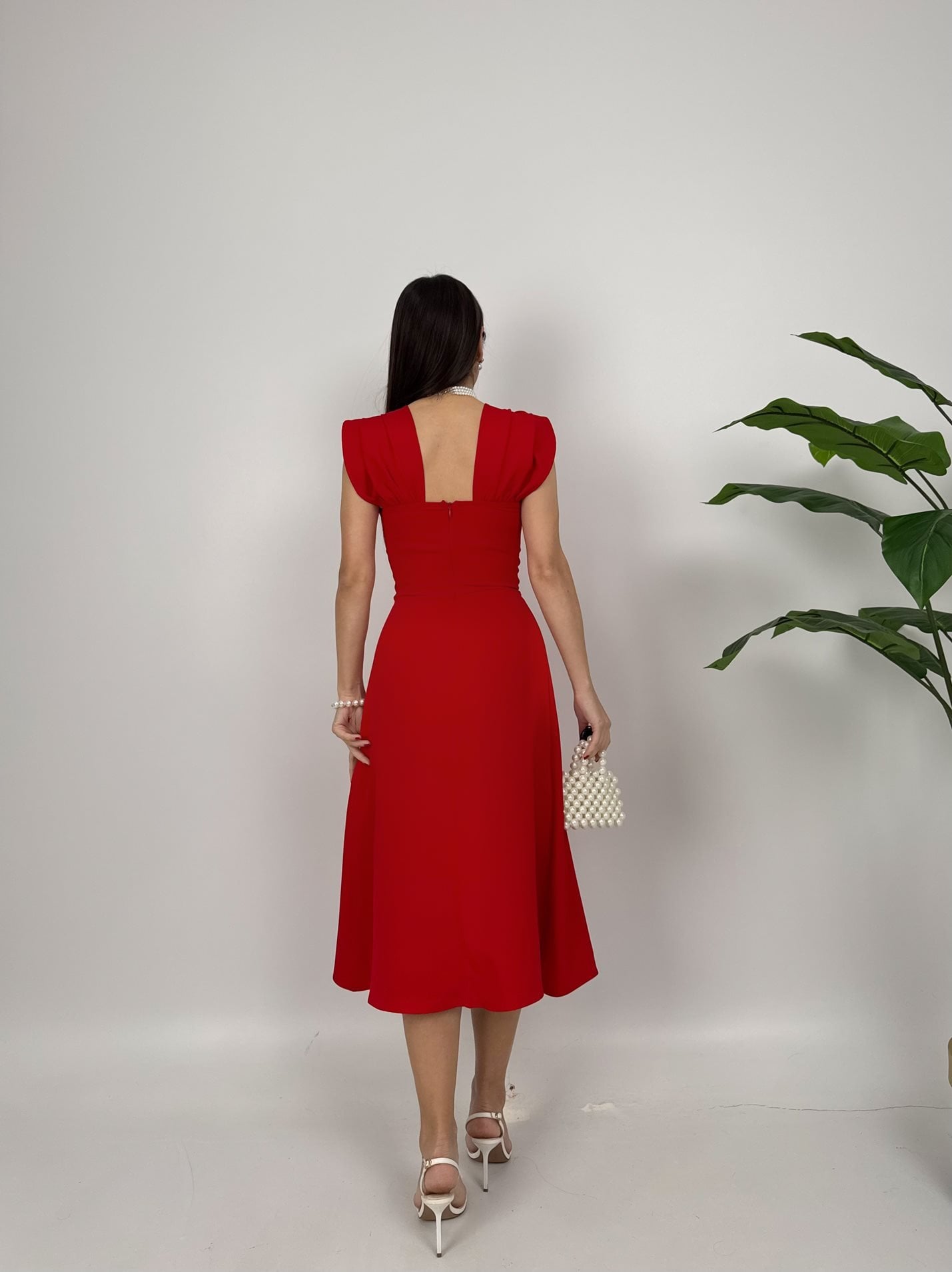 2117 GÖĞÜSÜ ŞERİT İNCİ DETAY ELBİSE RED - KIRMIZI