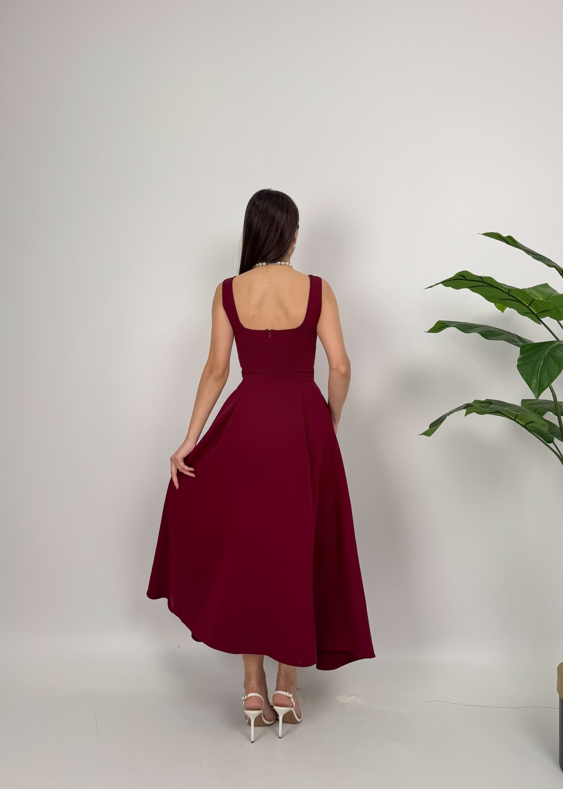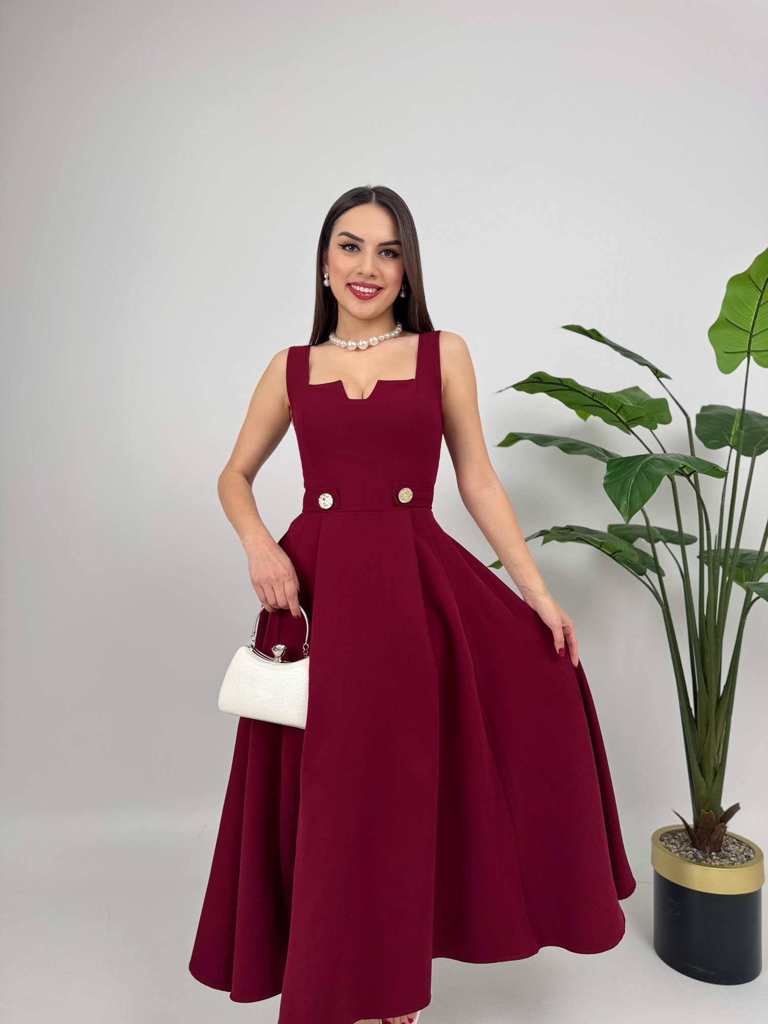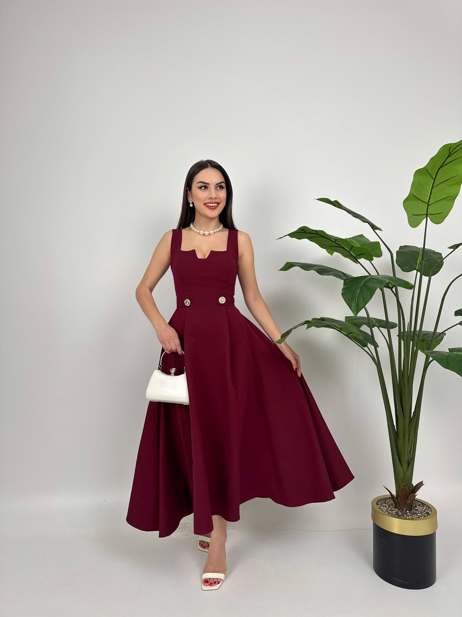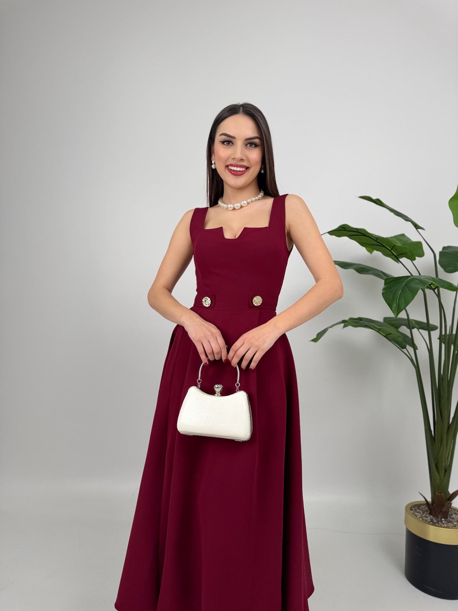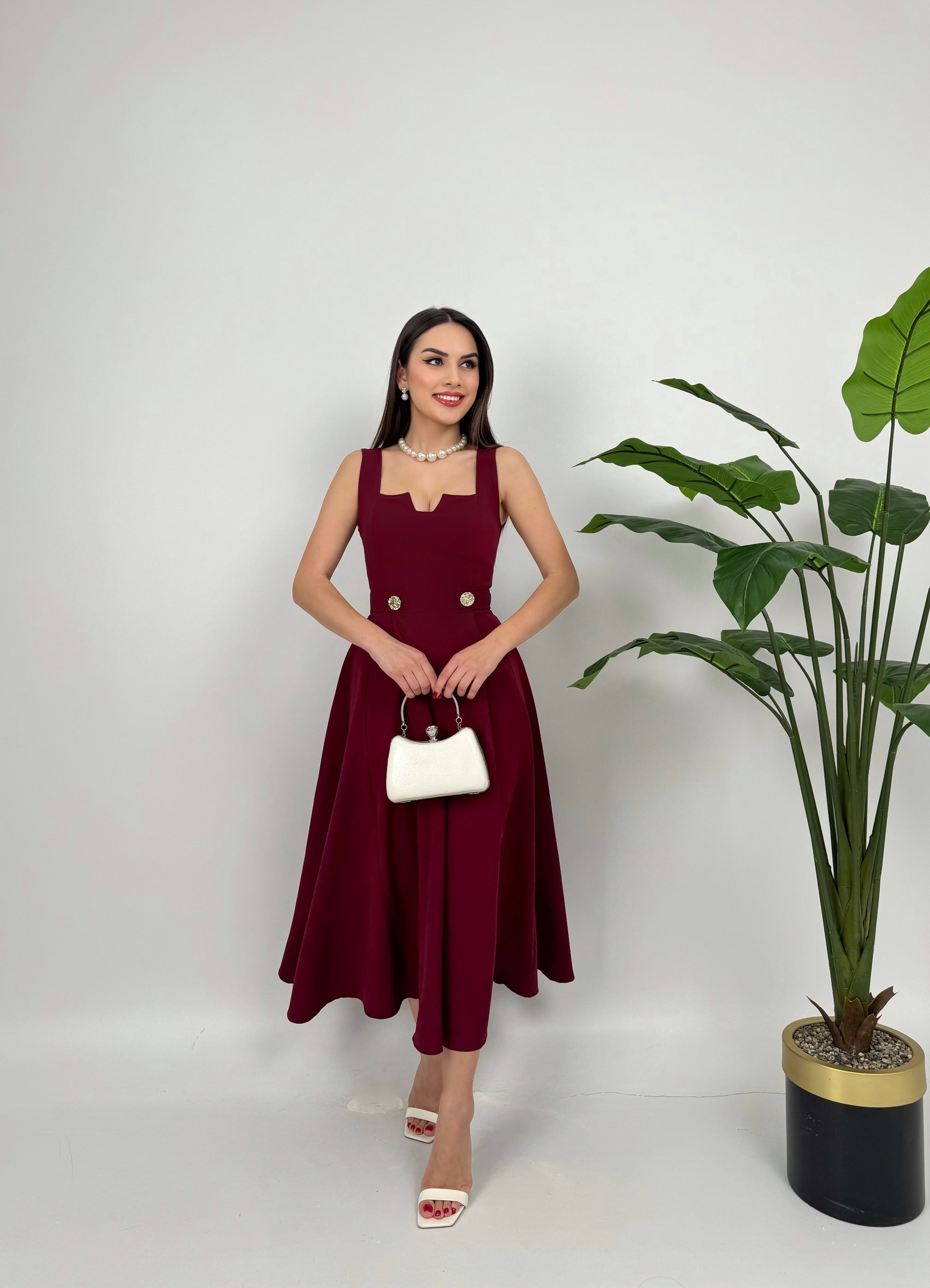 3023 KEMERİ DÜĞMELİ ELBİSE BURGUNDY - BORDO