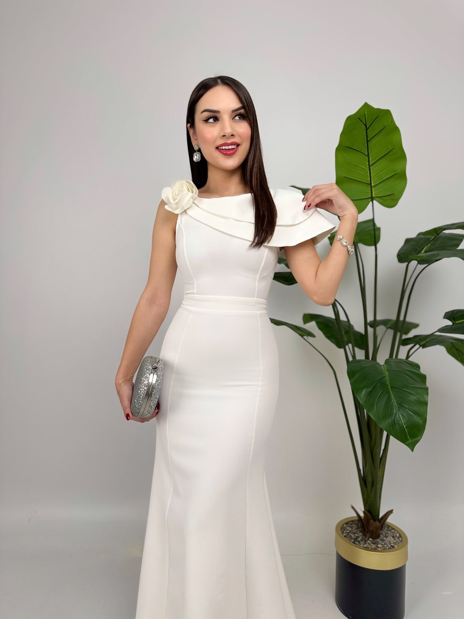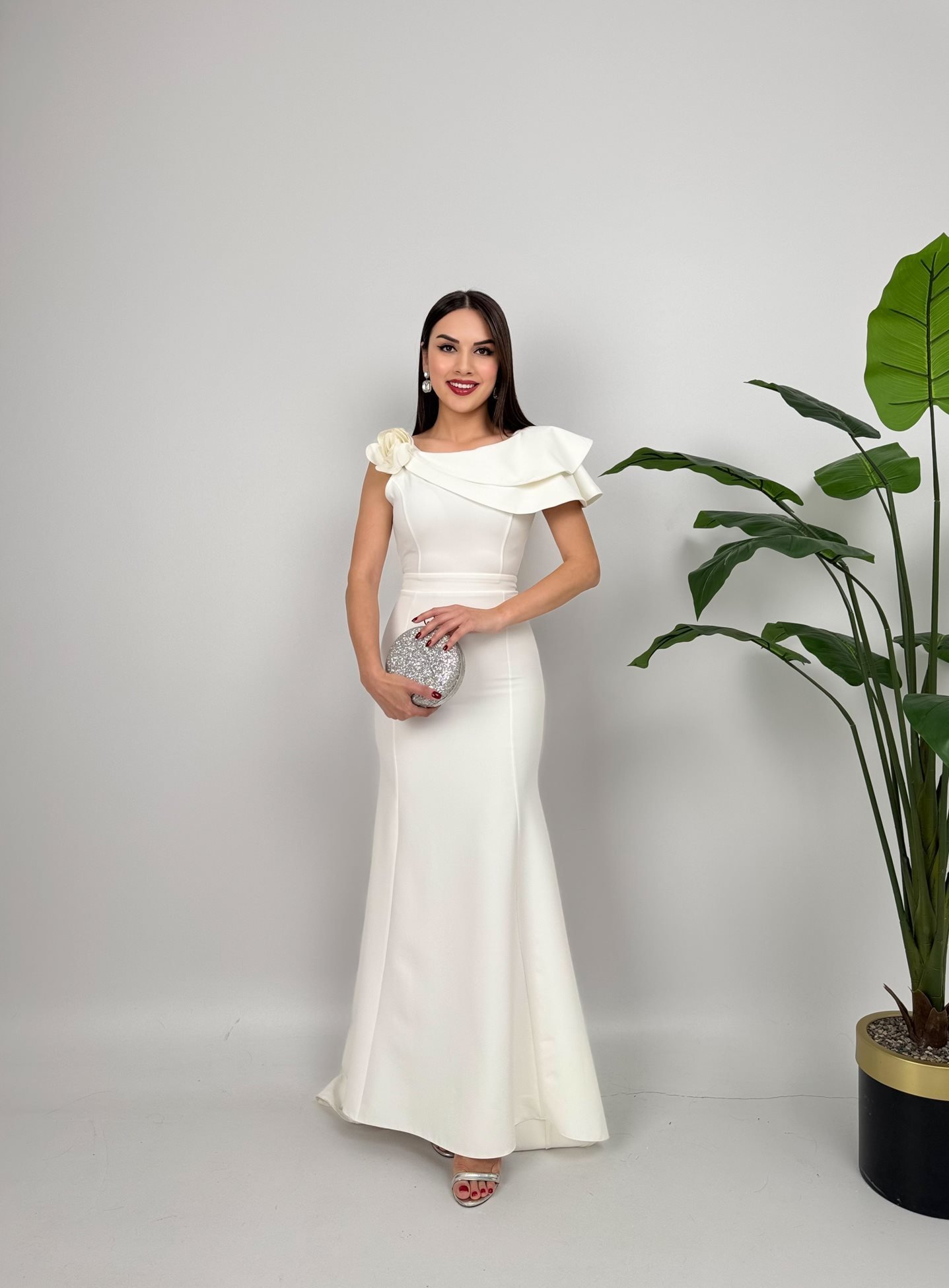 3025 OMUZ FIRFIRLI GÜLLÜ ELBİSE WHİTE - BEYAZ