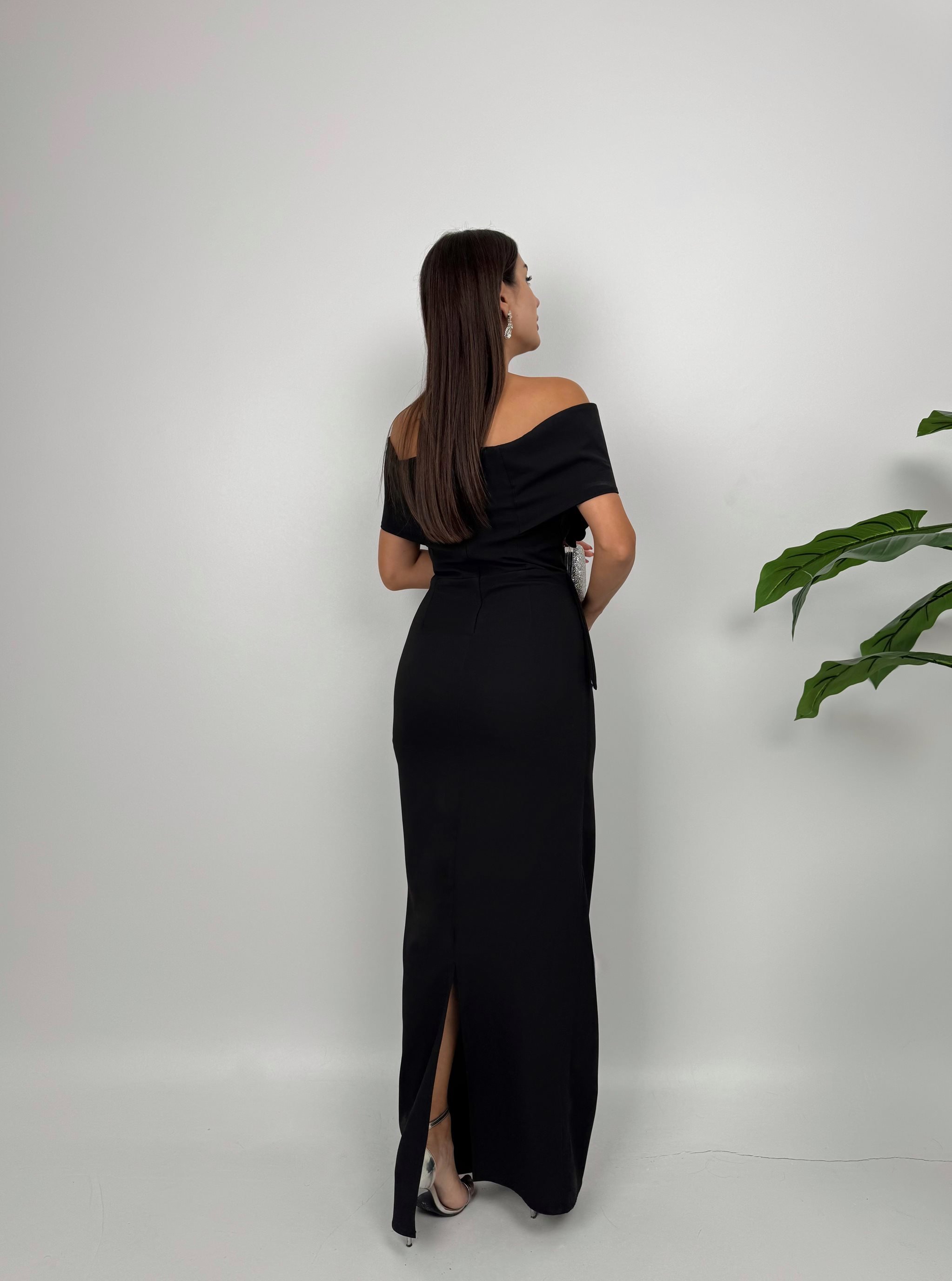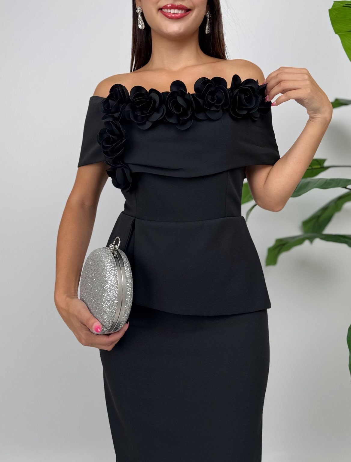3044 KAYIK YAKA GÜLLÜ ELBİSE BLACK - SİYAH