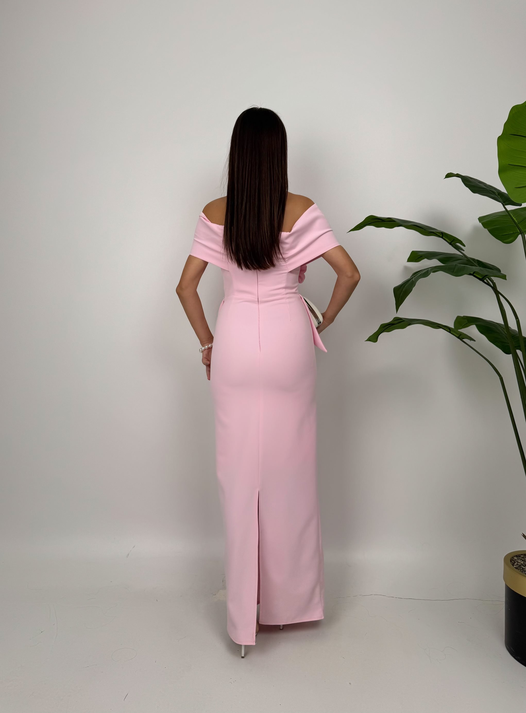 3044 KAYIK YAKA GÜLLÜ ELBİSE PİNK - PEMBE