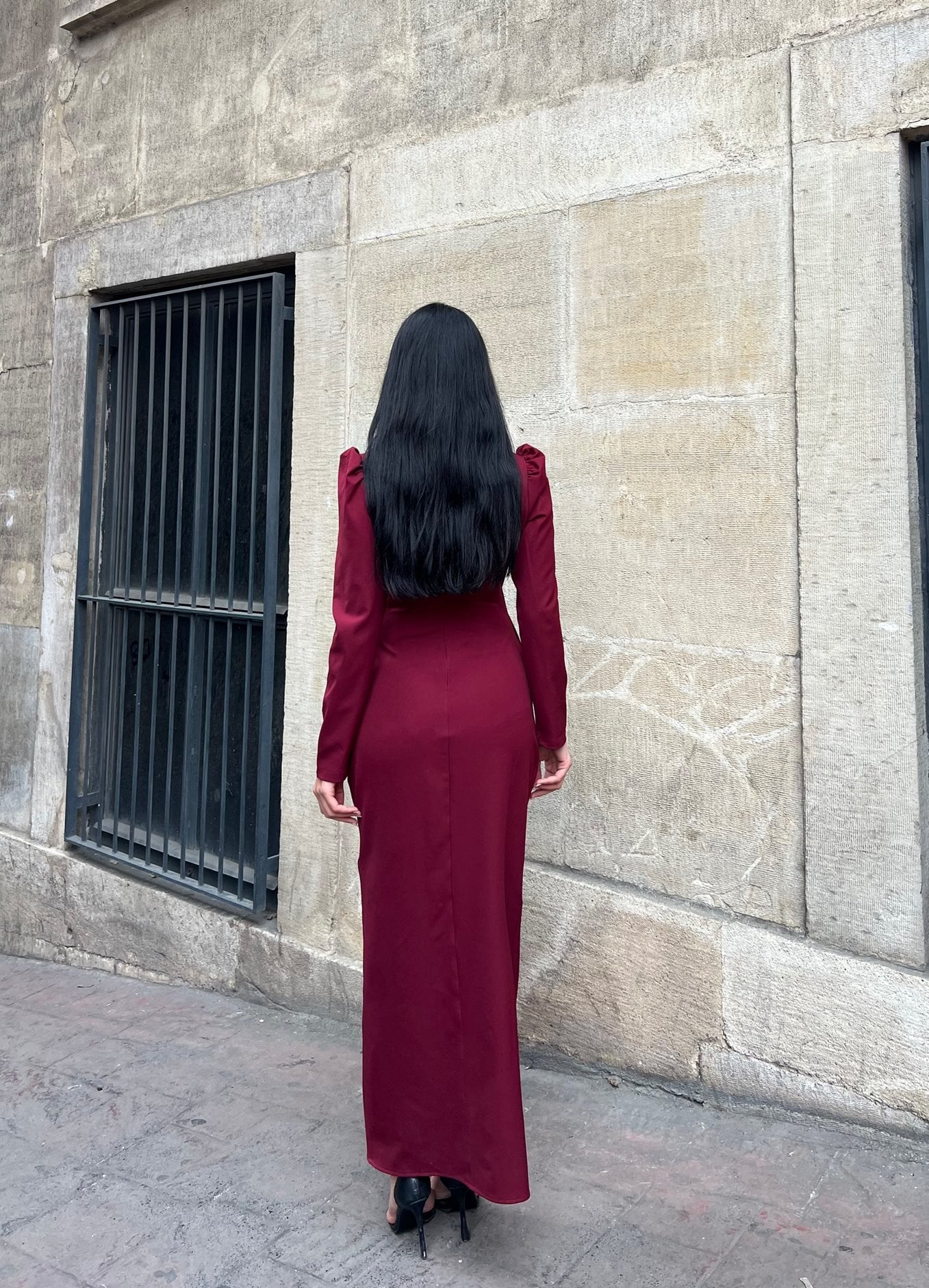 3057 V YAKA AKSESUARLI ELBİSE BURGUNDY - BORDO