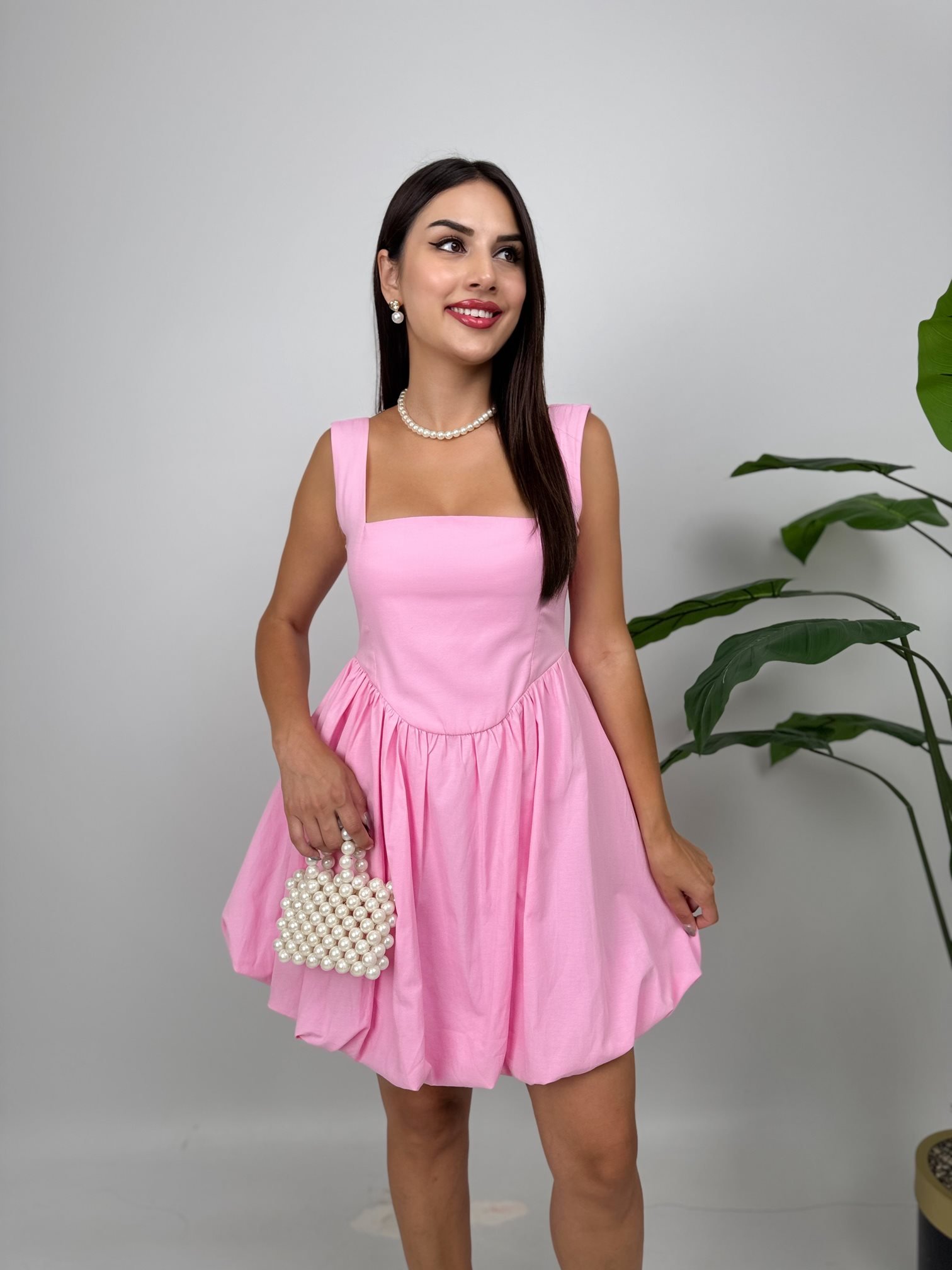 4003 TERİKOTON GİPELİ BALON ELBİSE PİNK - PEMBE