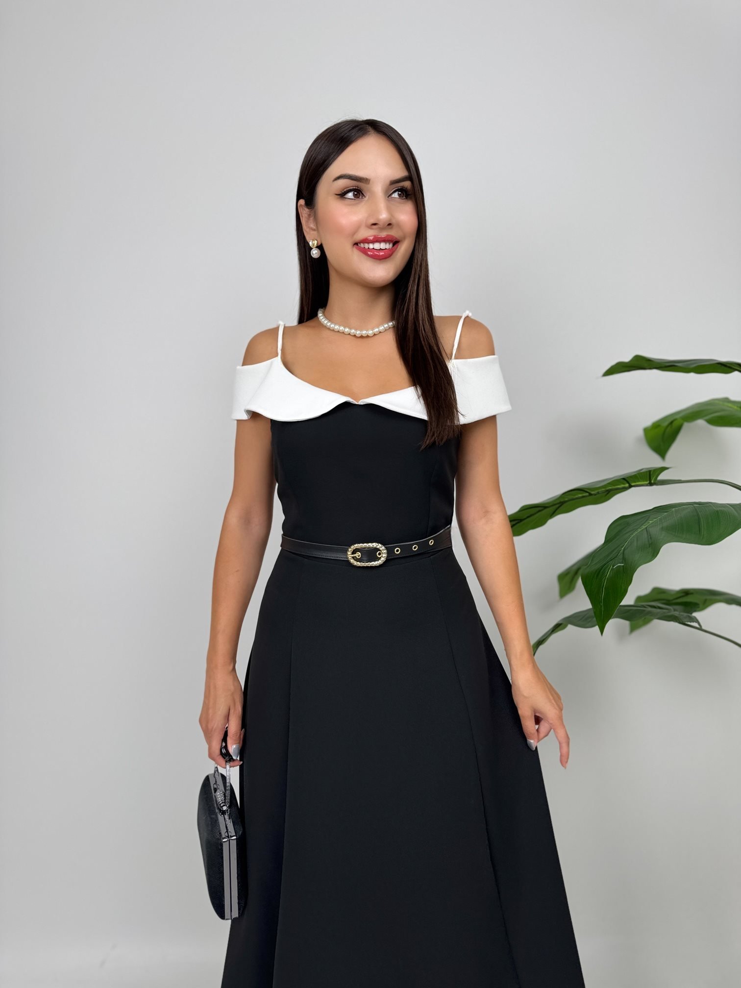 4012 ASKILI GÖGÜS ALERLİ KEMER DETAYLI ELBİSE BLACK - SİYAH