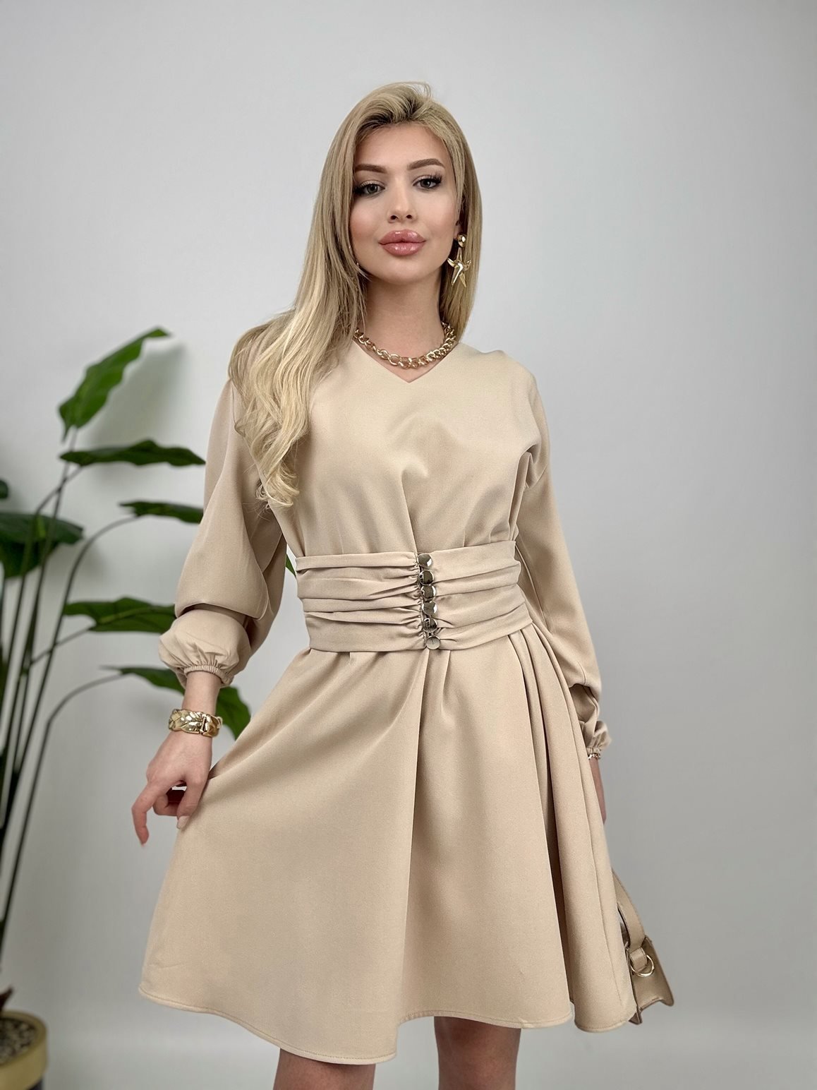 1003 OMUZ PİLE KUŞAKLI ELBİSE STONE - TAŞ