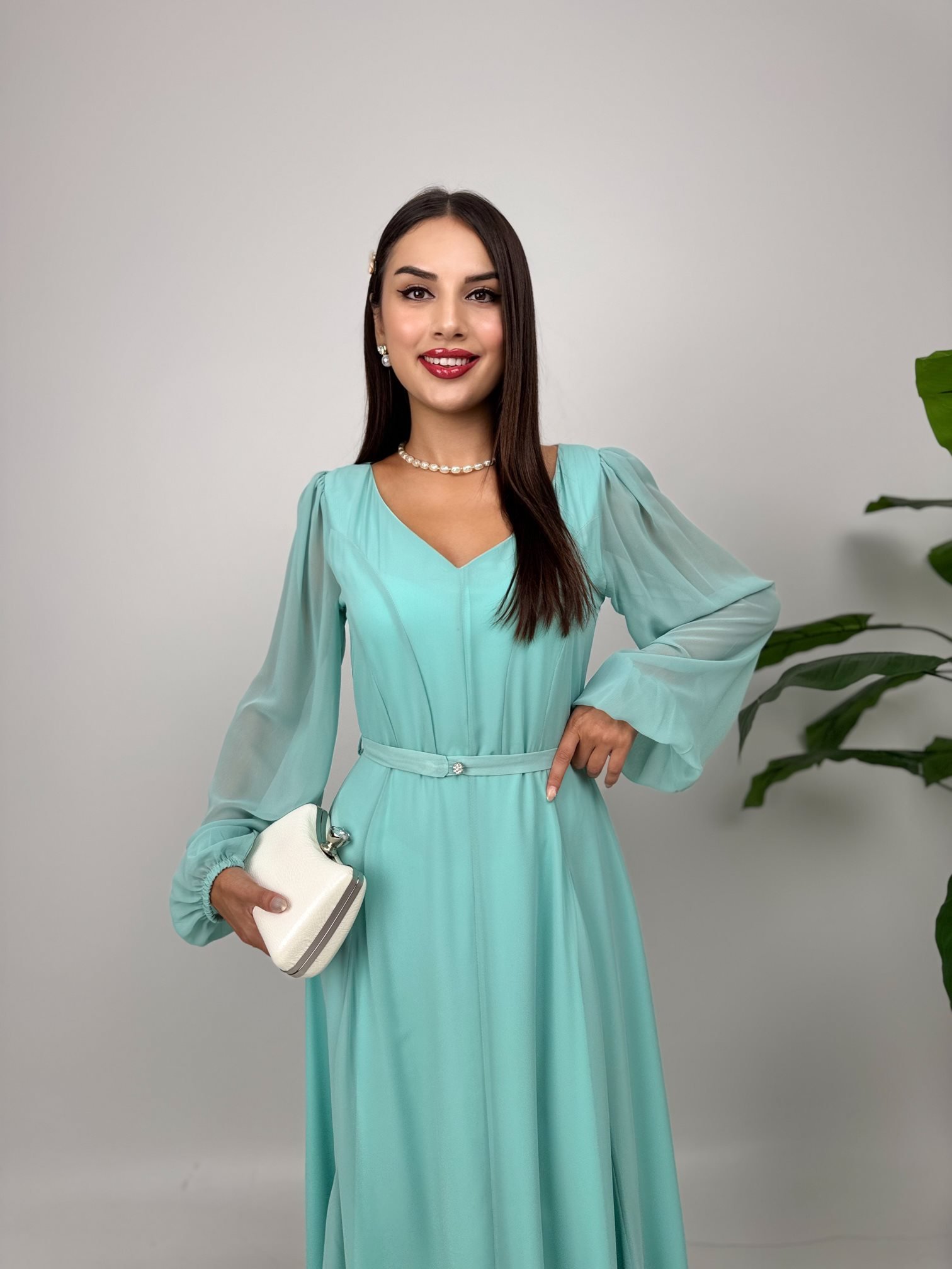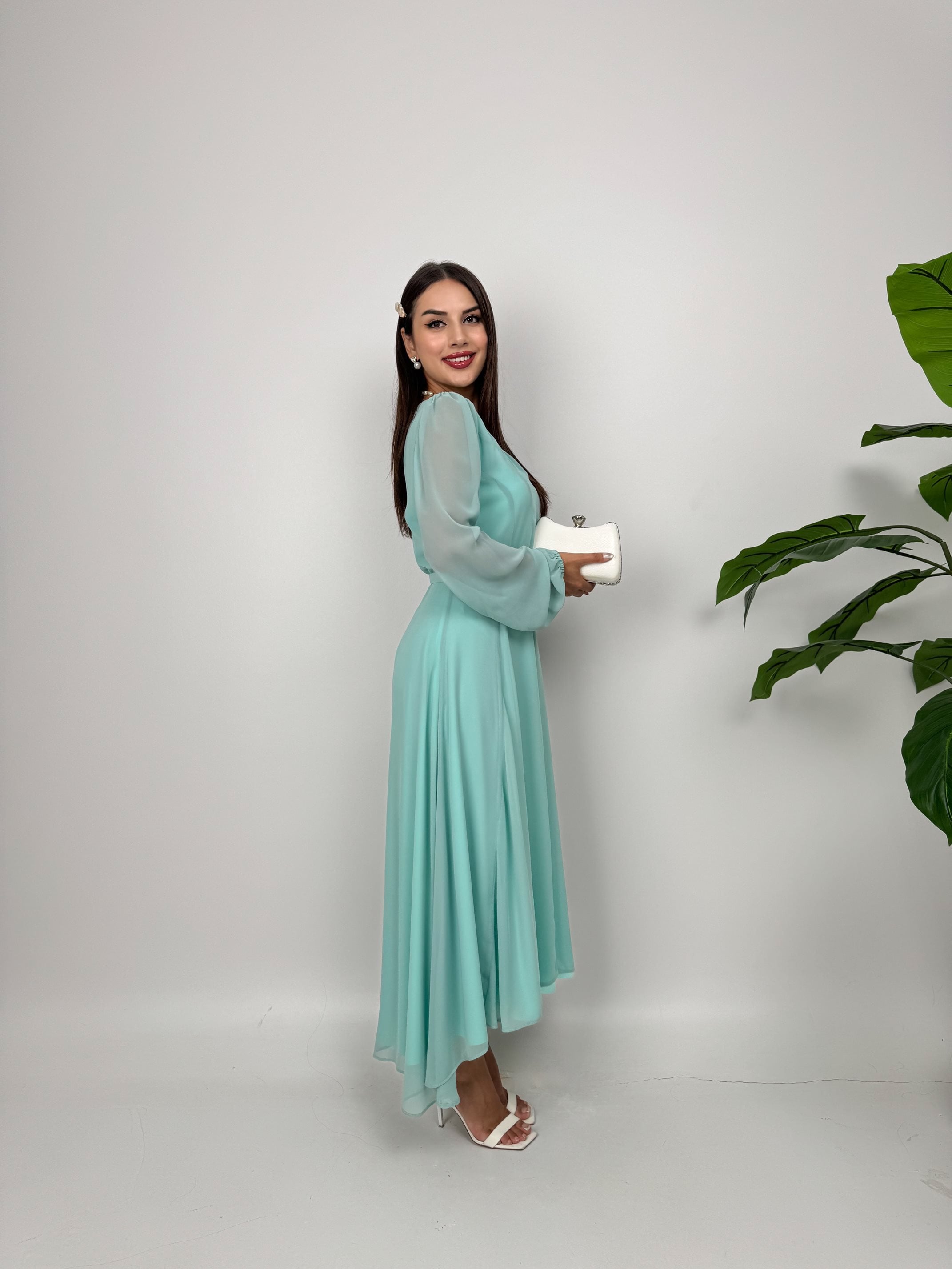1032 ŞİFON V YAKA ELBİSE MİNT
