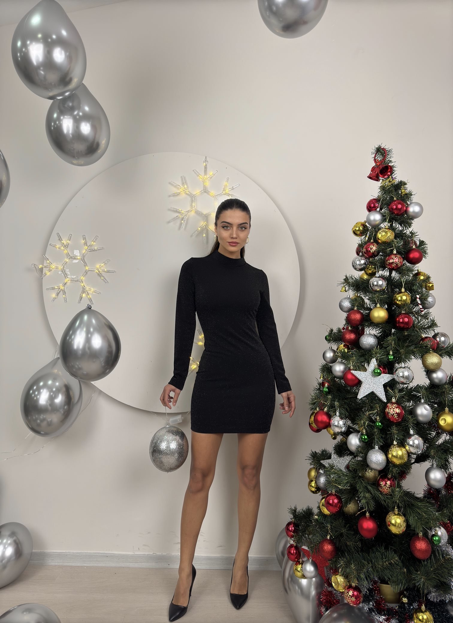 1087 SİMLİ BALIKÇI YAKA ELBİSE BLACK - SİYAH