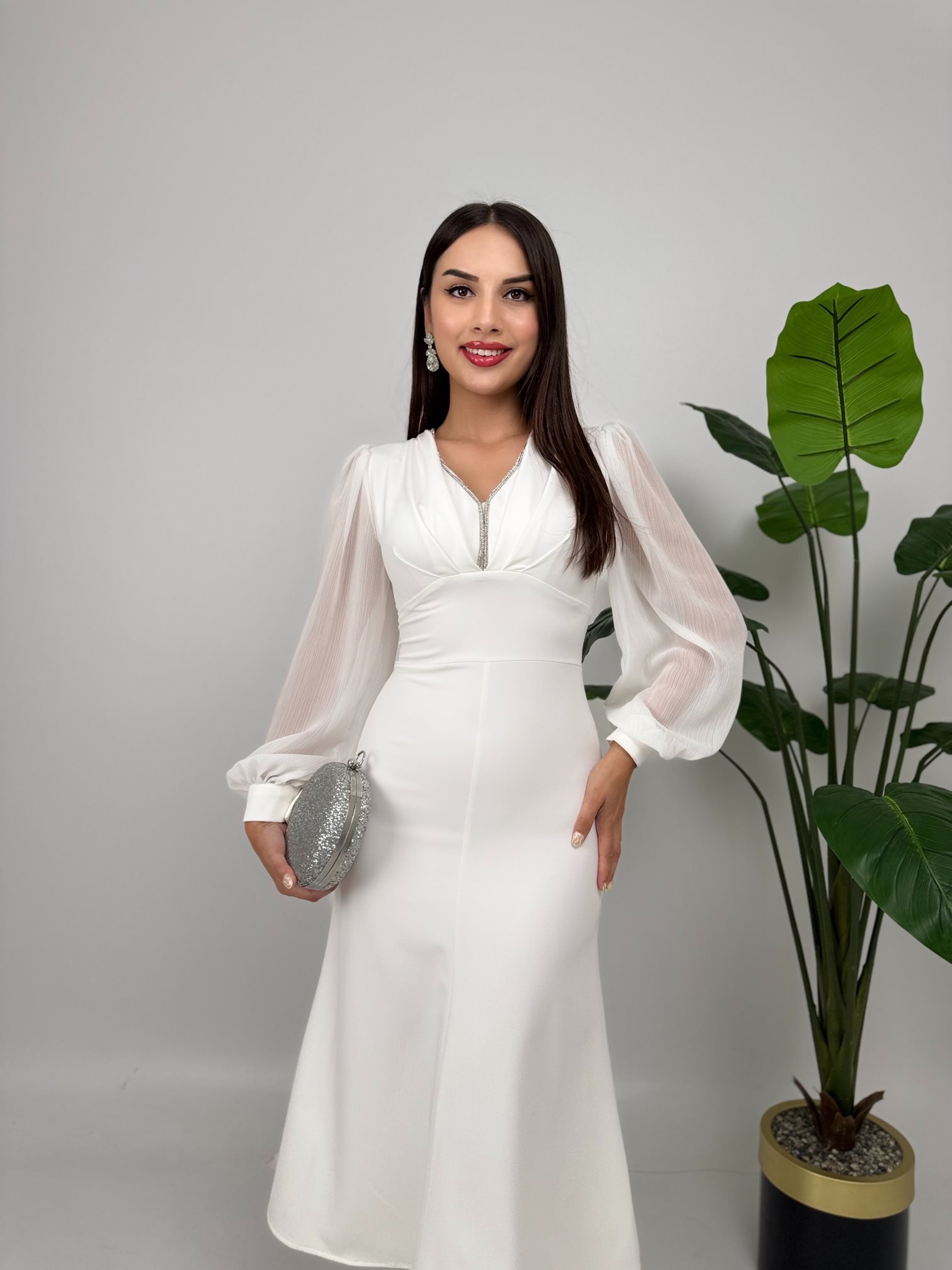 2060 KOLLAR ŞİFON ATLAS ELBİSE WHİTE - BEYAZ