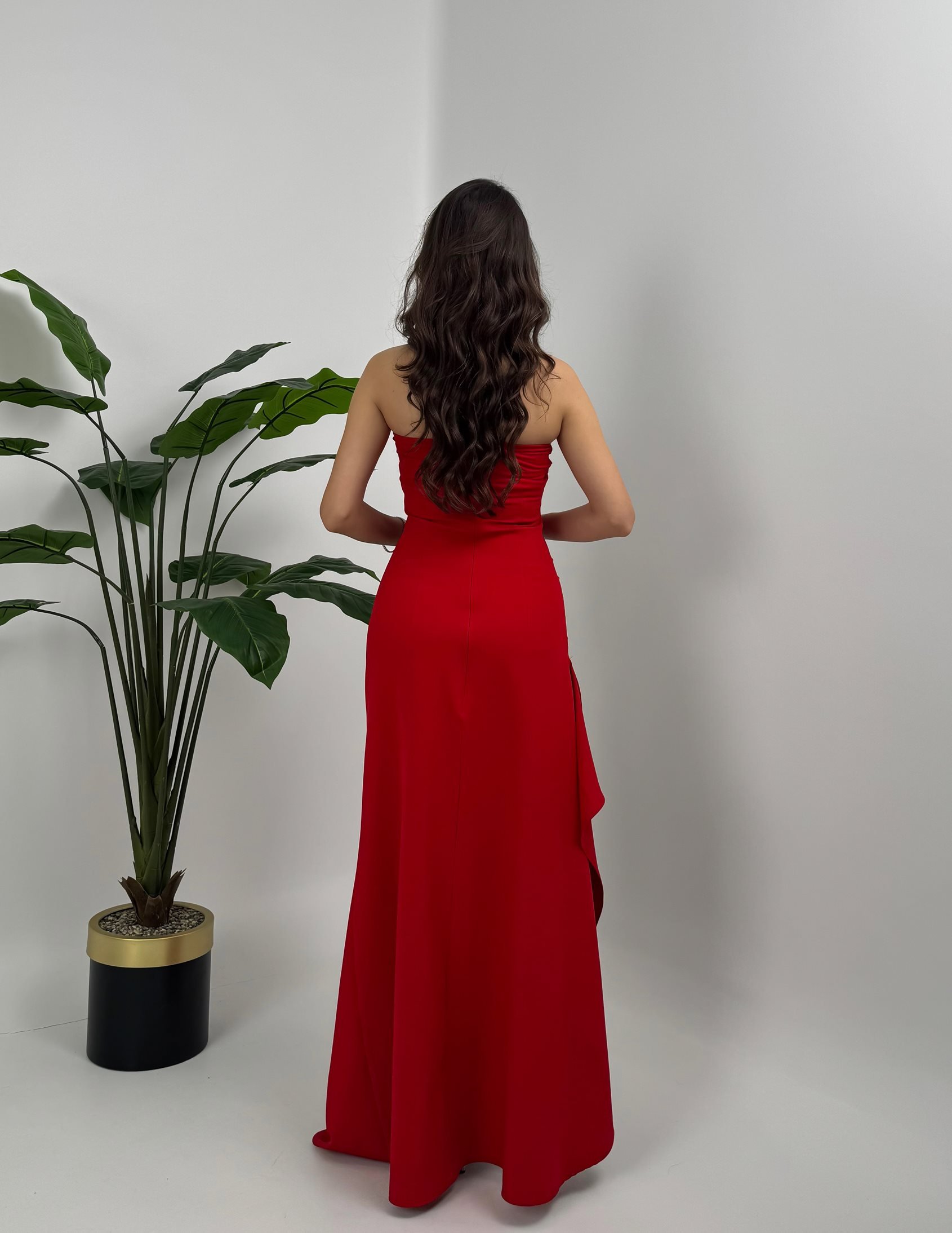 2099 YIRTMAÇLI STRAPLEZ ATLAS ELBİSE RED - KIRMIZI
