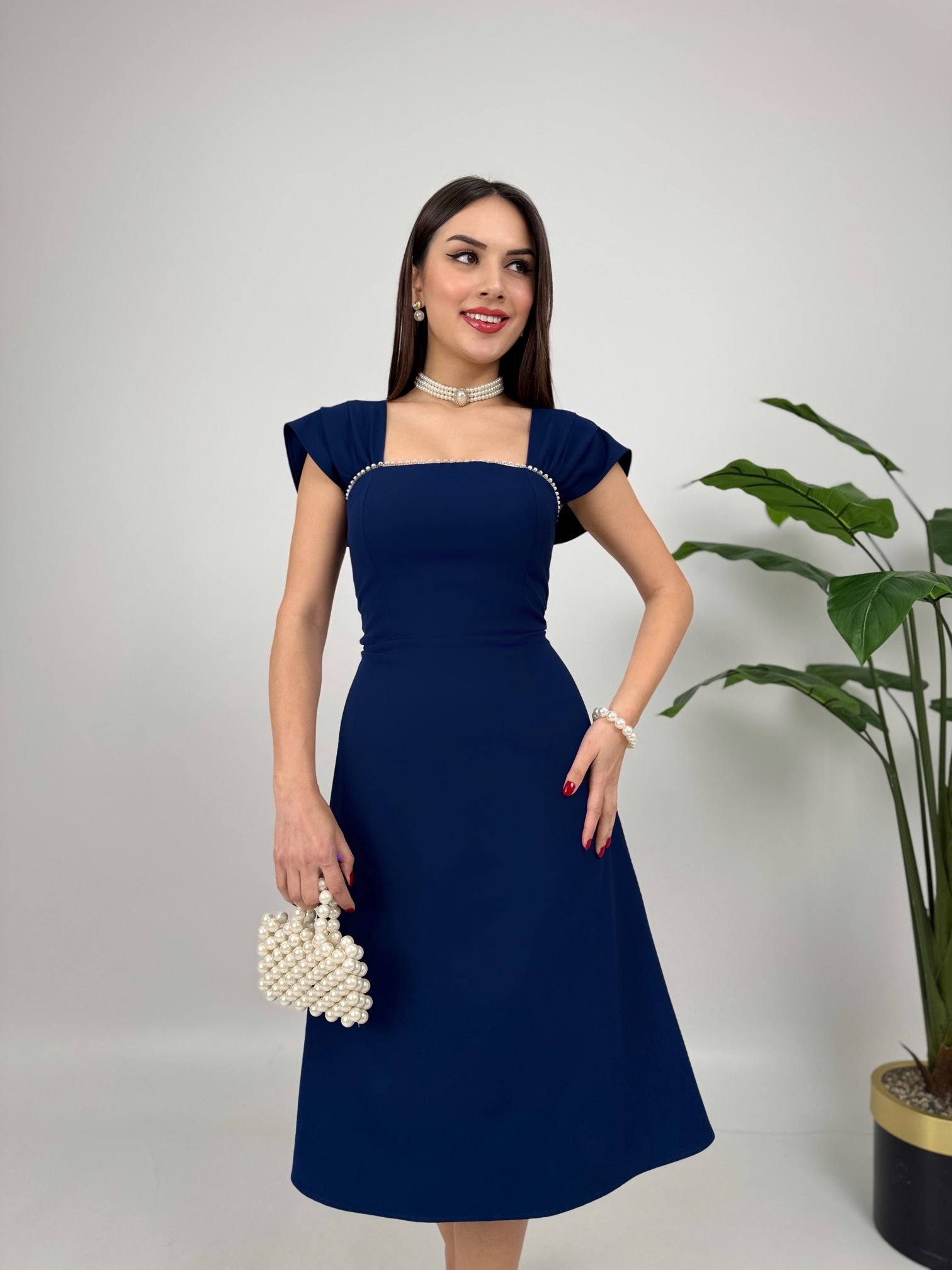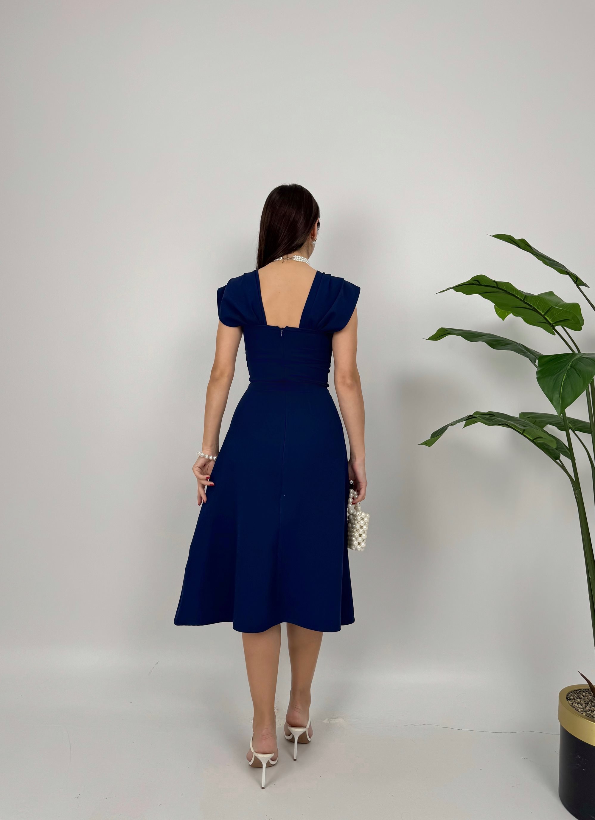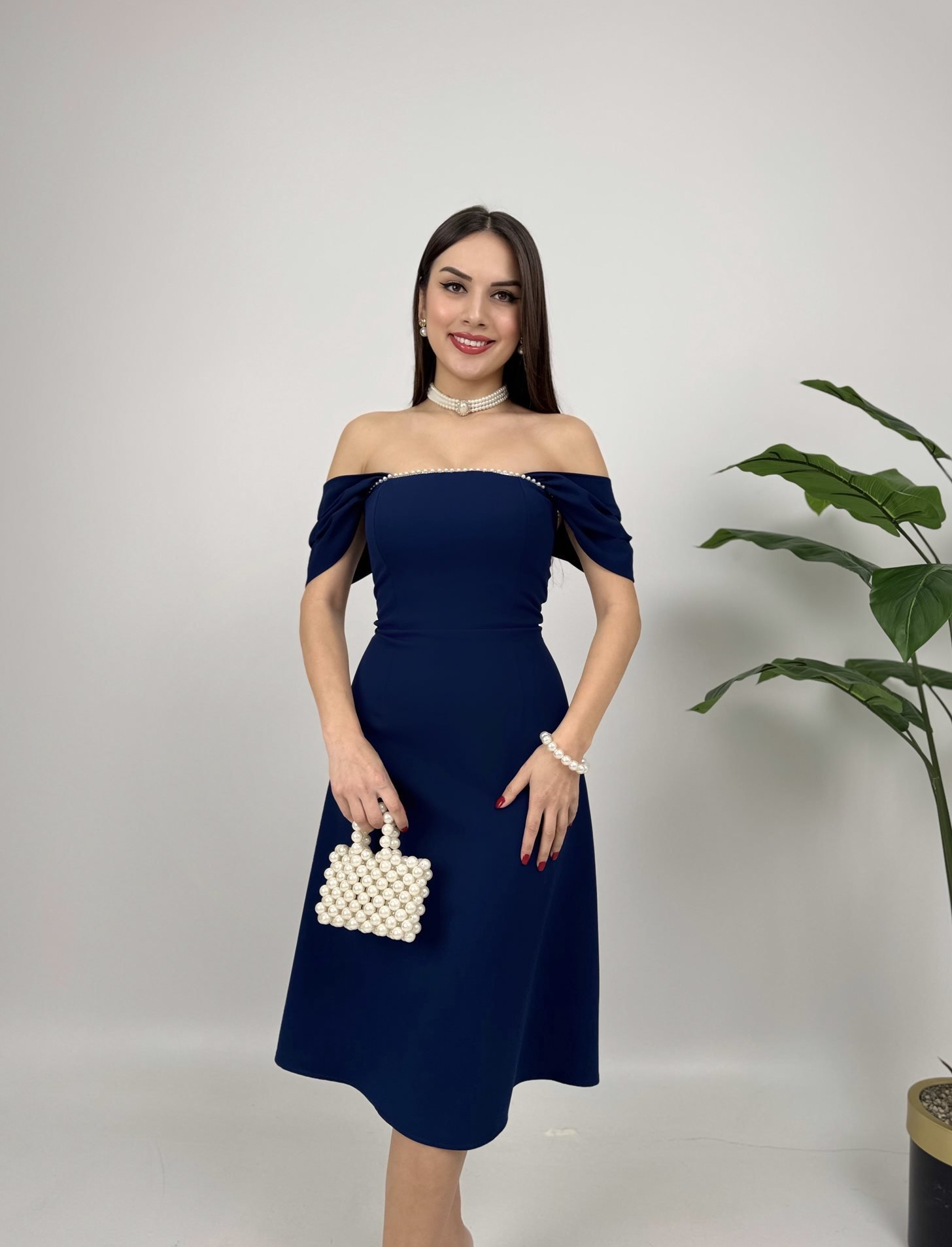 2117 GÖĞÜSÜ ŞERİT İNCİ DETAY ELBİSE NAVY BLUE - LACİVERT