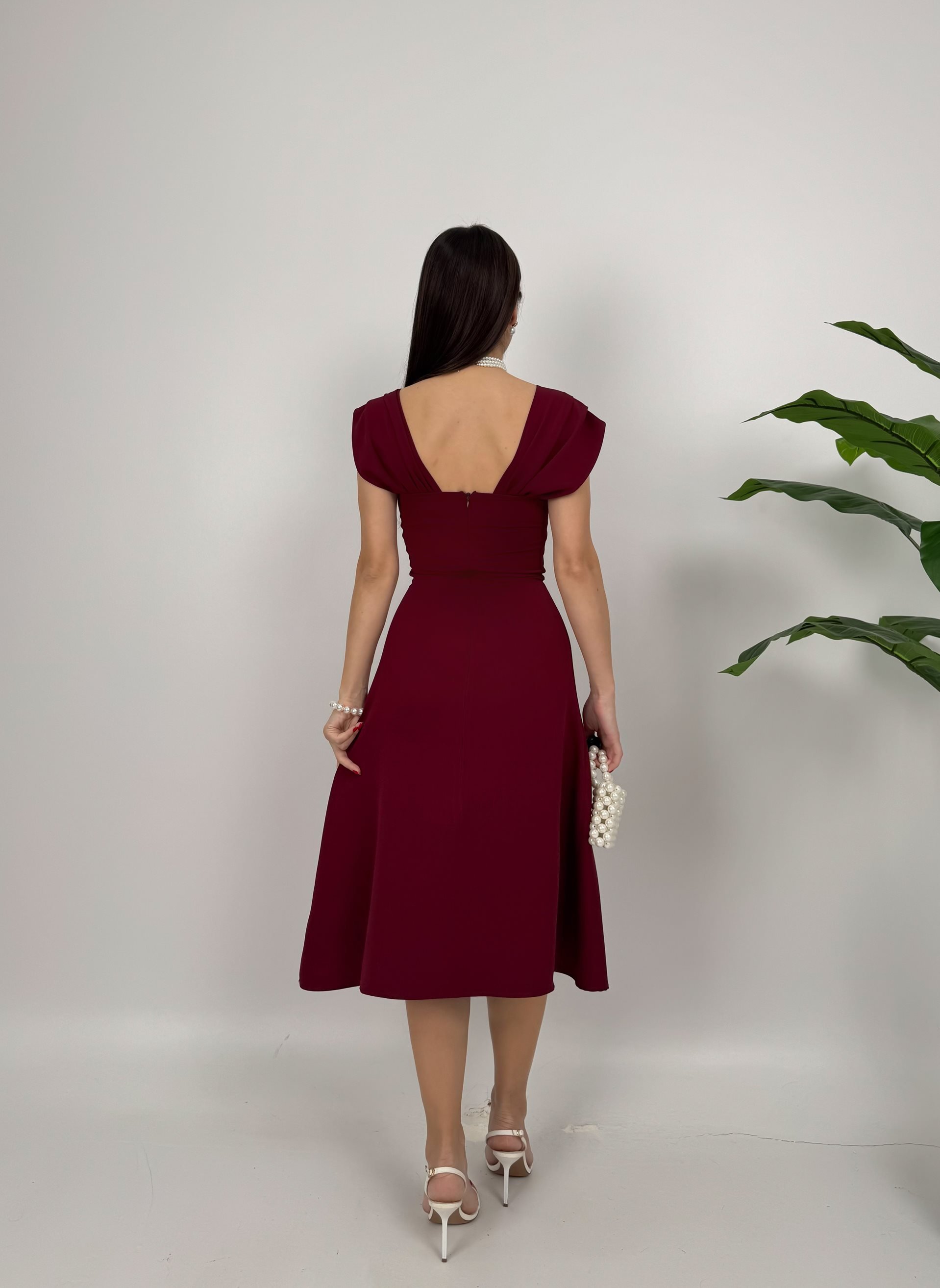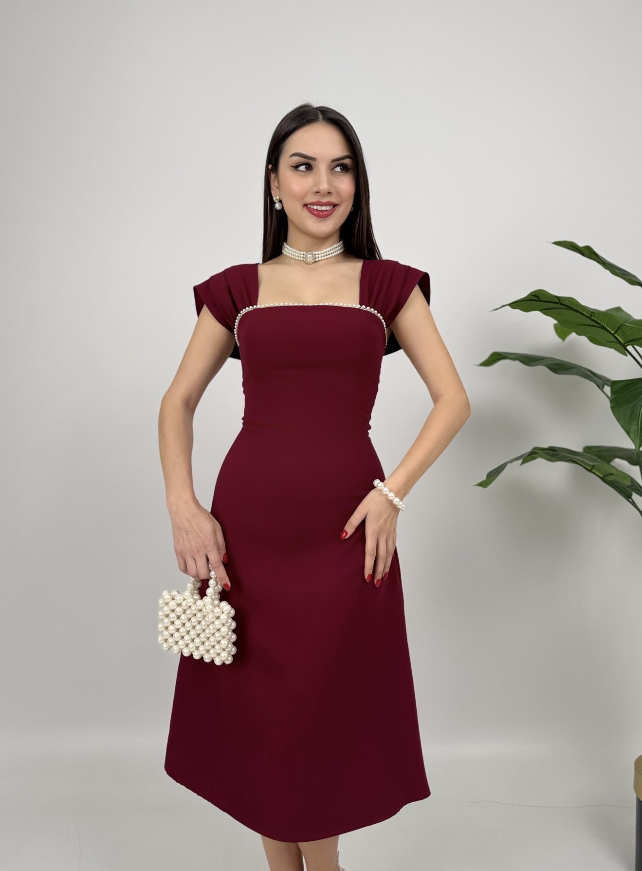 2117 GÖĞÜSÜ ŞERİT İNCİ DETAY ELBİSE BURGUNDY - BORDO