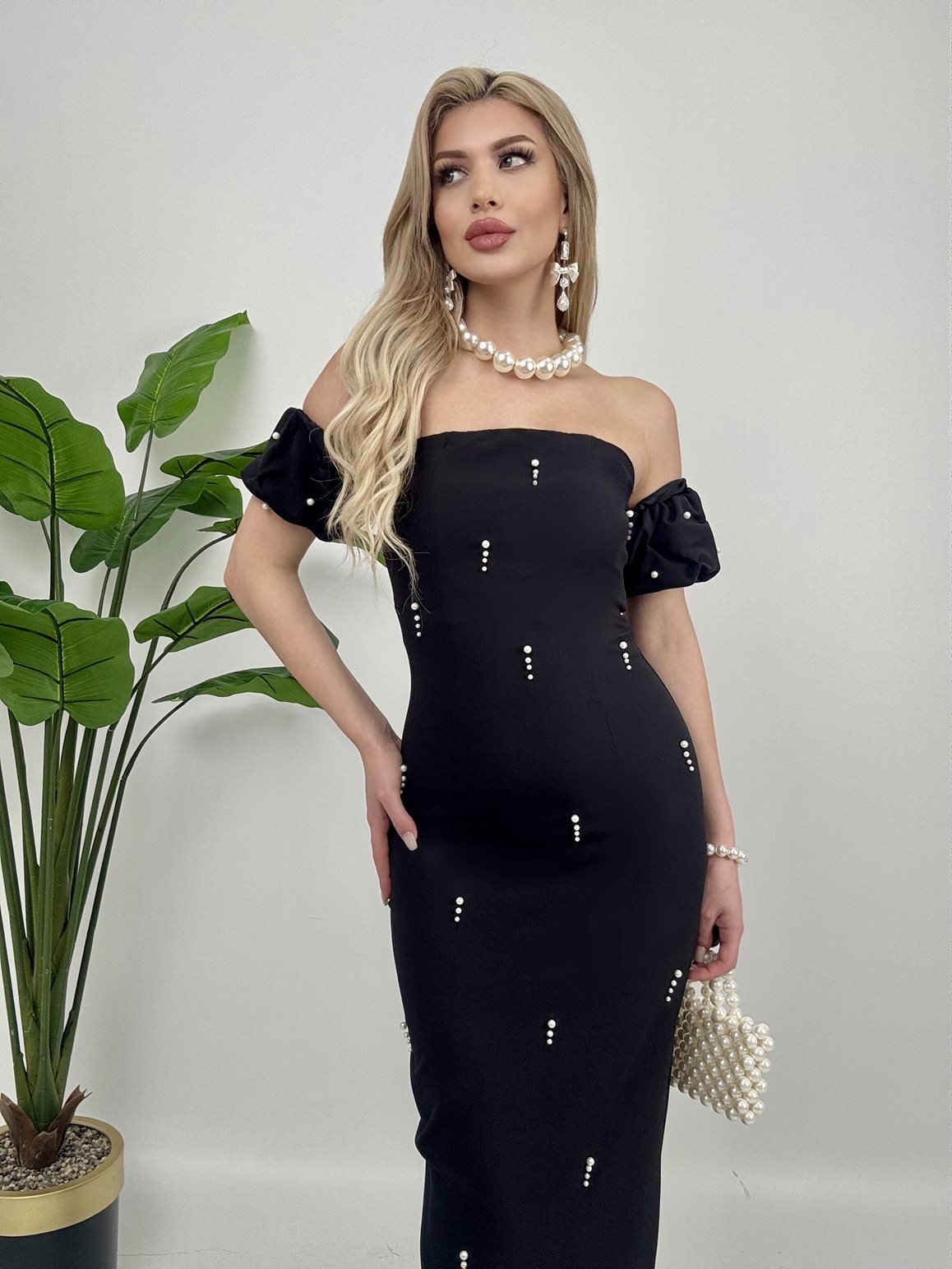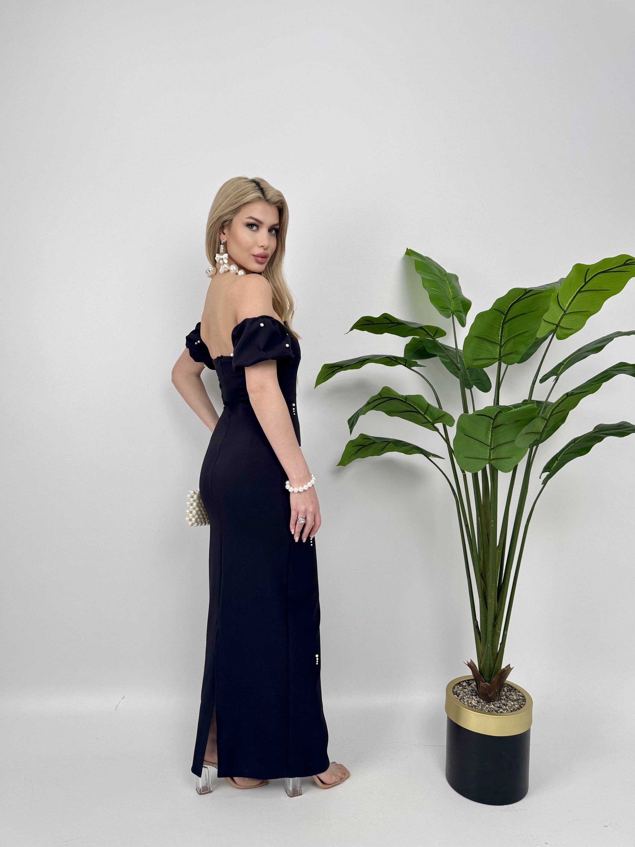 2125 ÖNLER İNCİ DETAY TASARIM ELBİSE BLACK - SİYAH