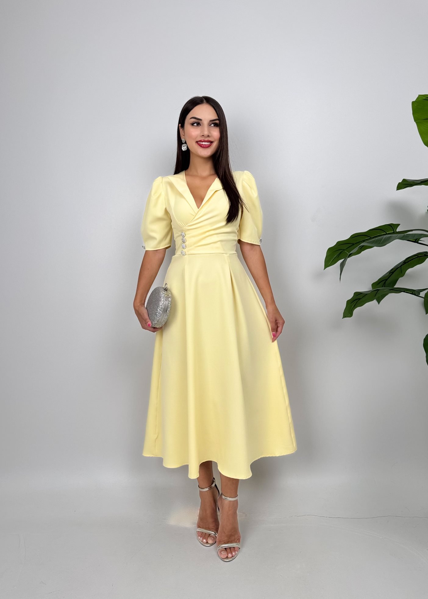 2130 CEKET YAKA BALON KOL DÜĞME DETAY ATLAS ELBİSE YELLOW - SARI