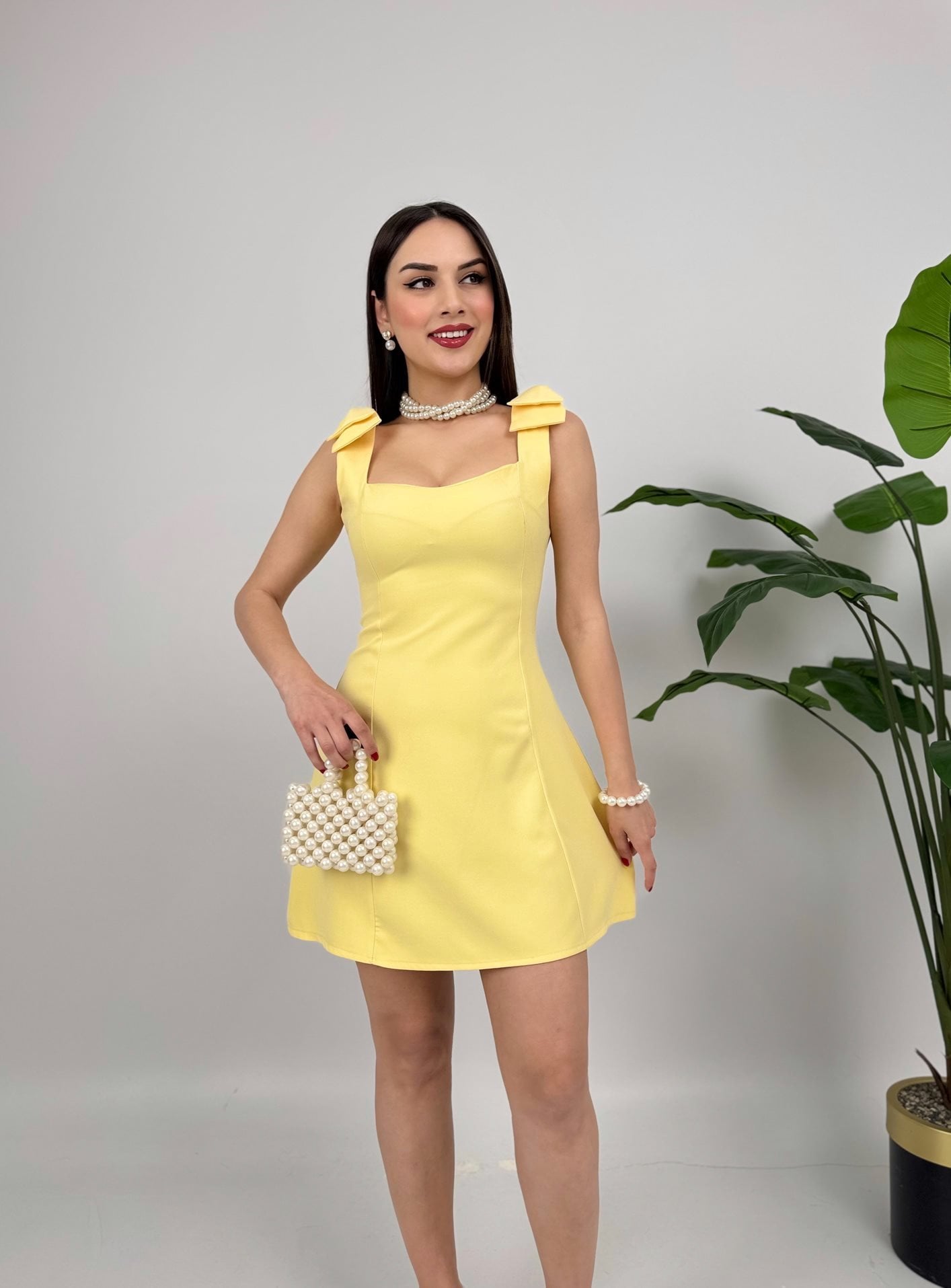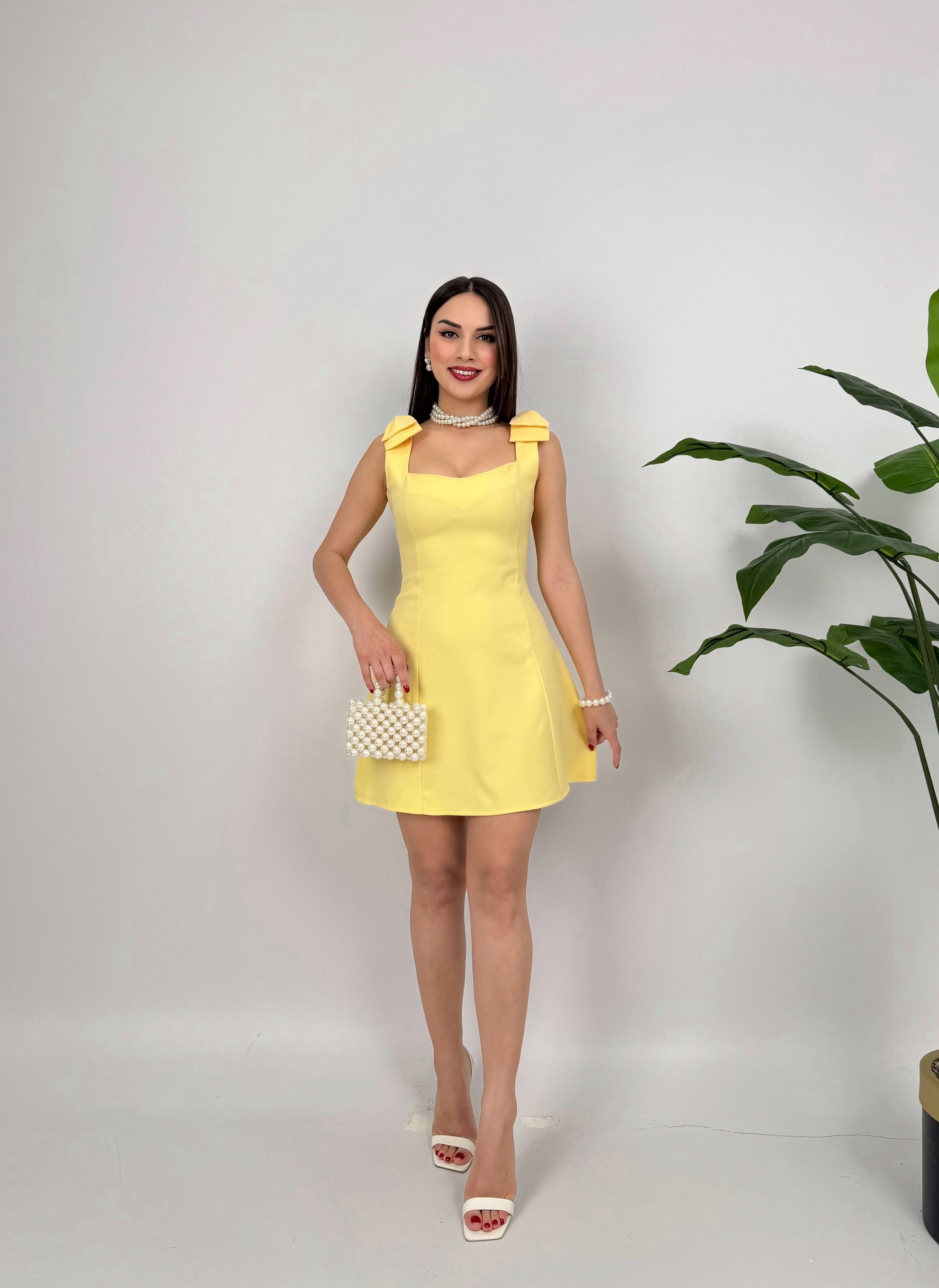 3001 OMUZDAN FİYONKLU MİNİ ELBİSE YELLOW - SARI