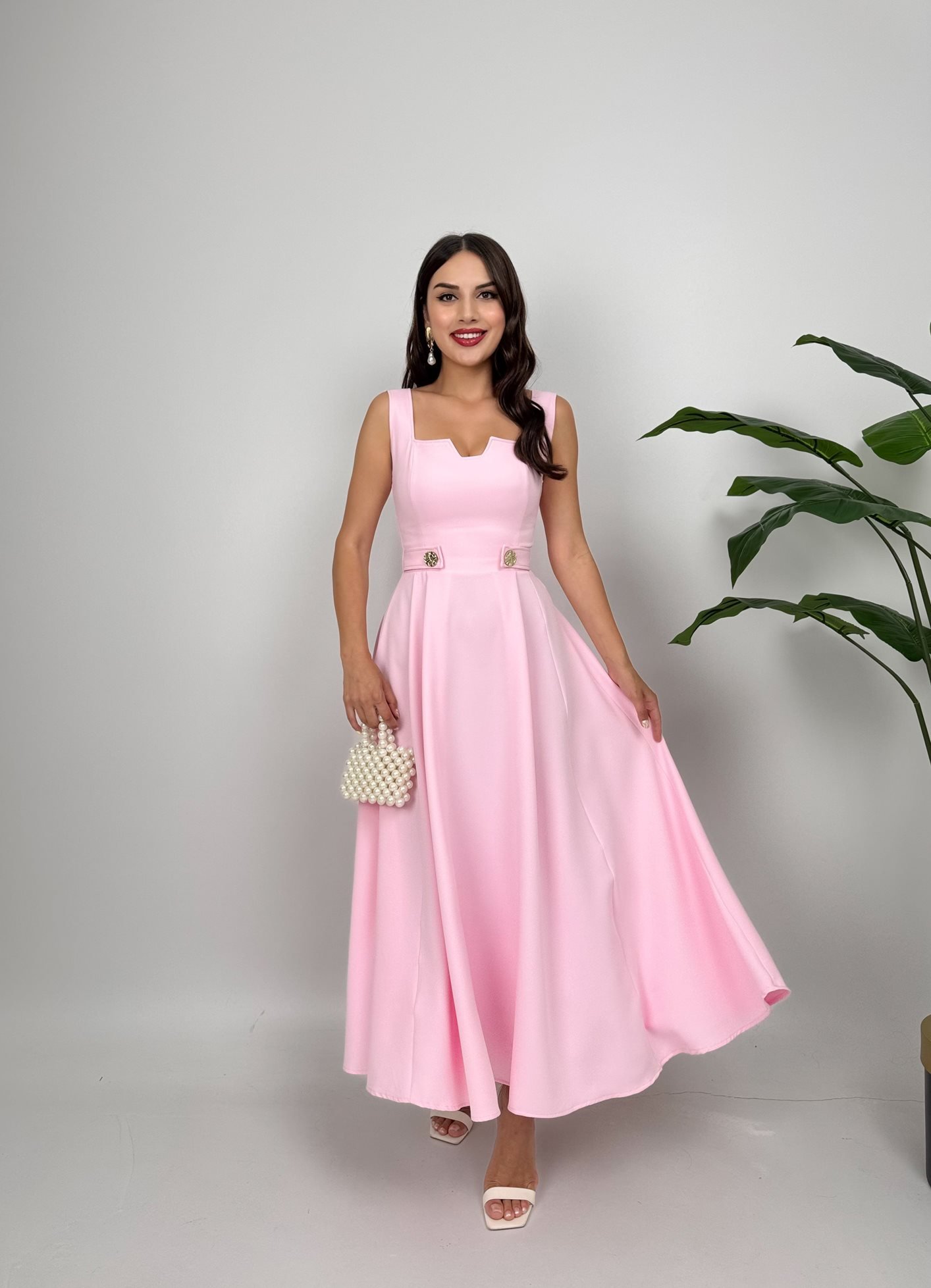 3023 KEMERİ DÜĞMELİ ELBİSE PİNK - PEMBE