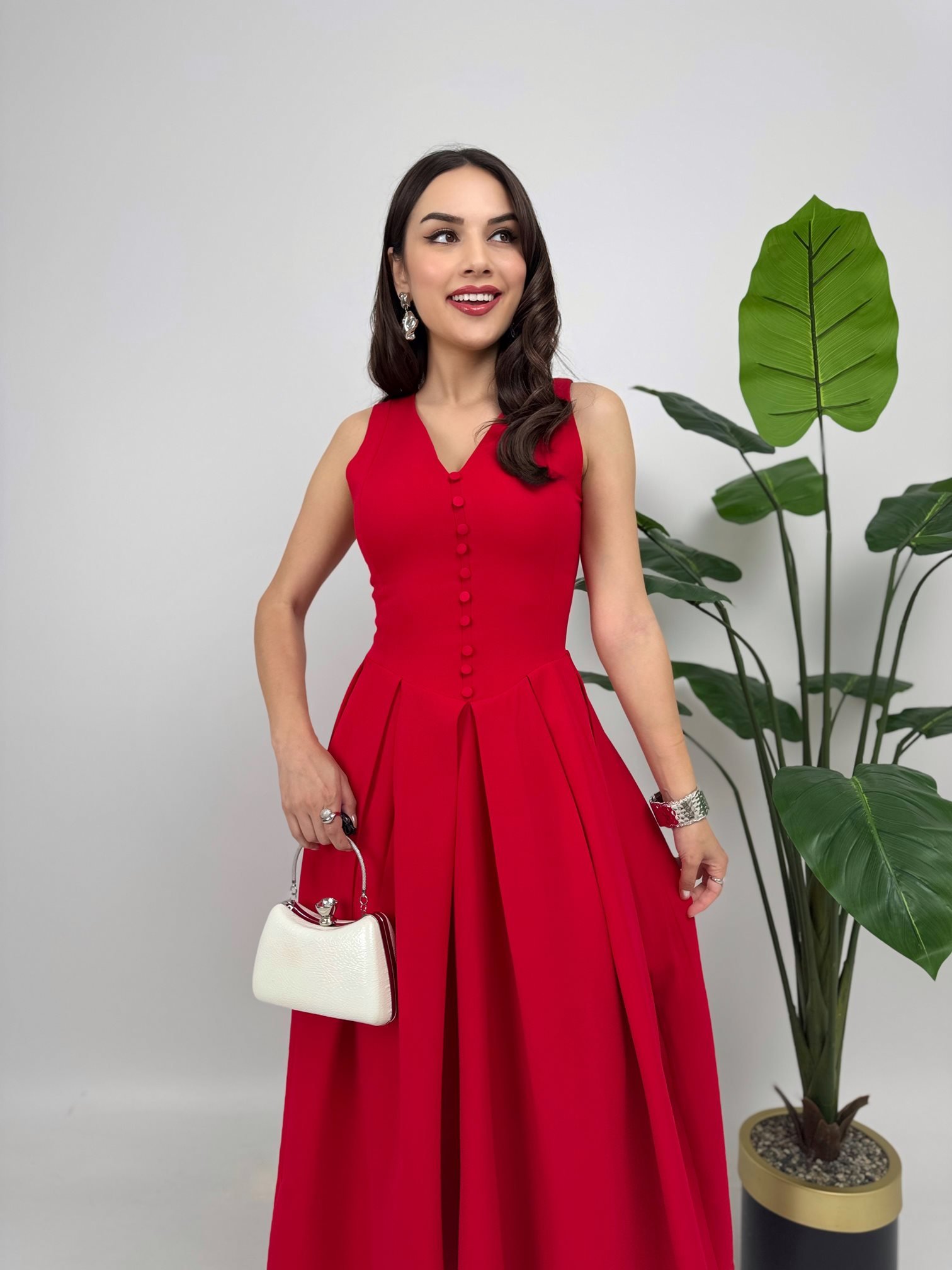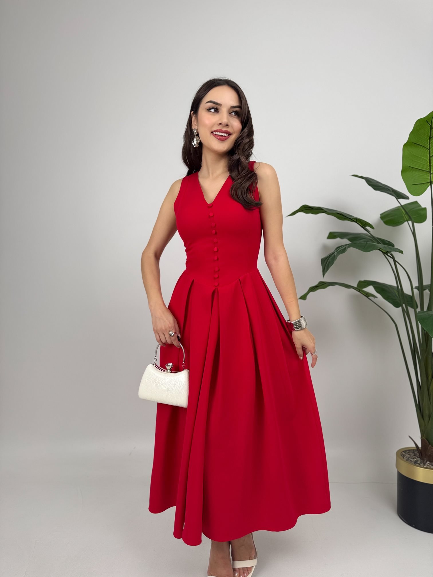 3031 KOLSUZ ÖNDEN DÜĞMELİ ELBİSE RED - KIRMIZI