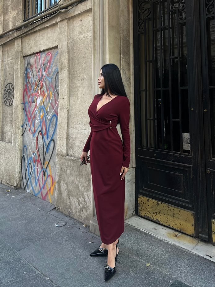 3058 ÖNÜ PİLELİ ELBİSE BURGUNDY - BORDO