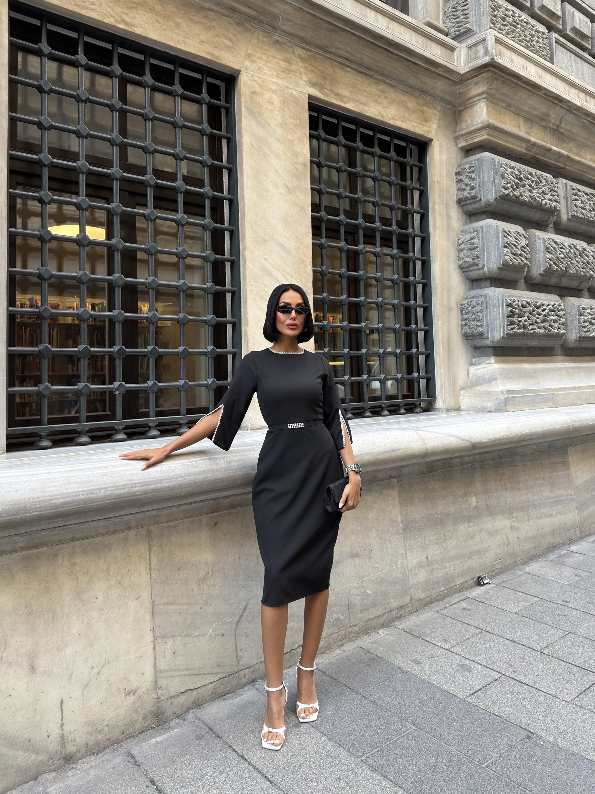 3076 İNCİLİ ELBİSE BLACK - SİYAH