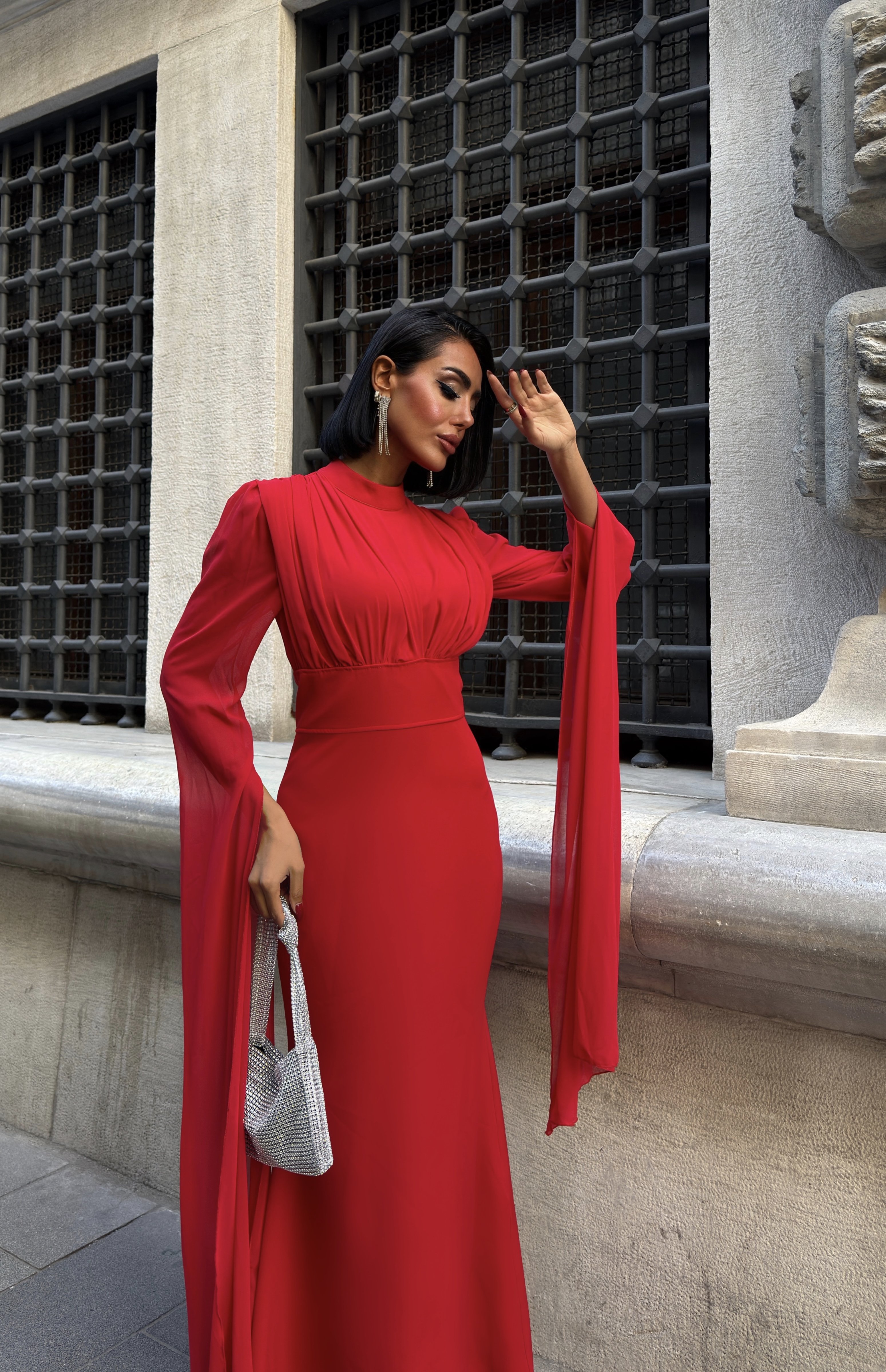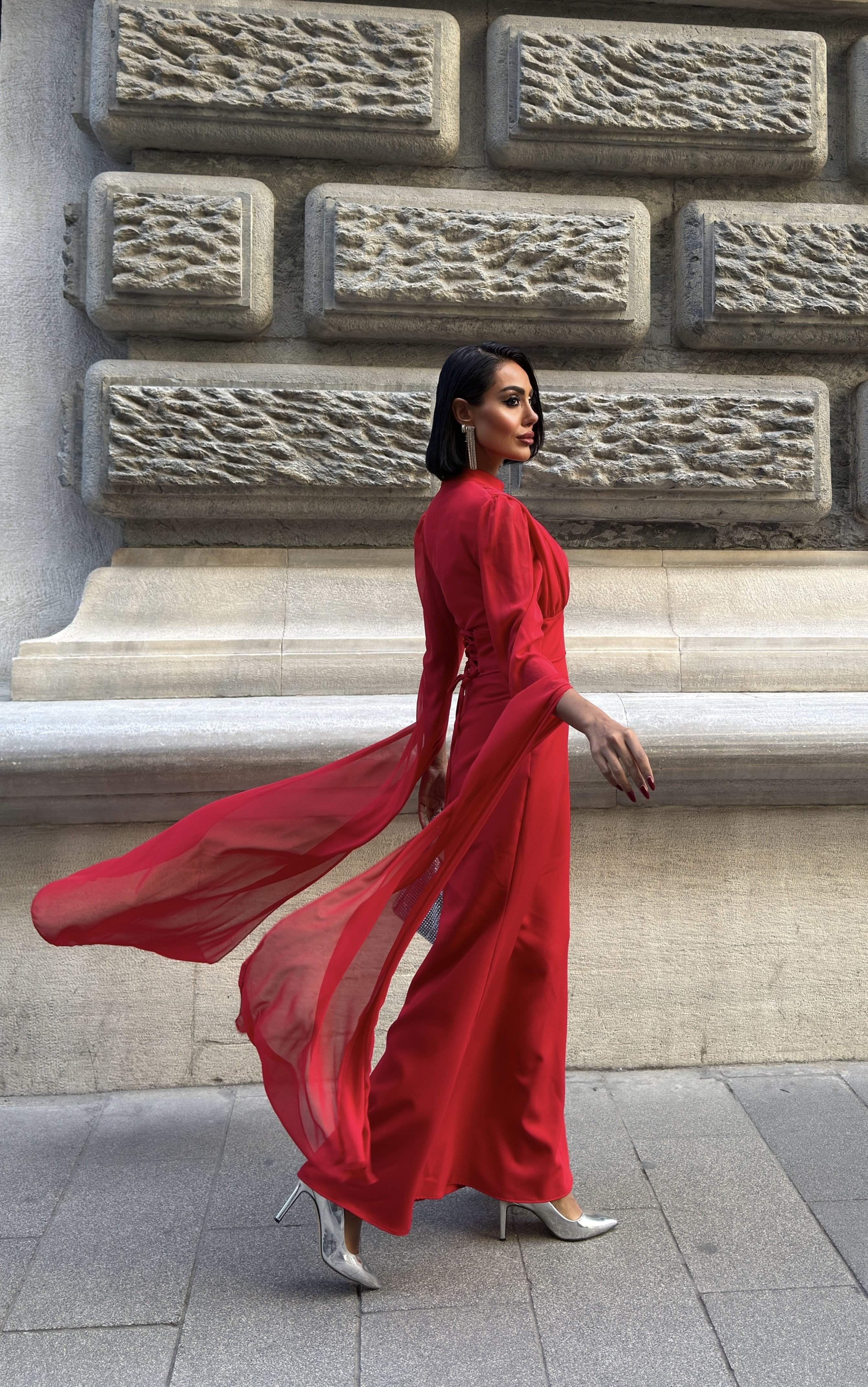 3095 KOLLARI ŞİFON ELBİSE RED - KIRMIZI
