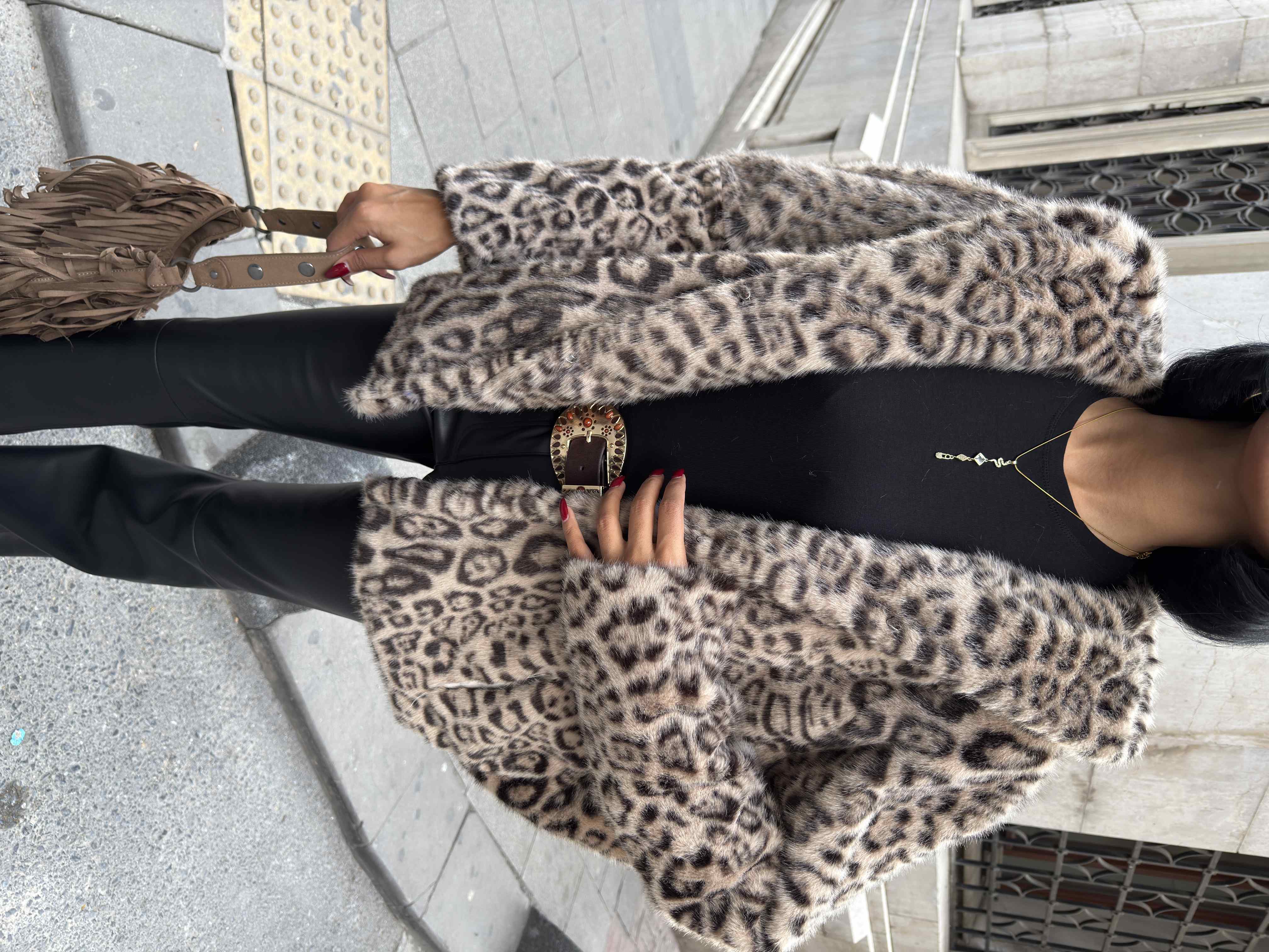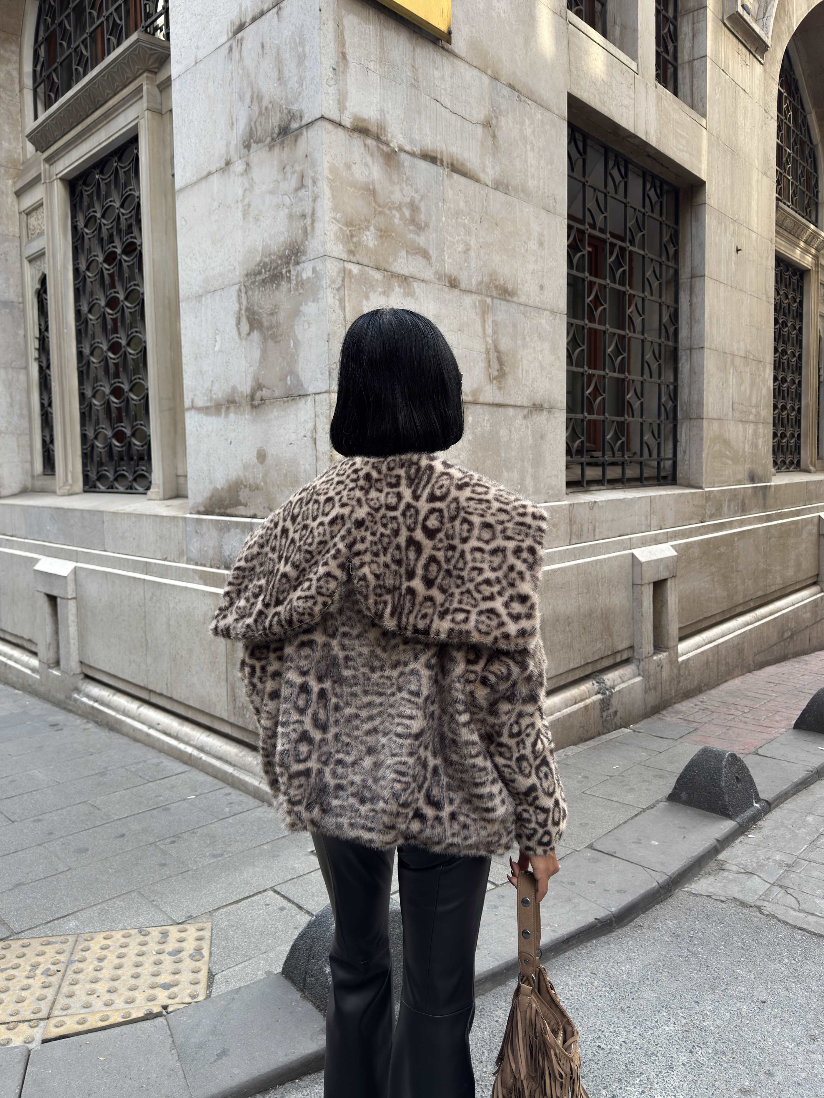 3098 KAPŞONLU LEOPAR KÜRK CREAM - KREM