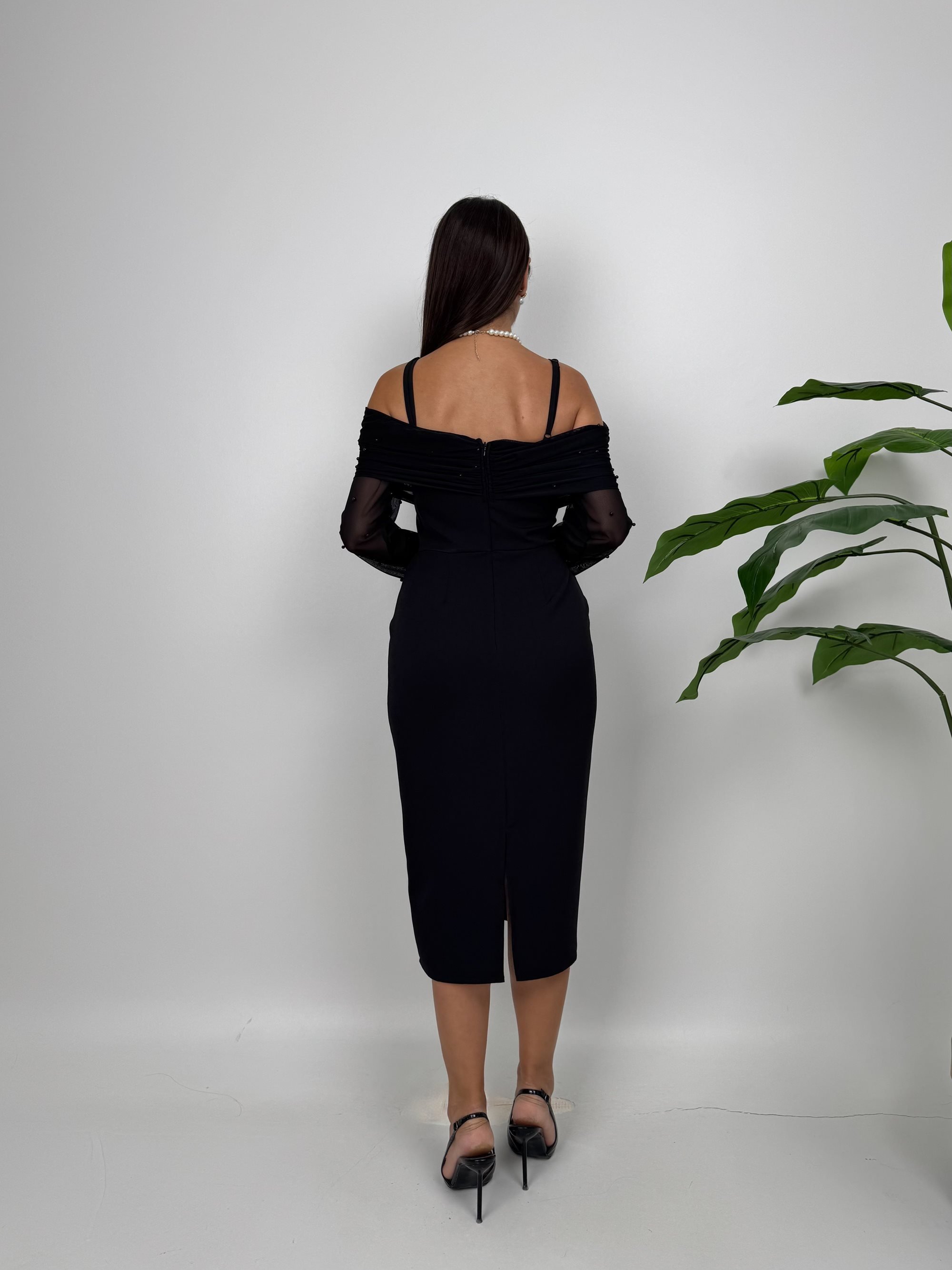 4017 OMUZ TÜLLÜ ASKI İNCİ DETAYLI ELBİSE BLACK - SİYAH