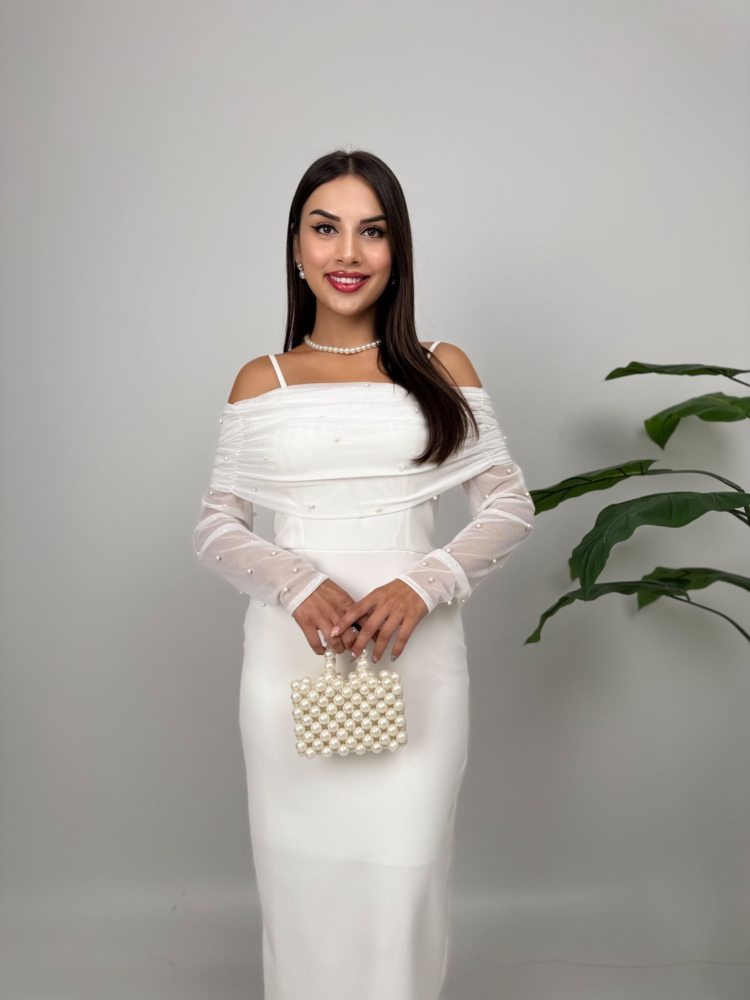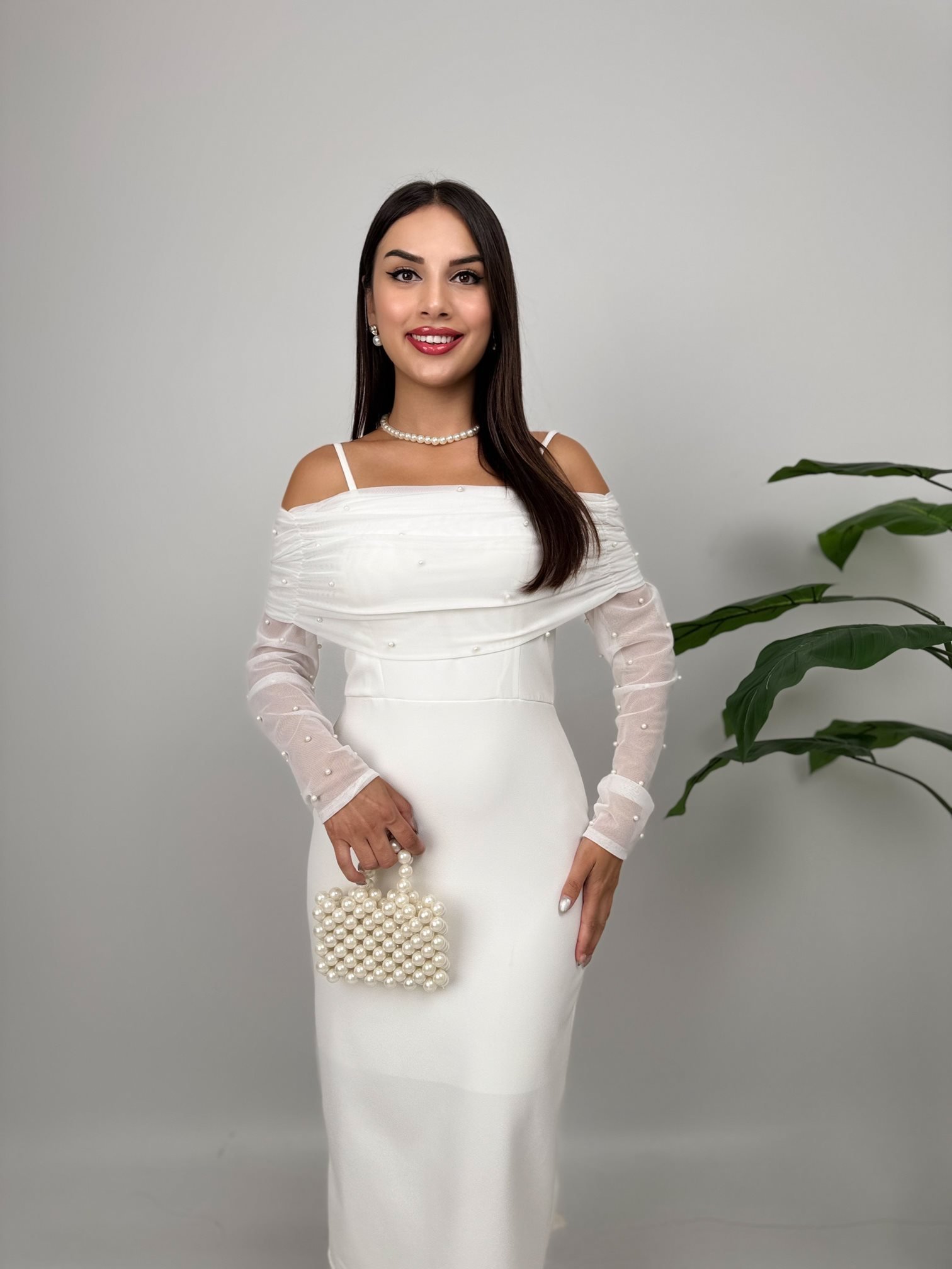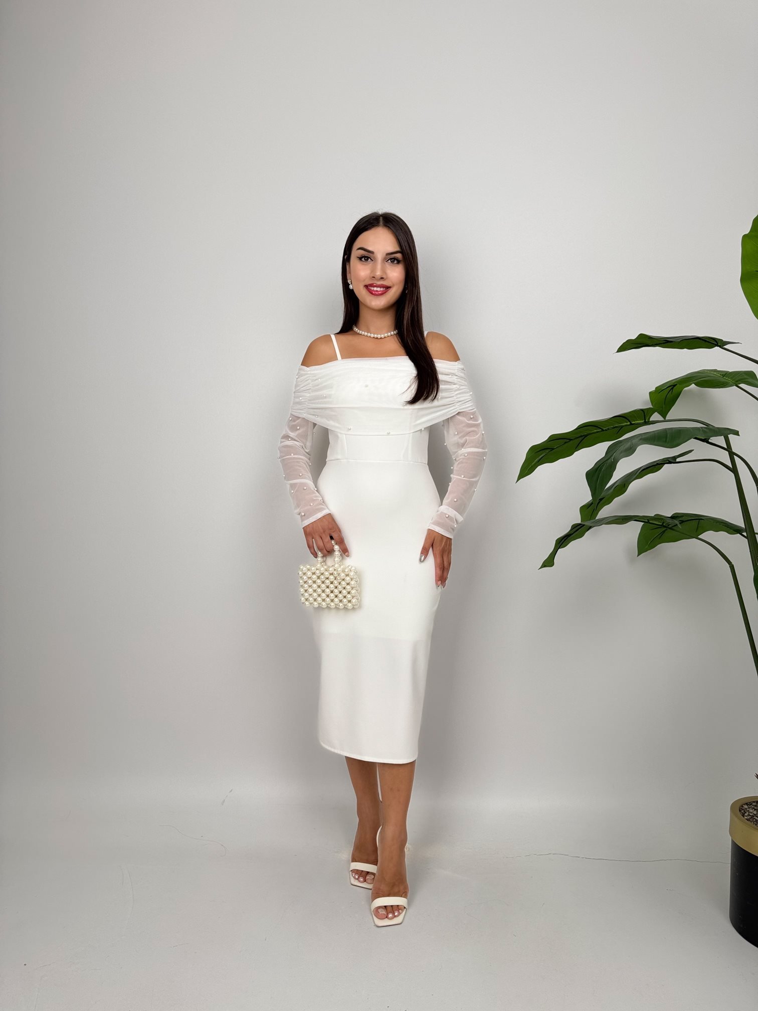 4017 OMUZ TÜLLÜ ASKI İNCİ DETAYLI ELBİSE WHİTE - BEYAZ
