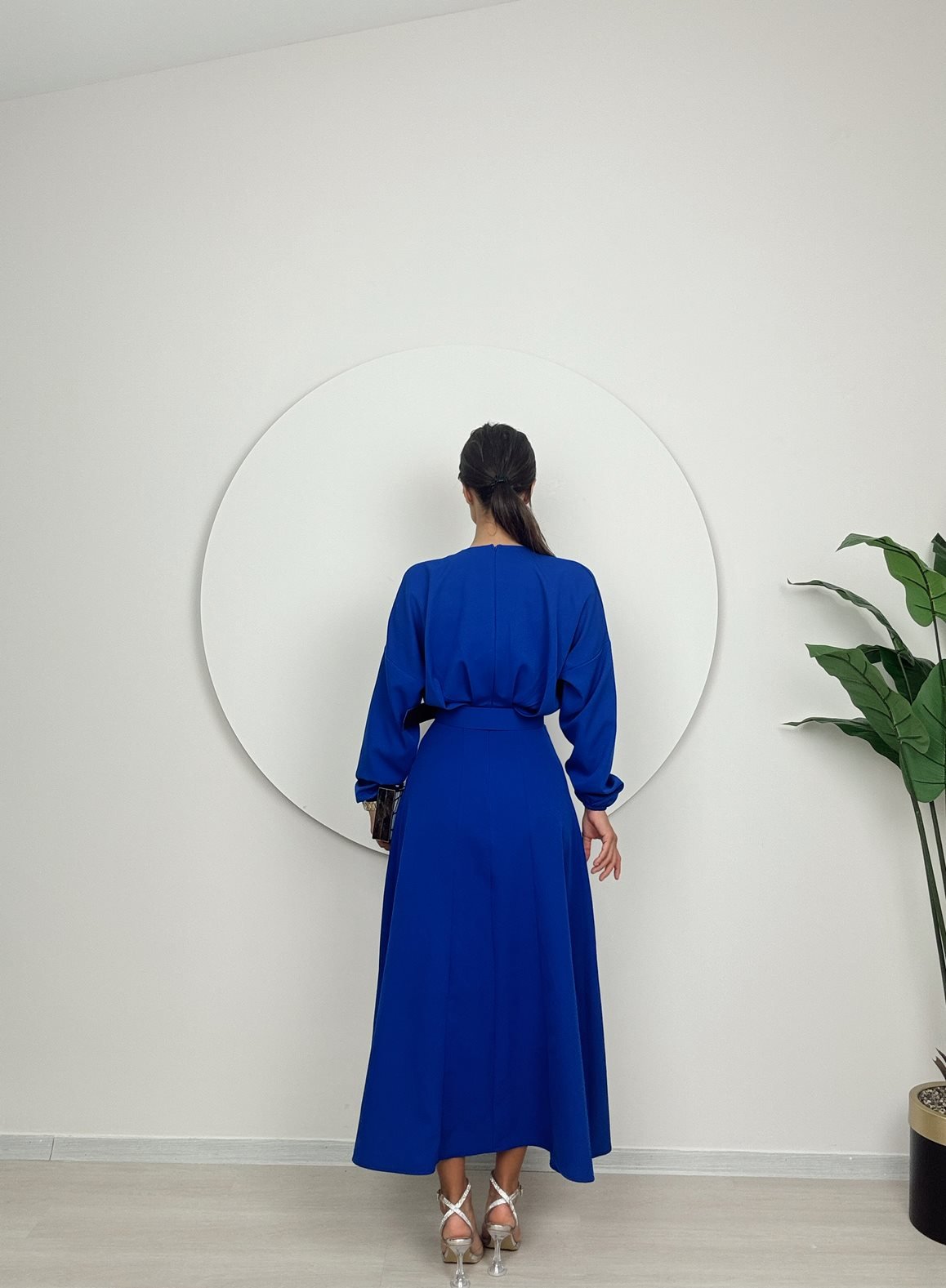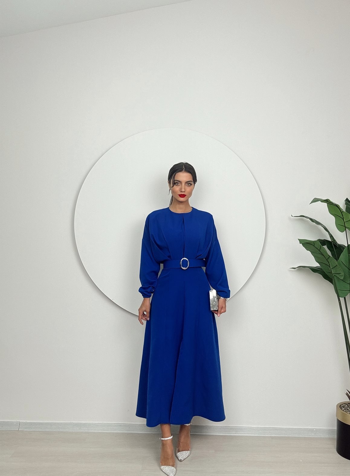 1017 PİLELİ KEMERLİ UZUN ELBİSE SAXE - SAX