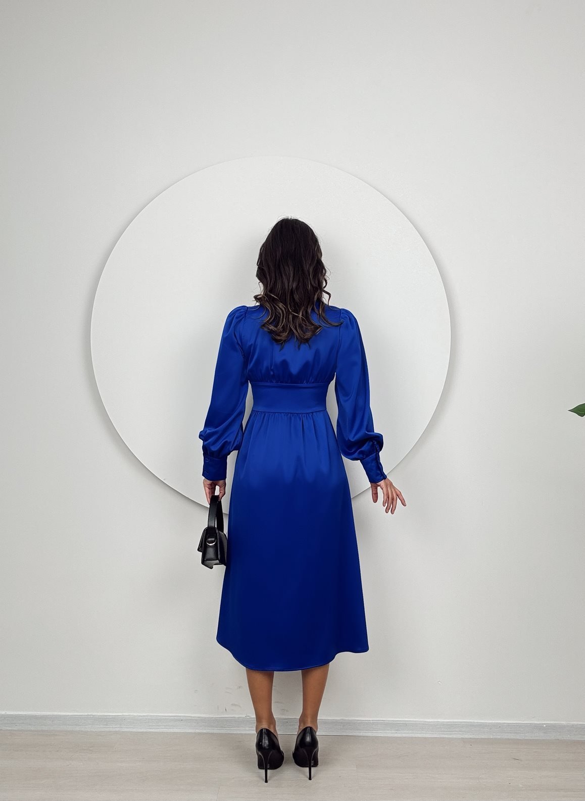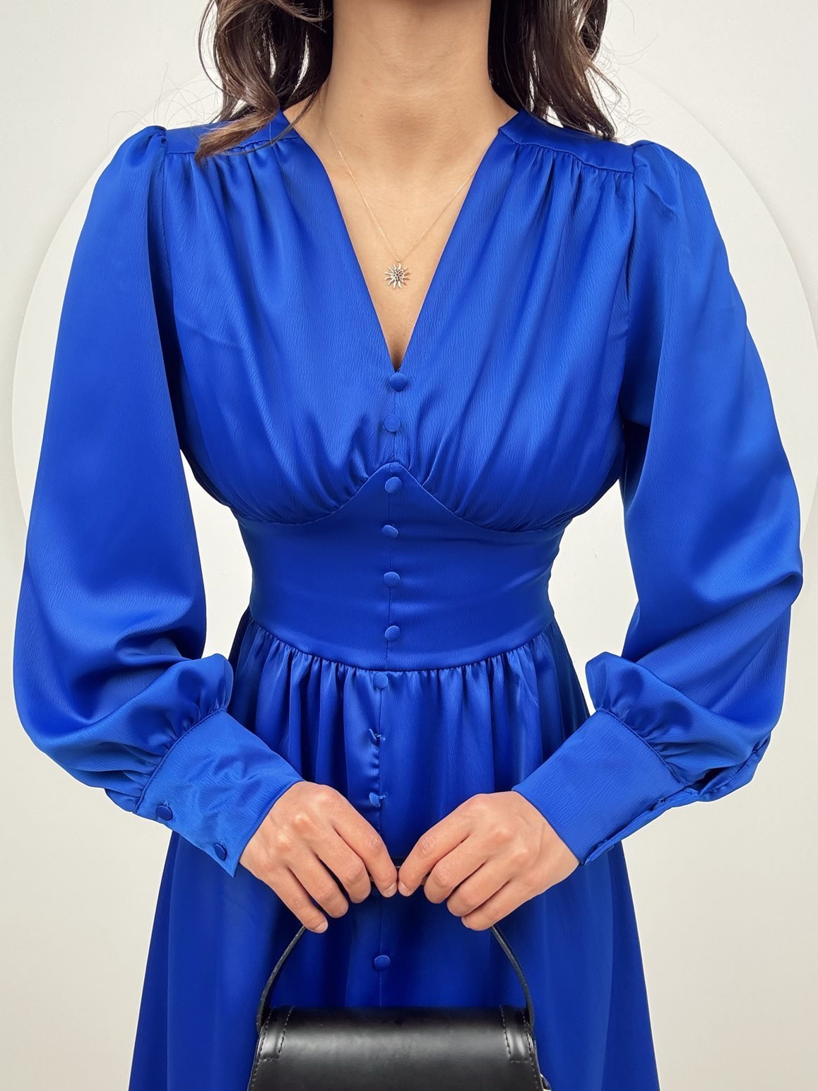 1050 GÖGÜS BÜZGÜLÜ ÖN DÜĞMELİ SATEN ELBİSE SAXE - SAX