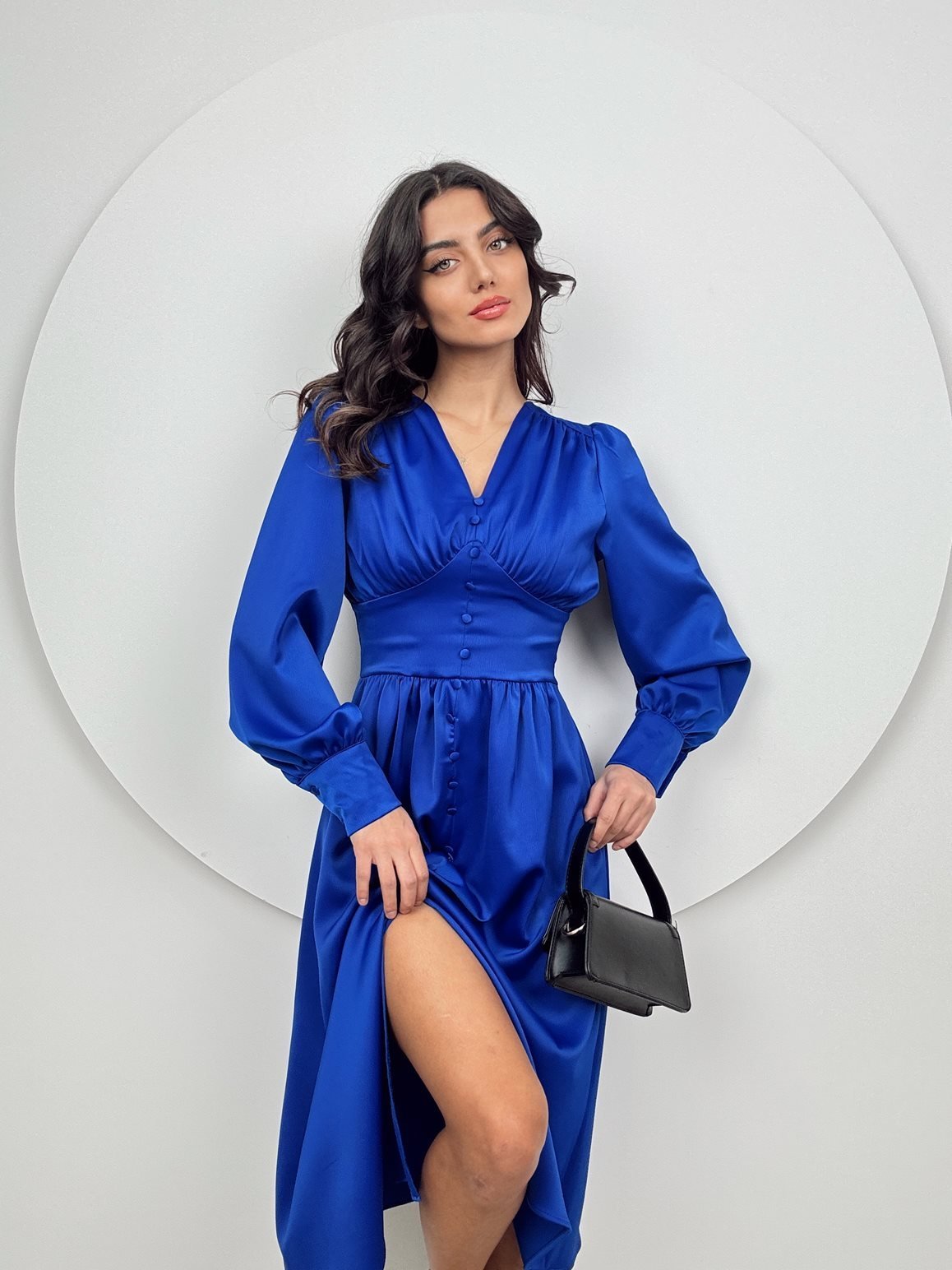1050 GÖGÜS BÜZGÜLÜ ÖN DÜĞMELİ SATEN ELBİSE