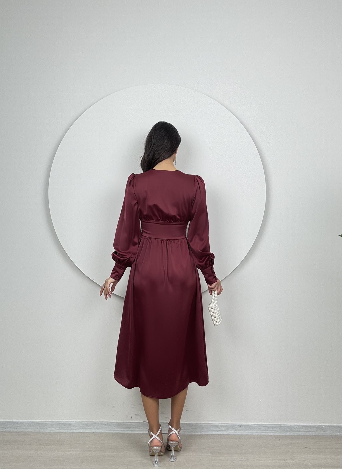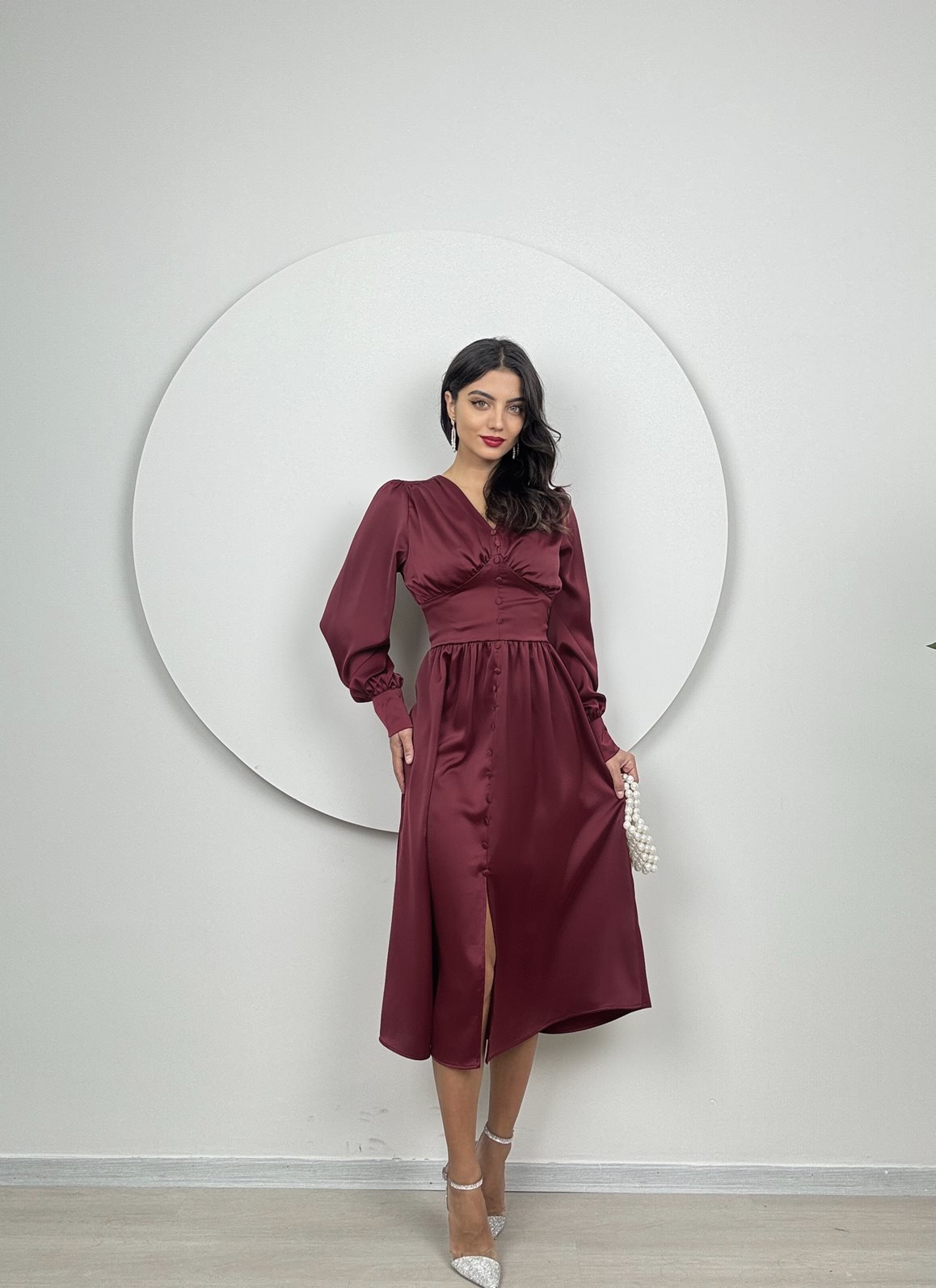 1050 GÖGÜS BÜZGÜLÜ ÖN DÜĞMELİ SATEN ELBİSE BURGUNDY - BORDO