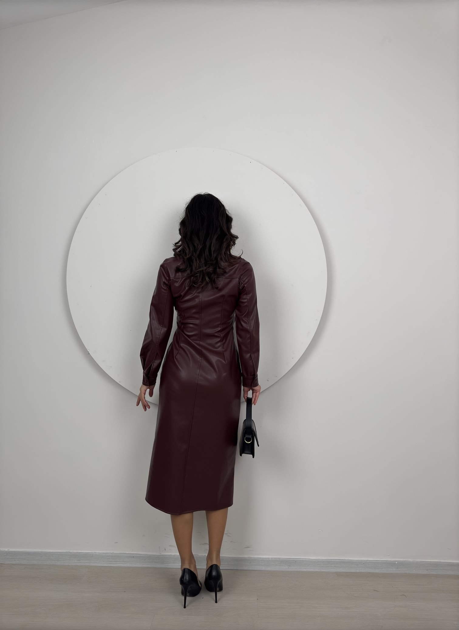 1057 ZARA LİNE DERİ ELBİSE BURGUNDY - BORDO