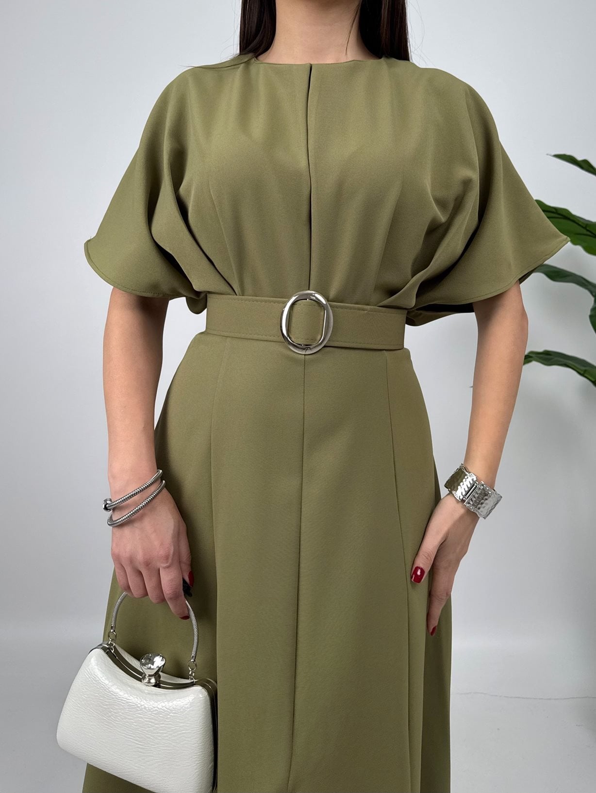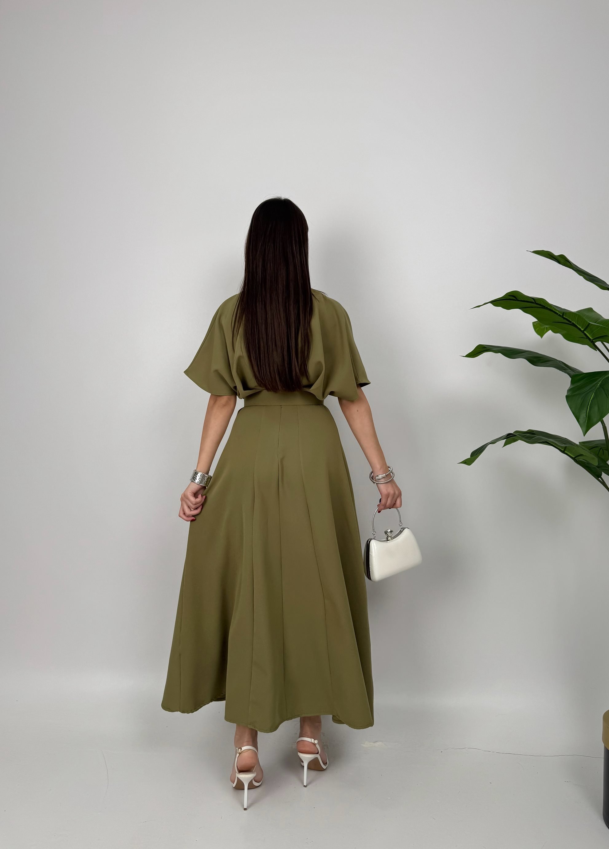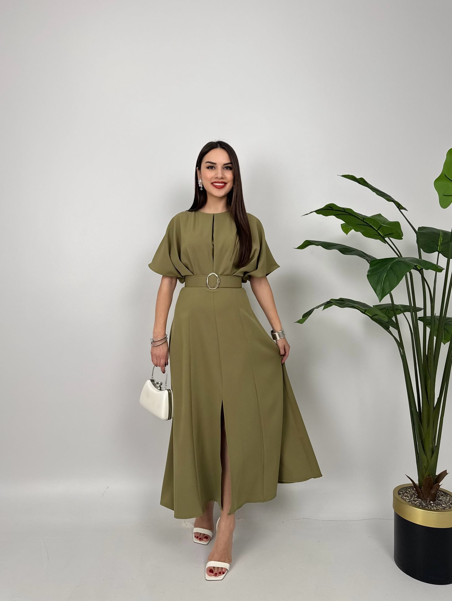 2056 ATLAS KUMAŞ KEMERLİ ELBİSE KHAKİ - HAKİ