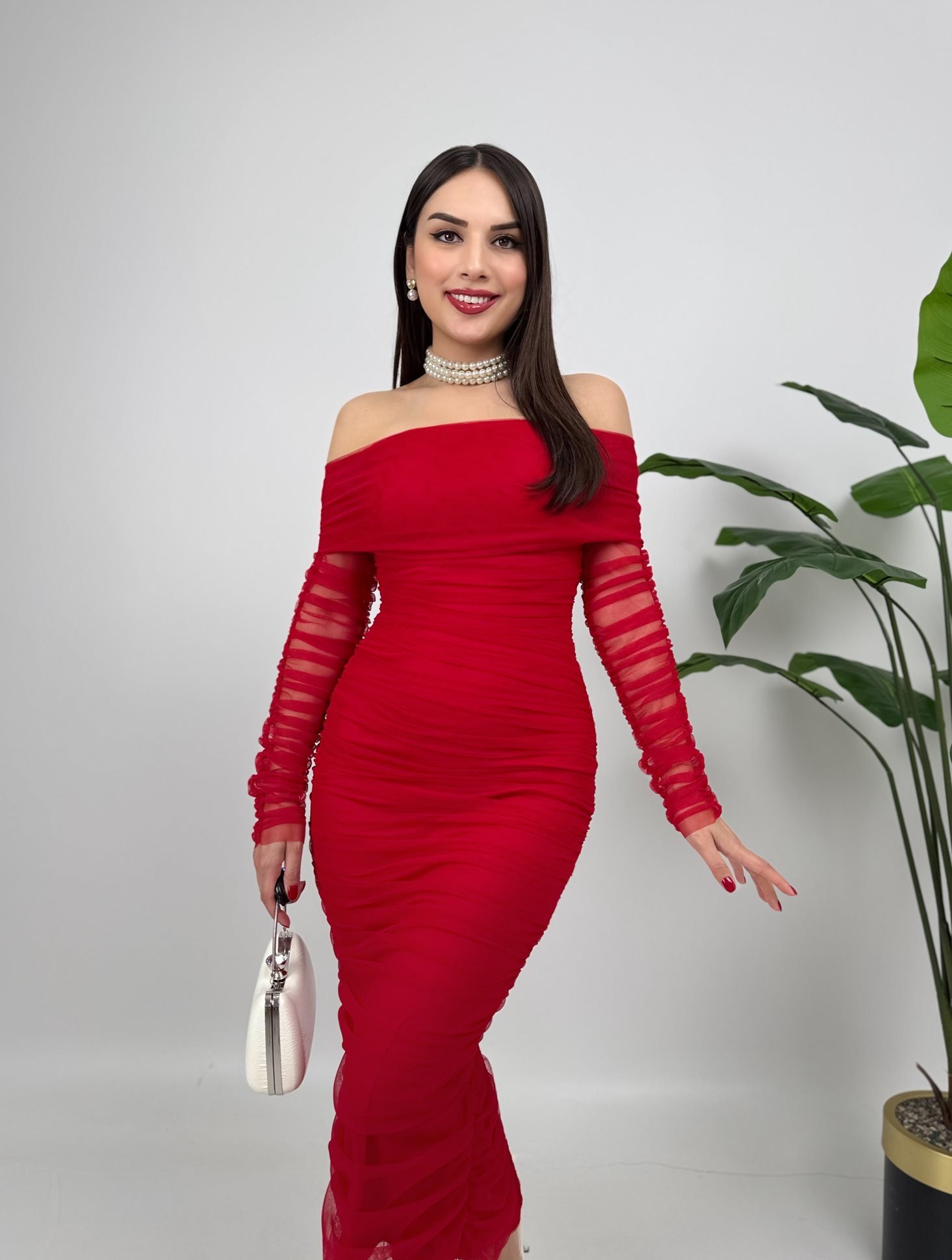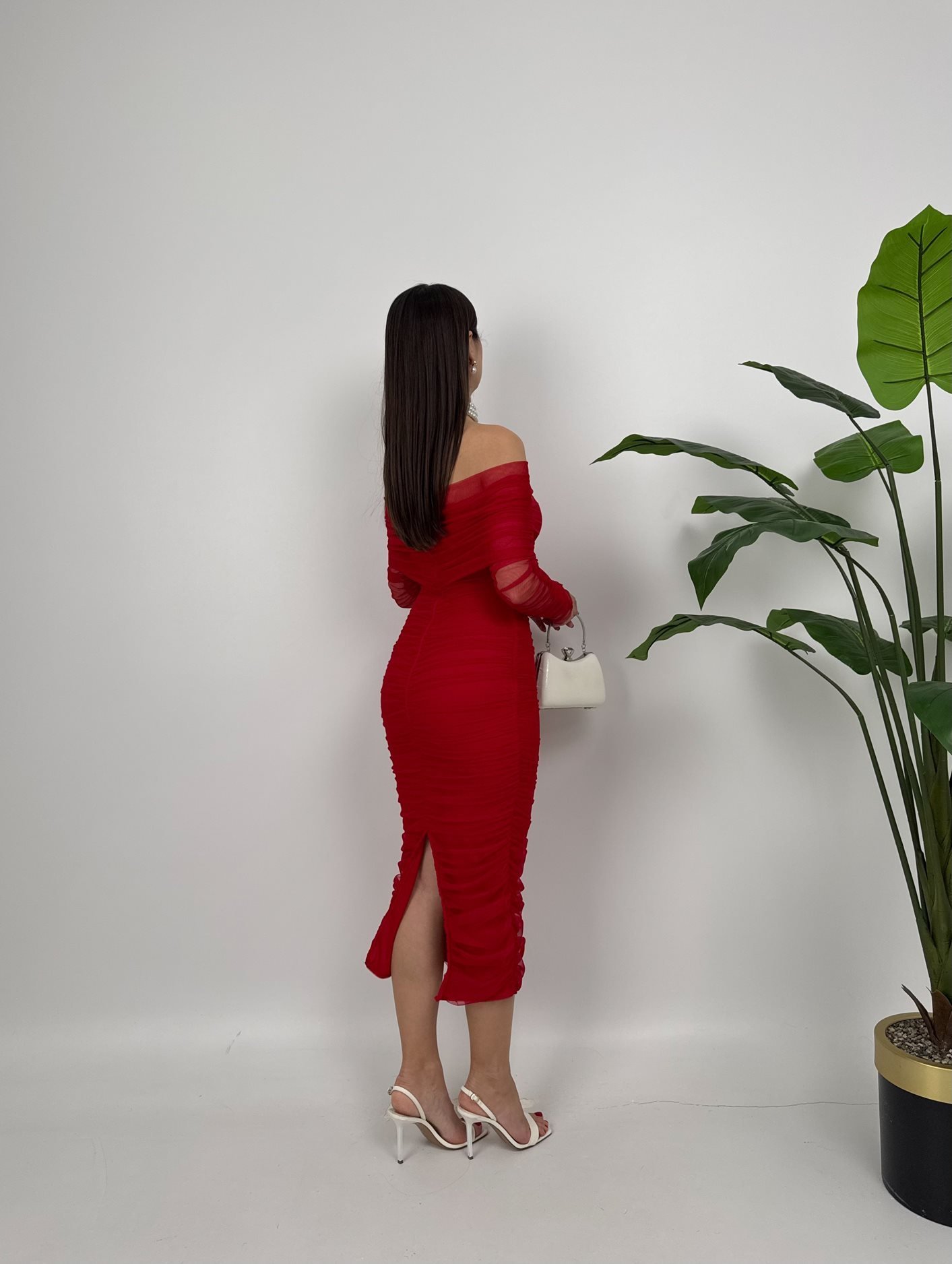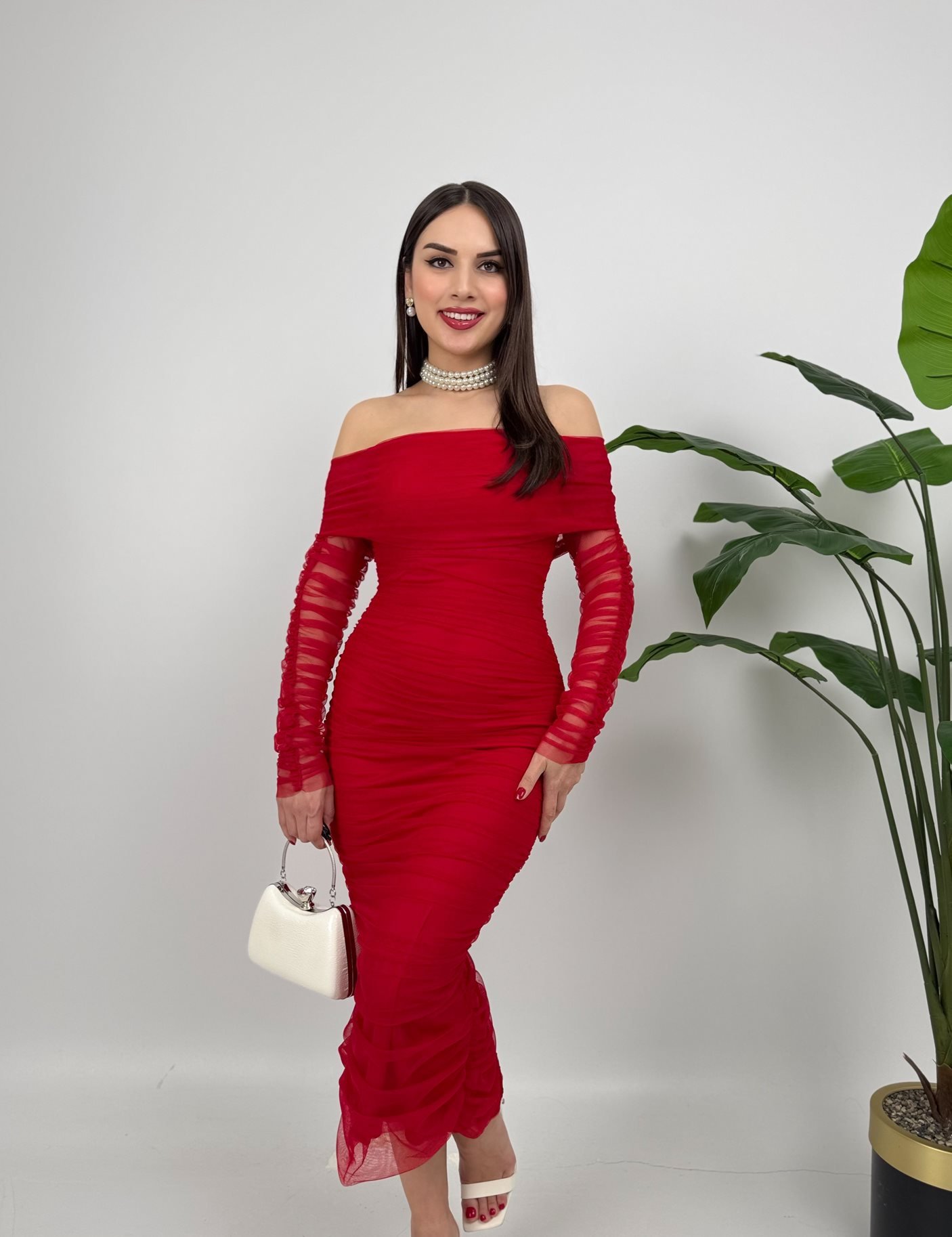 2067 STRAPLEZ BÜZGÜLÜ UZUN KOL TÜL ELBİSE RED - KIRMIZI