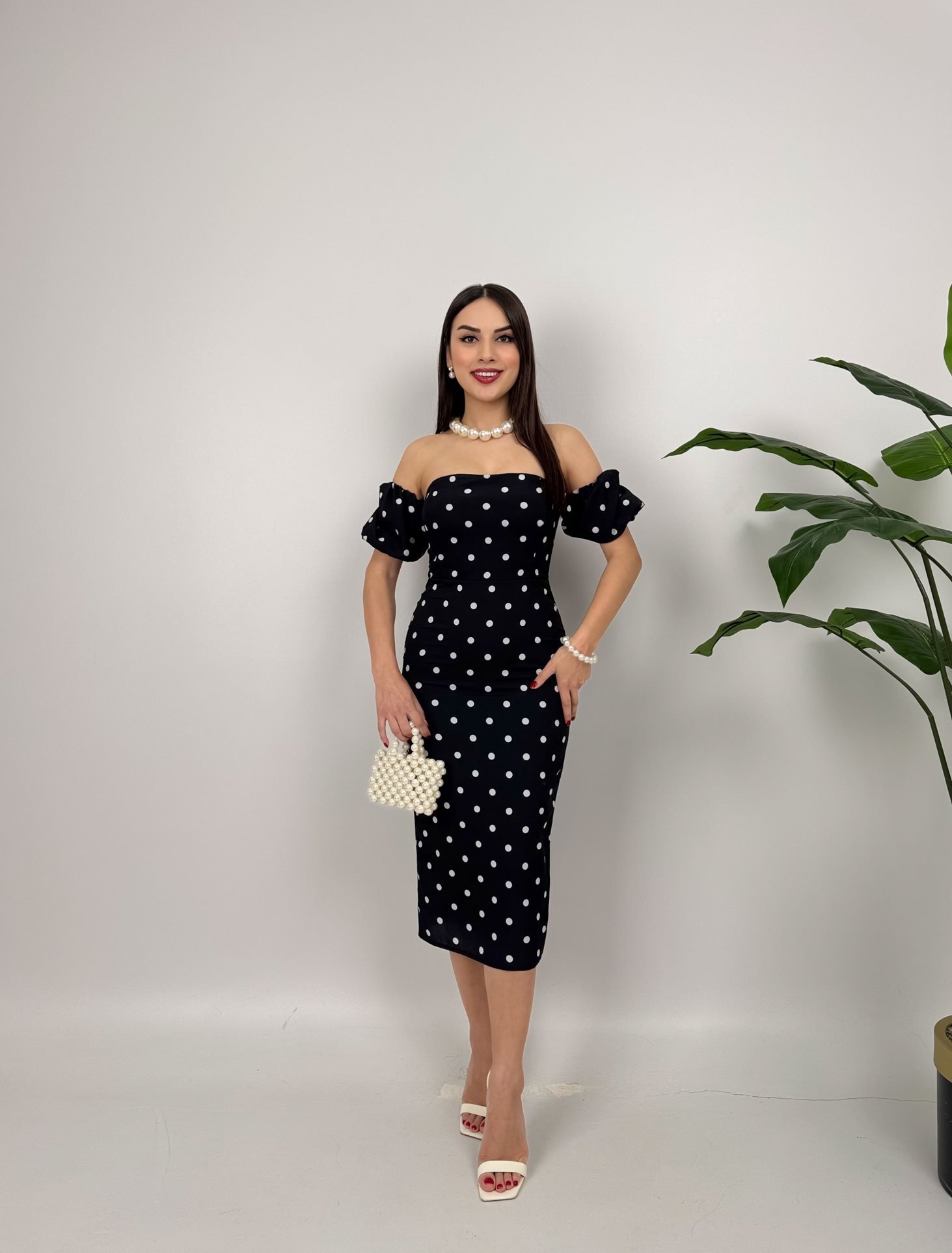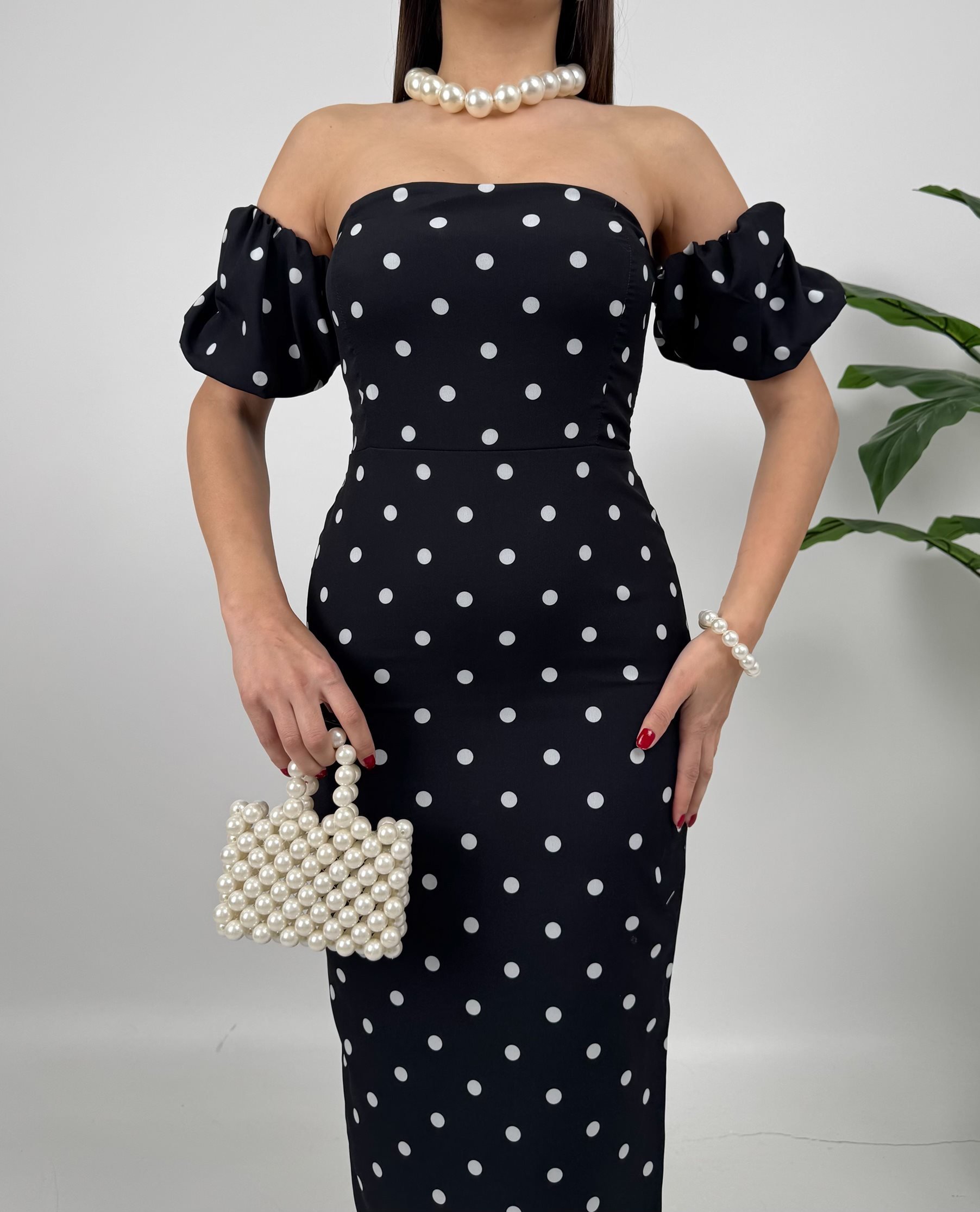 2076 PUANTİYE DESEN BALON KOL KREP ELBİSE BLACK - SİYAH