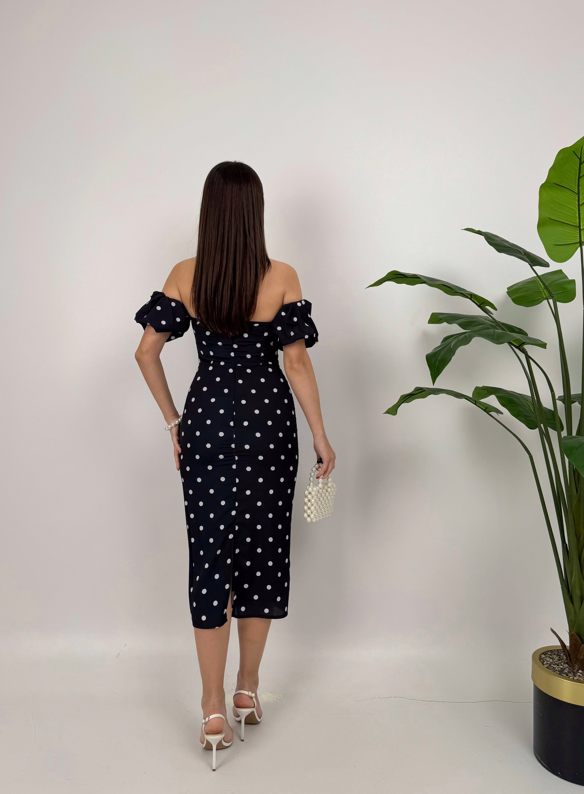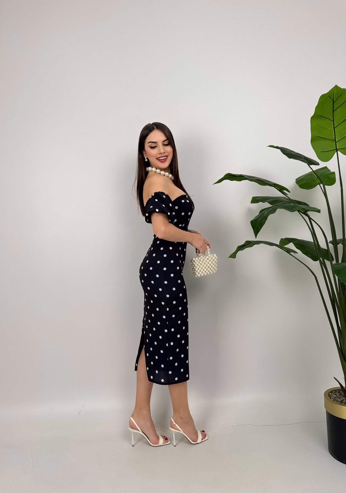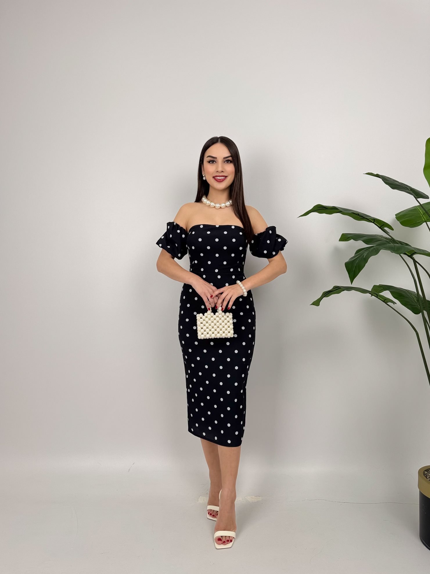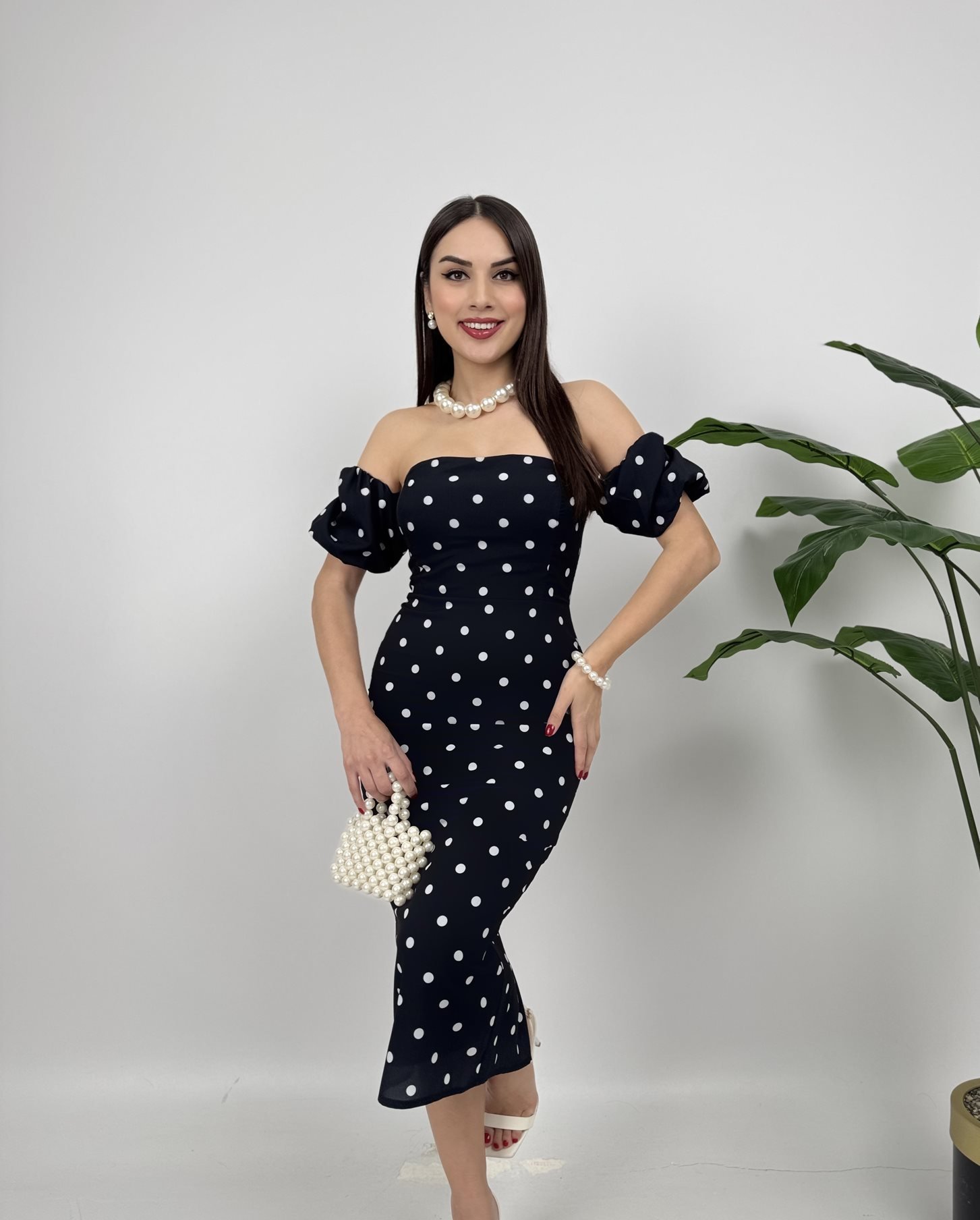 2076 PUANTİYE DESEN BALON KOL KREP ELBİSE