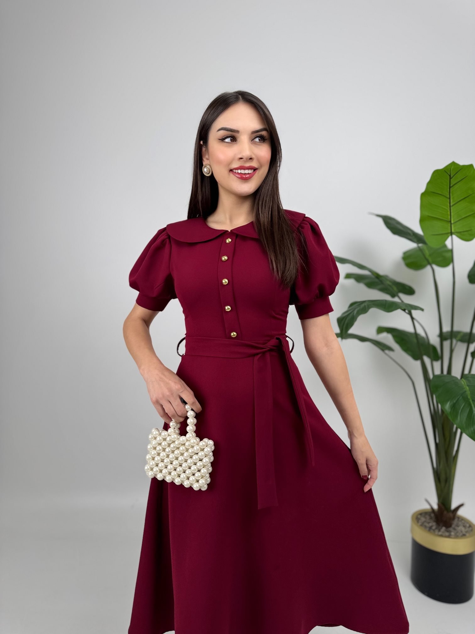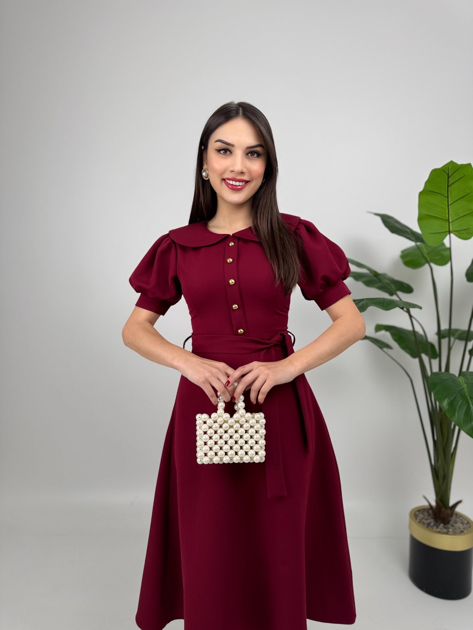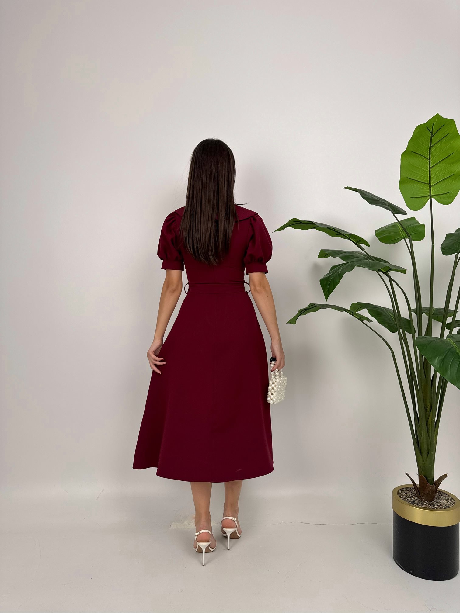 2111 BEBE YAKA KUŞAKLI MİDİ ELBİSE BURGUNDY - BORDO