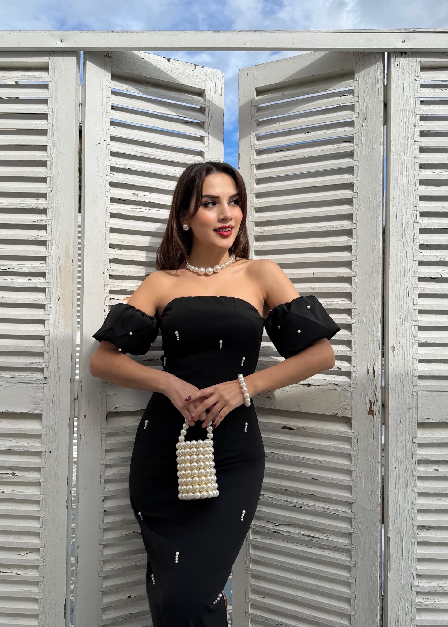 2125 ÖNLER İNCİ DETAY TASARIM ELBİSE BLACK - SİYAH