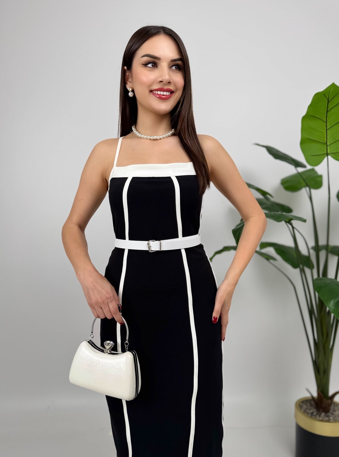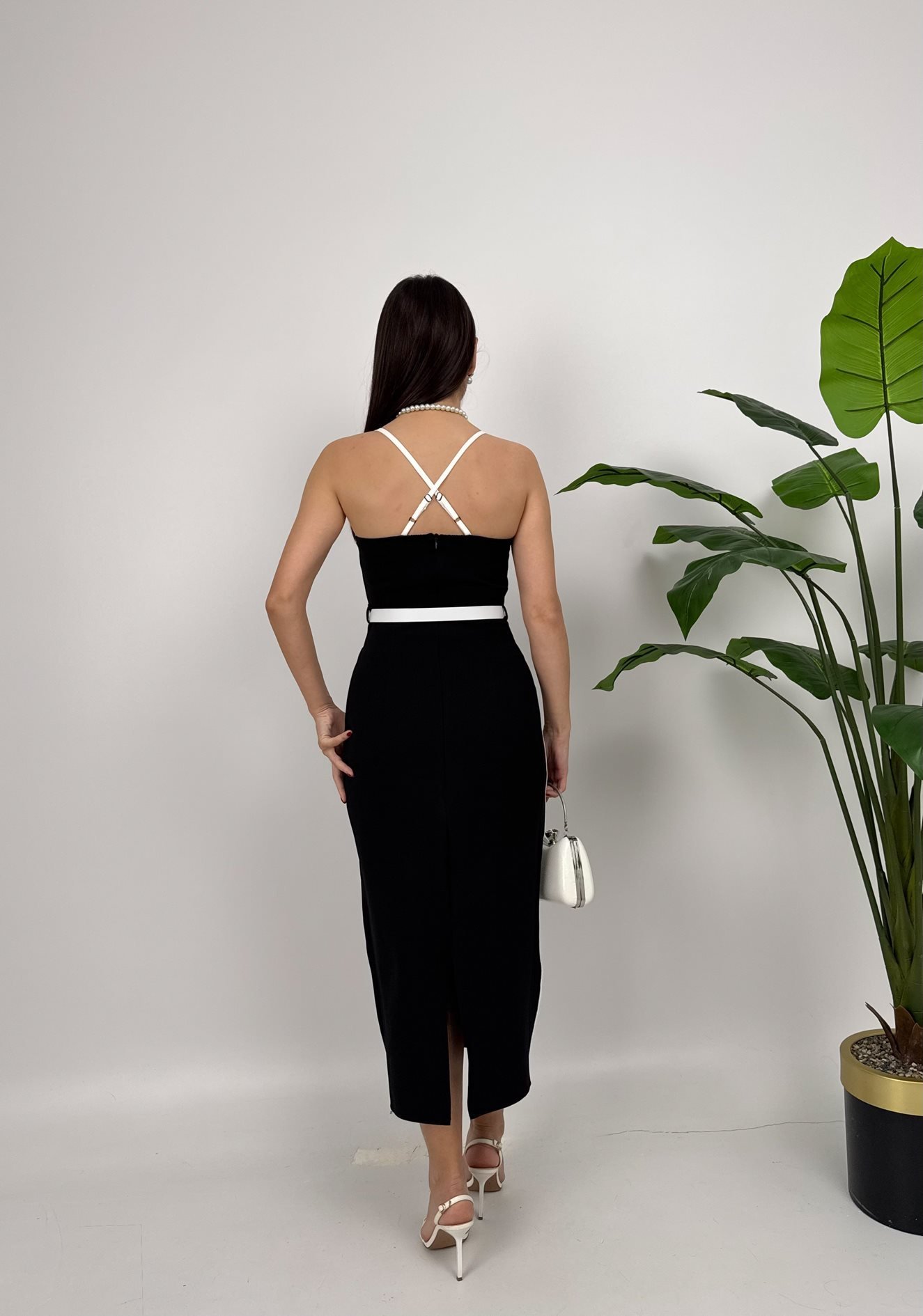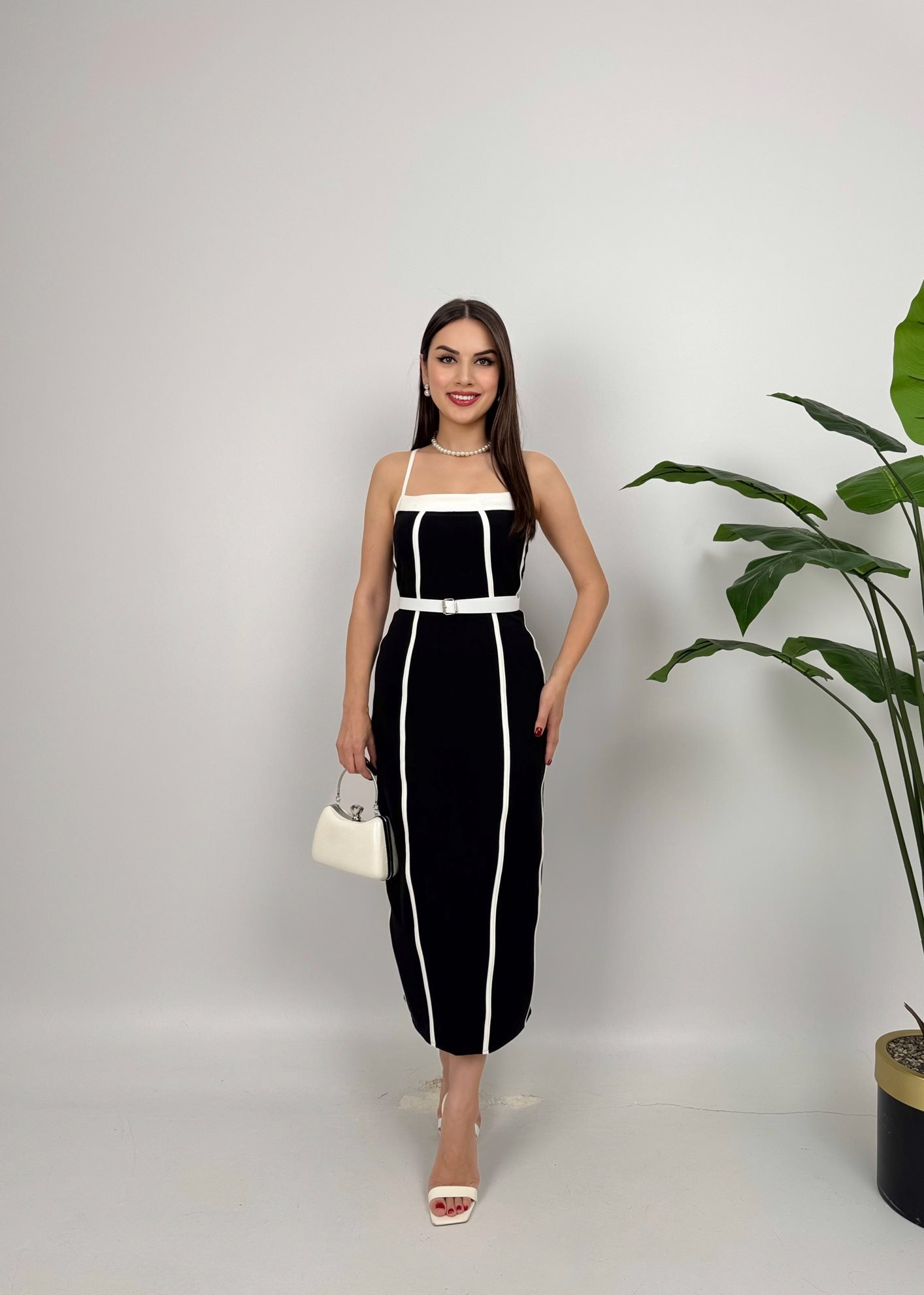 3018 BİYE DETAYLI ELBİSE BLACK - SİYAH