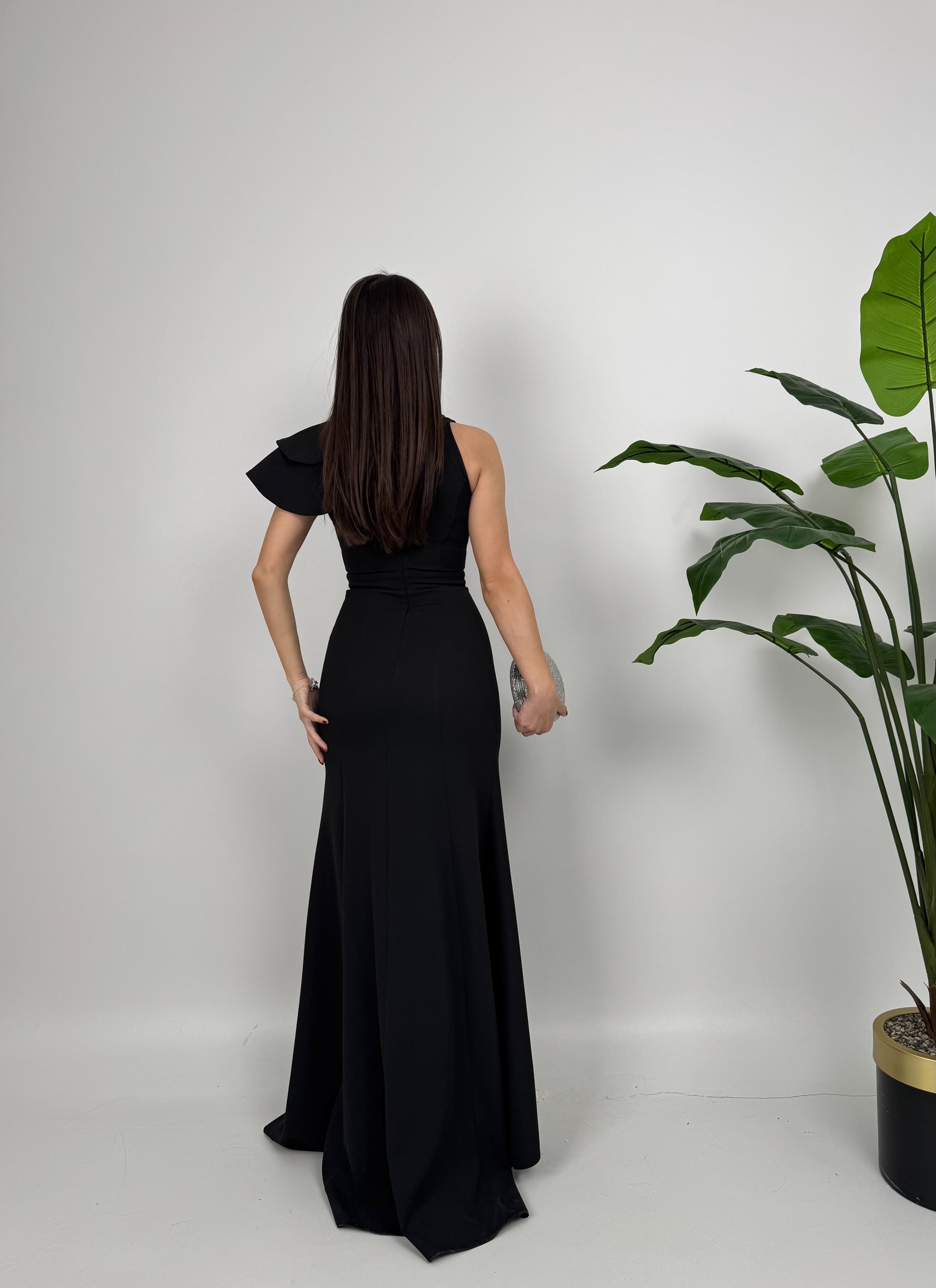 3025 OMUZ FIRFIRLI GÜLLÜ ELBİSE BLACK - SİYAH