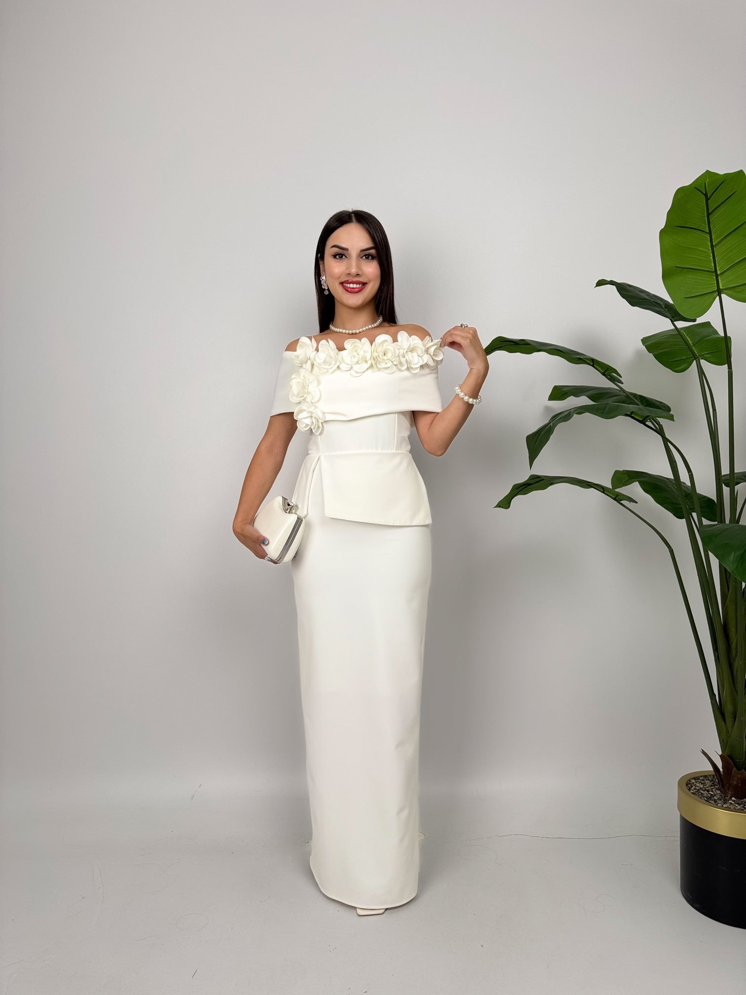 3044 KAYIK YAKA GÜLLÜ ELBİSE WHİTE - BEYAZ