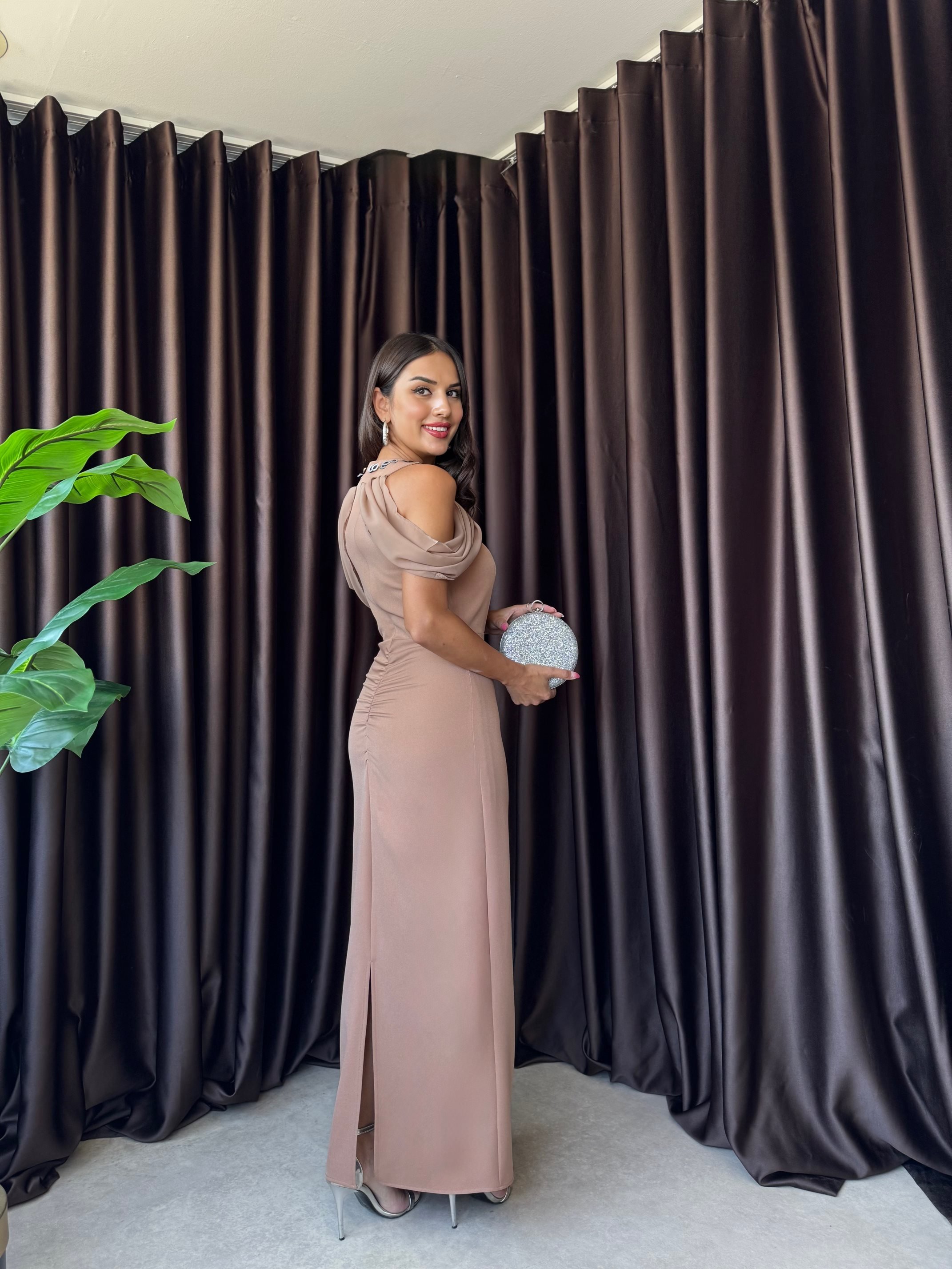 3052 OMUZ DEKOLTELİ ELBİSE MİNK - VİZON