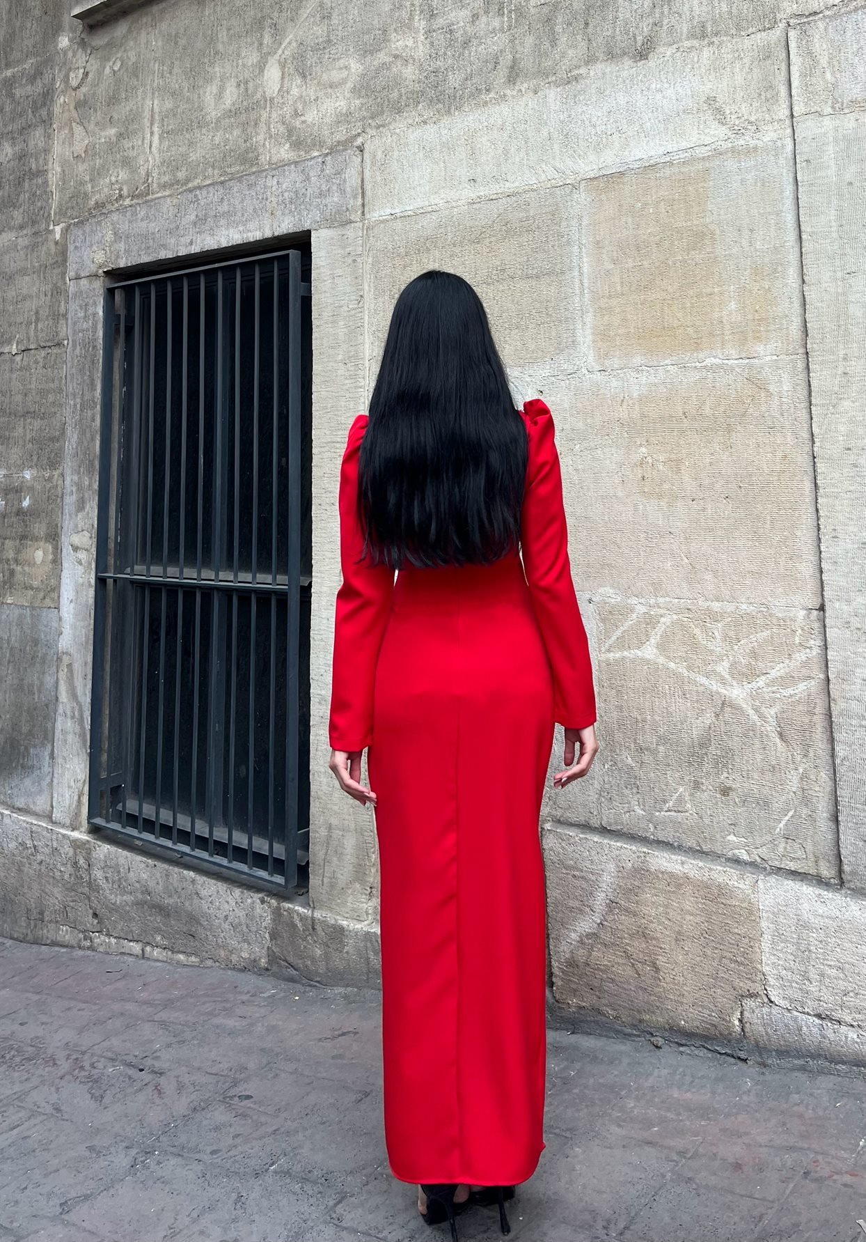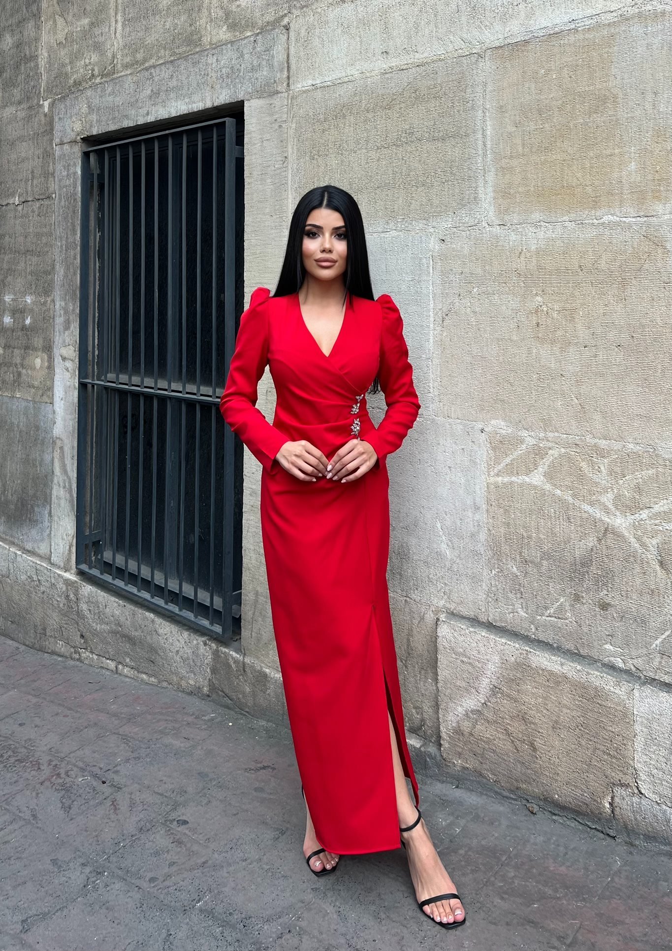 3057 V YAKA AKSESUARLI ELBİSE RED - KIRMIZI