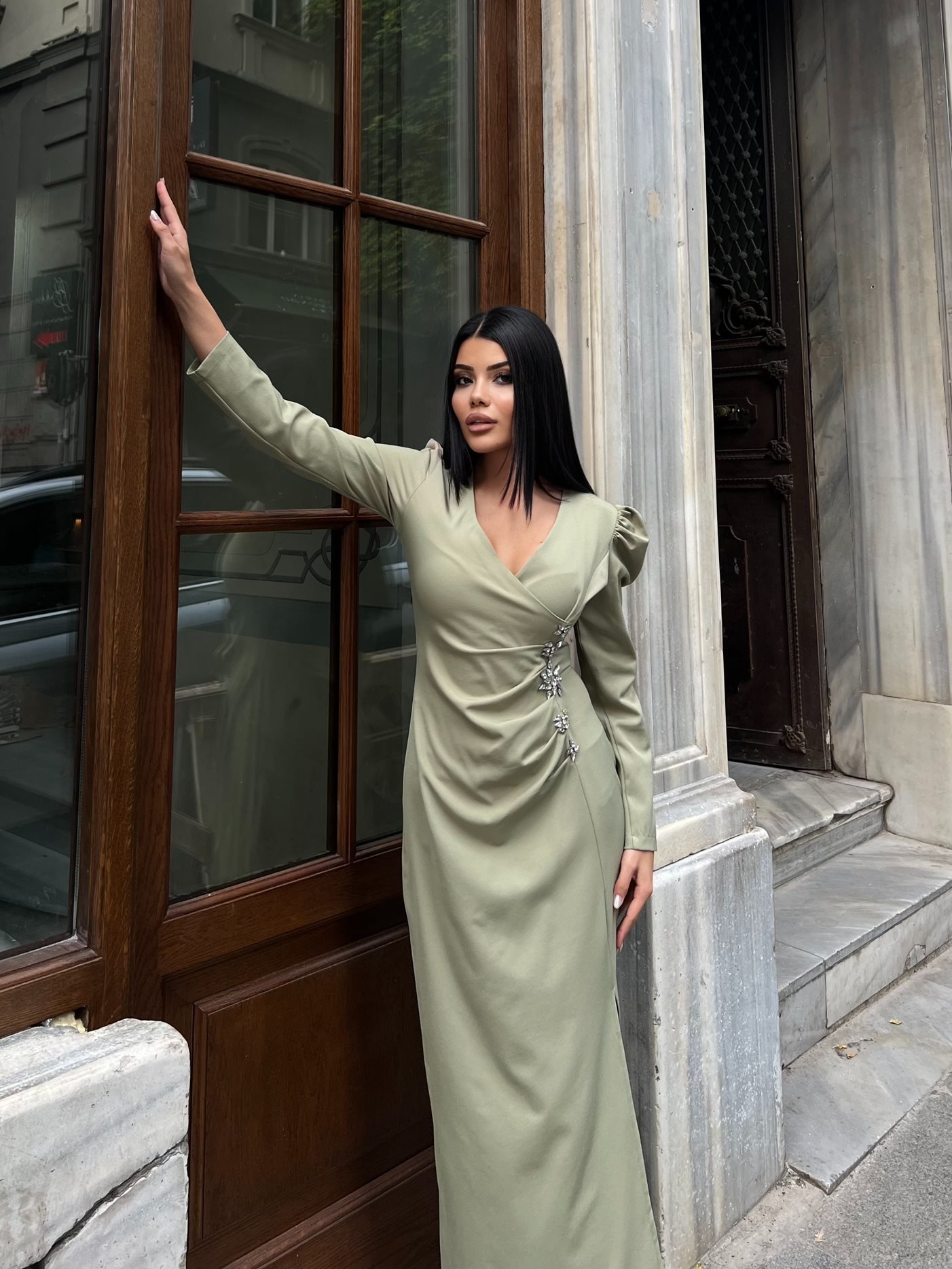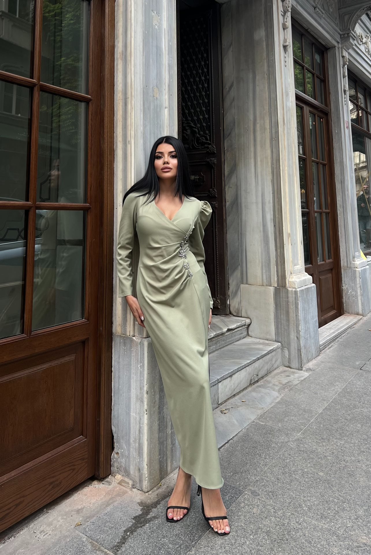 3057 V YAKA AKSESUARLI ELBİSE GREEN - YEŞİL