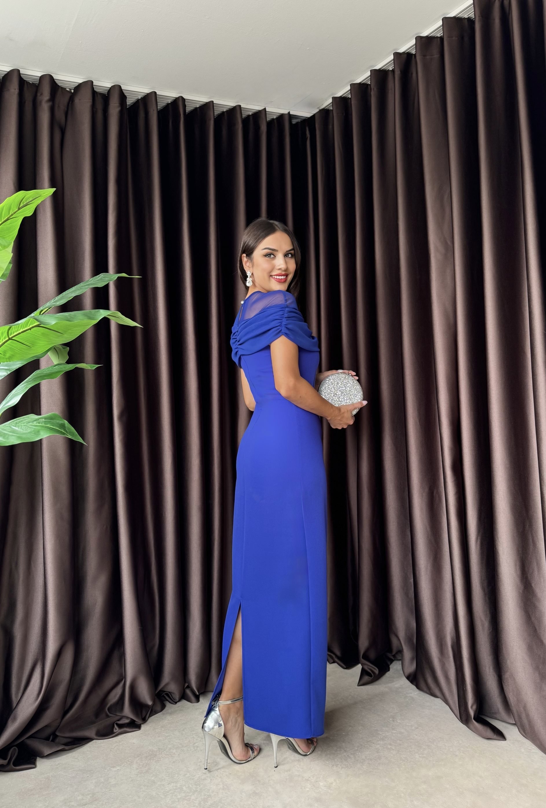 3065 TÜL YAKA AKSESUARLI ELBİSE SAXE - SAX