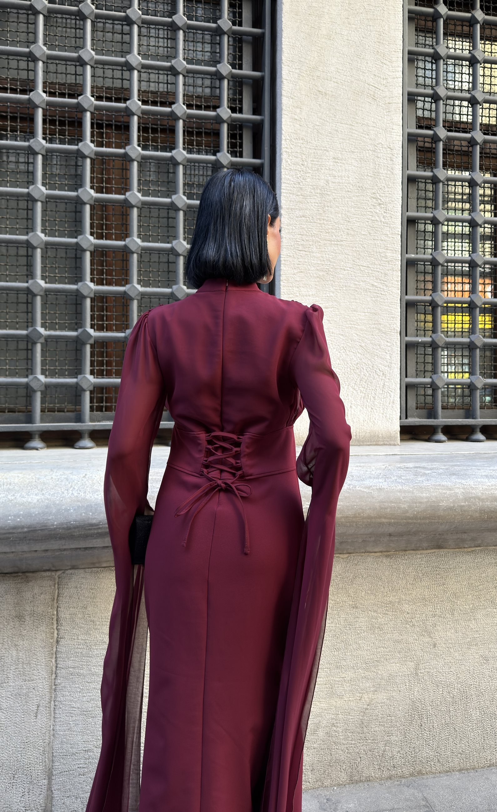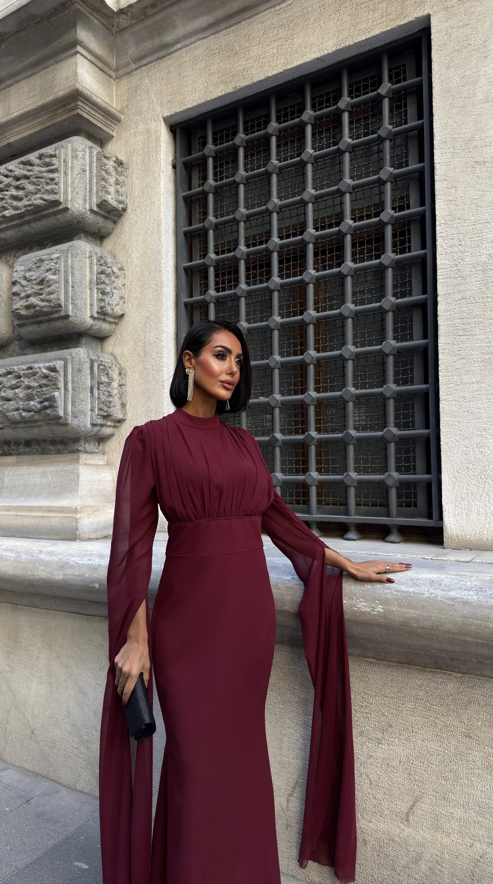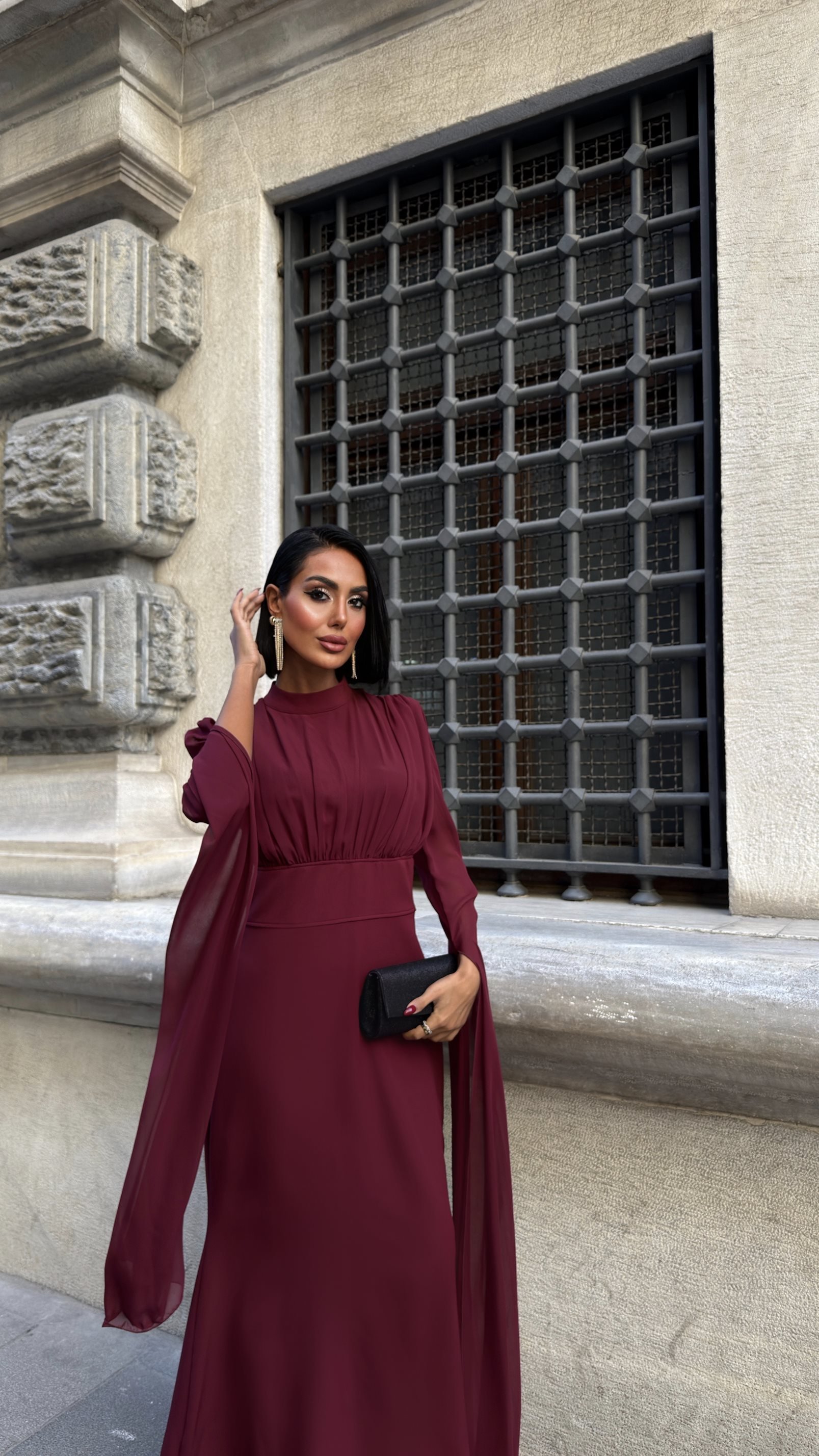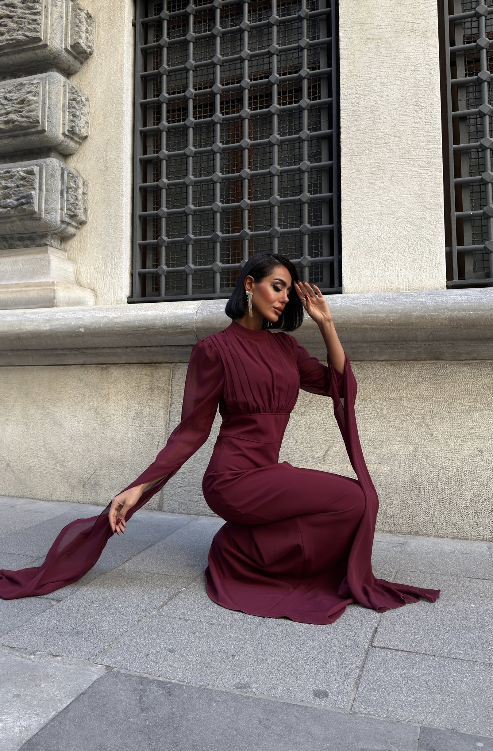3095 KOLLARI ŞİFON ELBİSE BURGUNDY - BORDO