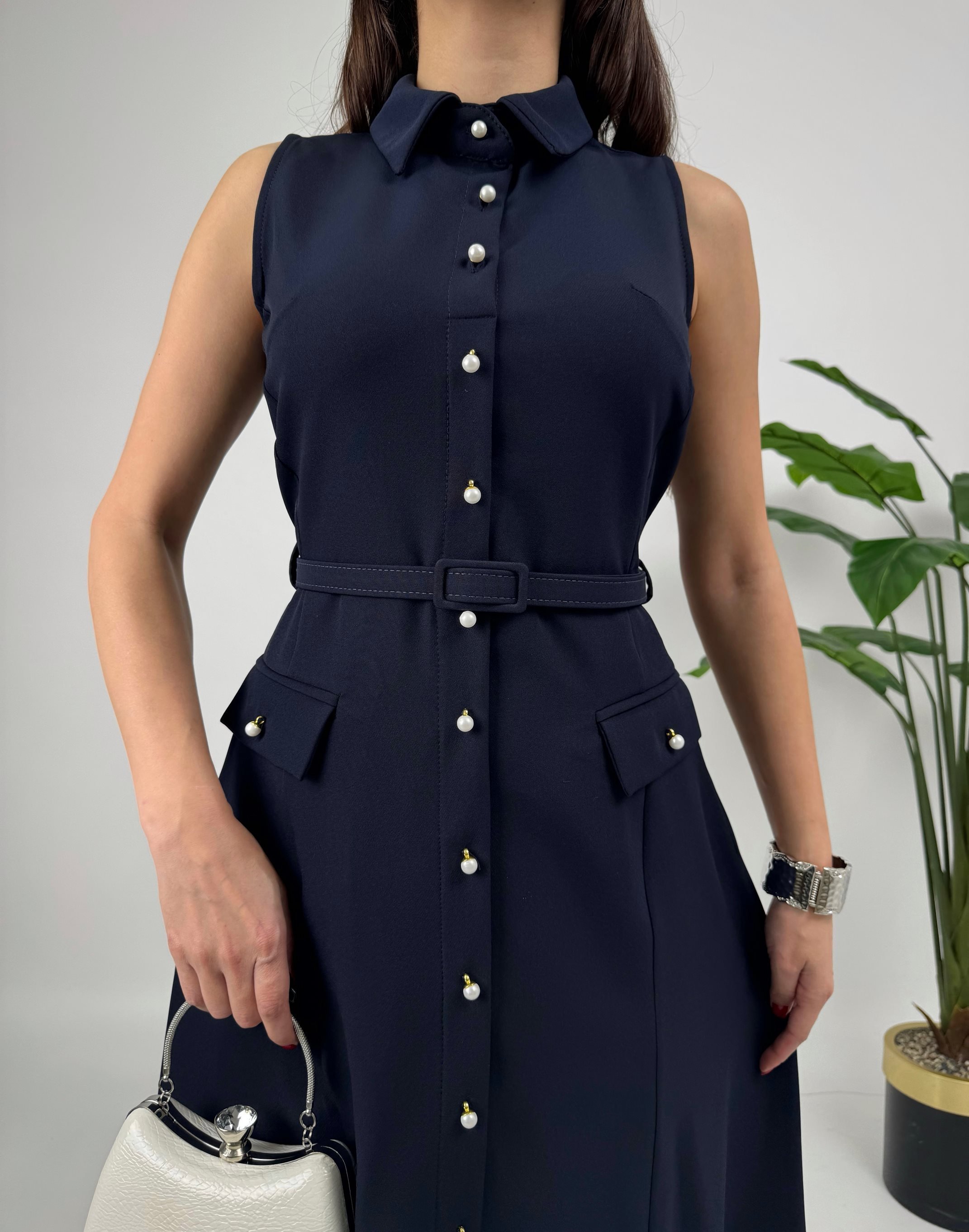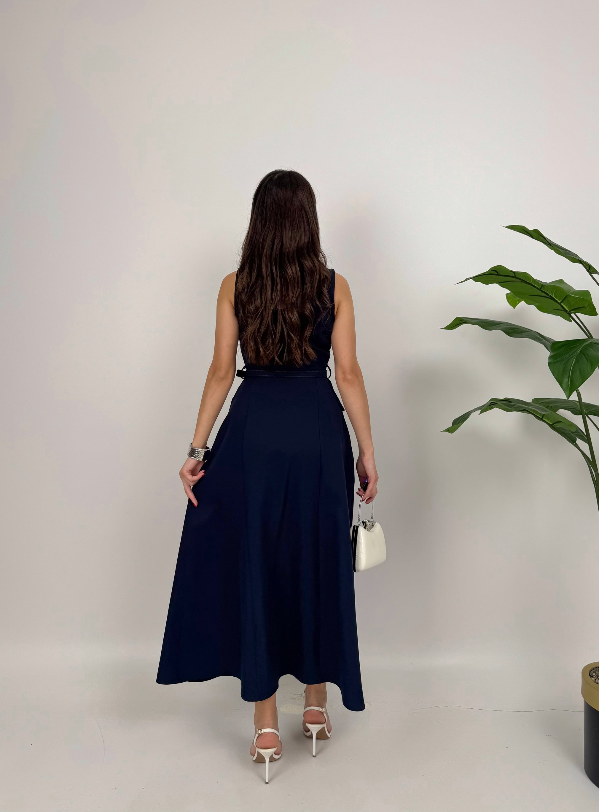 4001 İNCİ DÜĞMELİ KEMERLİ KOLSUZ UZUN ELBİSE NAVY BLUE - LACİVERT