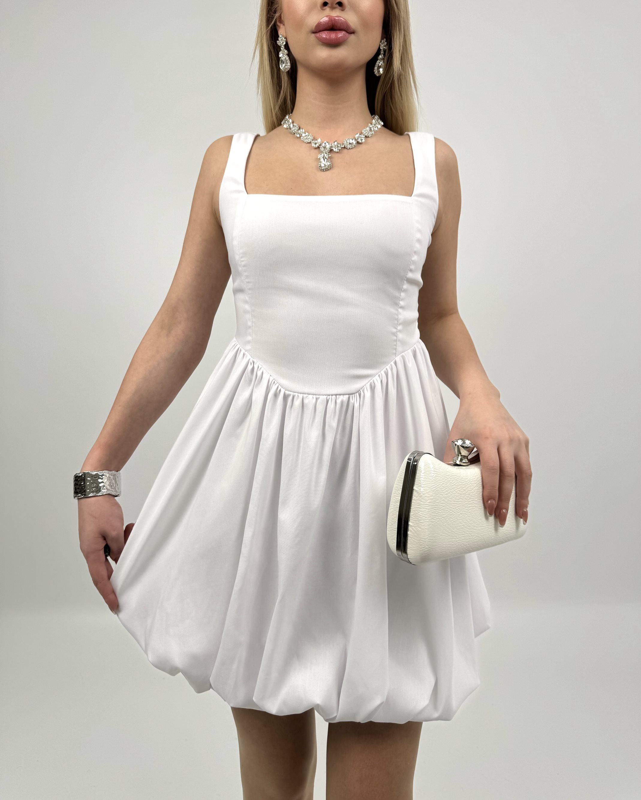 4003 TERİKOTON GİPELİ BALON ELBİSE WHİTE - BEYAZ